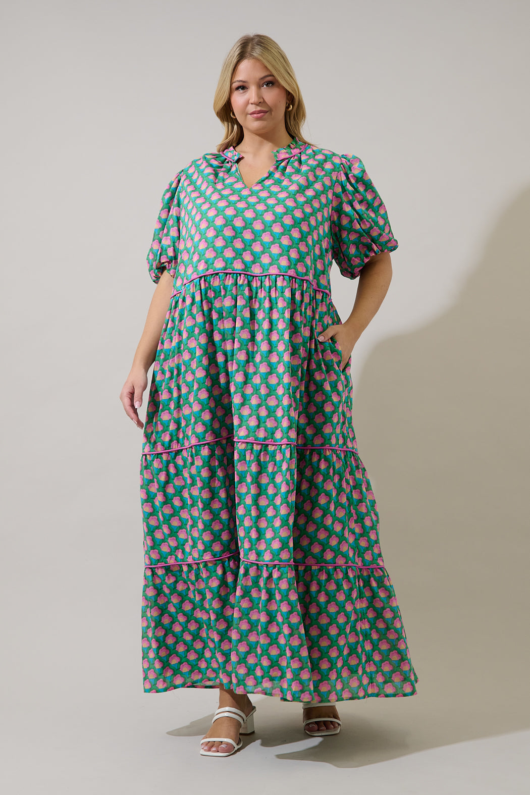 Sweeten your seasonal wardrobe with a perfectly tailored silhouette. Designed with puff sleeves, a split neckline, and a tiered skirt, it flows beautifully with every step. Hidden side pockets add a touch of practicality. Pair it with heels.