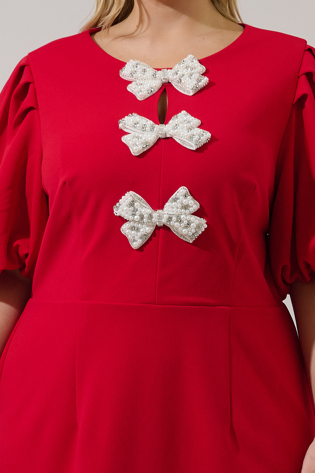 Sweet elegance meets festive charm in this pearl detailed dress. Designed as a flattering mini with short bubble sleeves and a delicate front keyhole, it features standout pearl bows, invisible back zipper, and timeless holiday appeal. Complete the look with sheer tights, heels, and a sparkly clutch for a polished party ensemble.