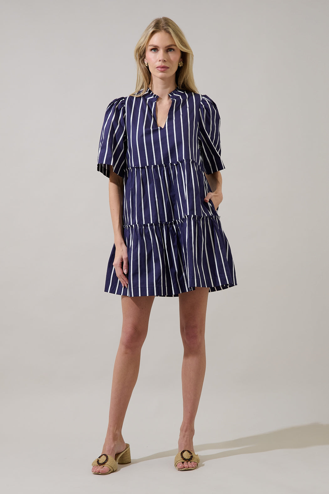 Step out in effortless style with this flirty, breezy dress. Featuring a flattering split neckline and functional pockets, this striped dress combines style and practicality in a bold, easy to wear silhouette. Add your favorite shoes and a bag for a finished look.