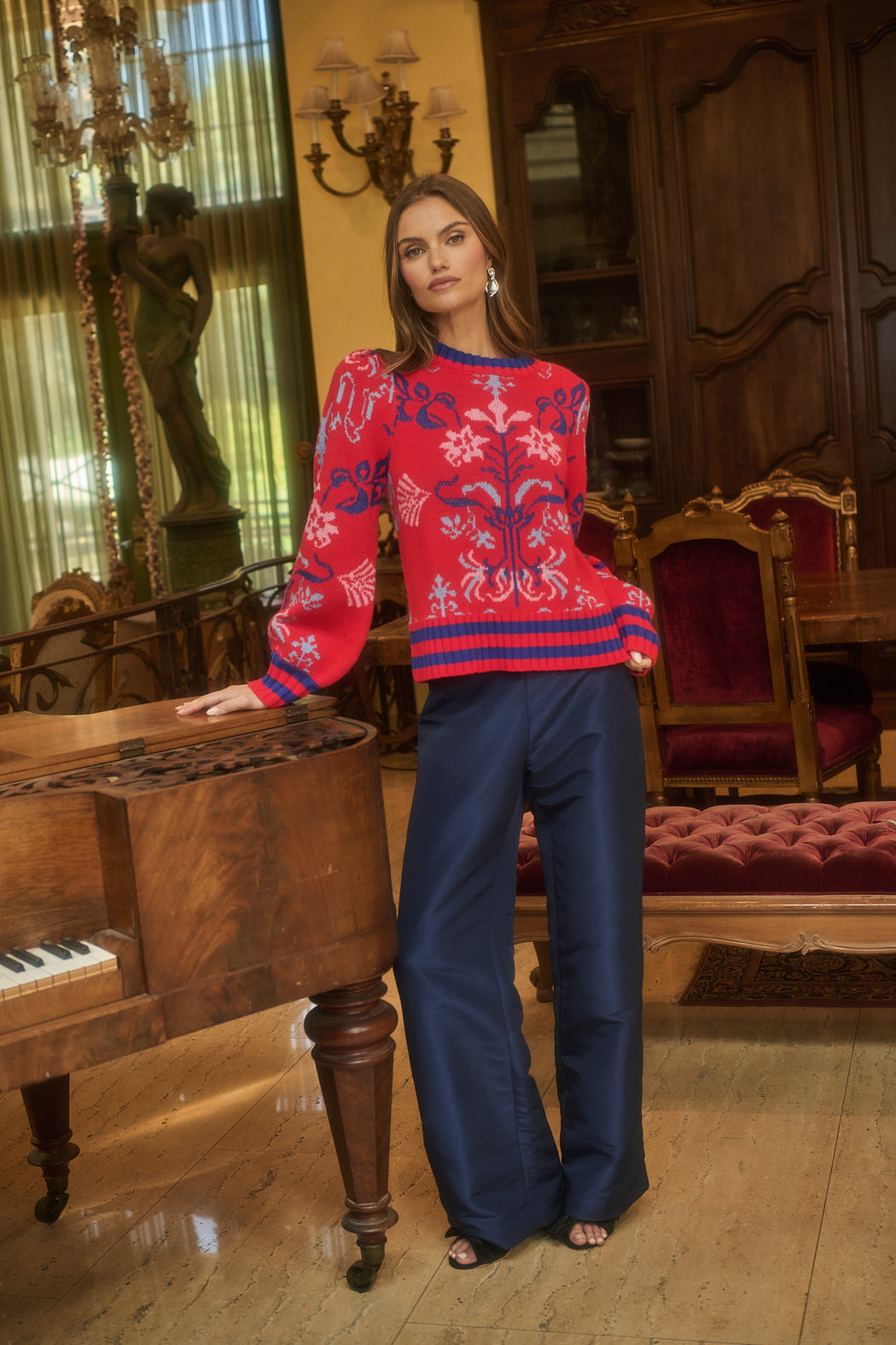 Bring bold energy to your fall and winter wardrobe with this must have sweater. This vibrant sweater features an intricate floral inspired pattern in contrasting pink and blue, oversized long sleeves, and a fitted silhouette. Style with a leather mini skirt, ankle boots, and a sleek crossbody bag for a chic, modern vibe.