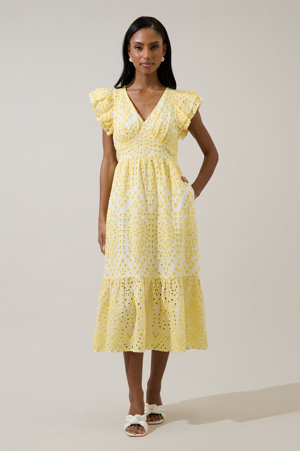 Refresh your wardrobe with this stylish, must-have At Sea Eyelet Zayla Midi Dress. A blue and white eyelet design shape this dress as it features short ruffle cap sleeves followed by a deep v-neckline. Wear it with chunky heels.