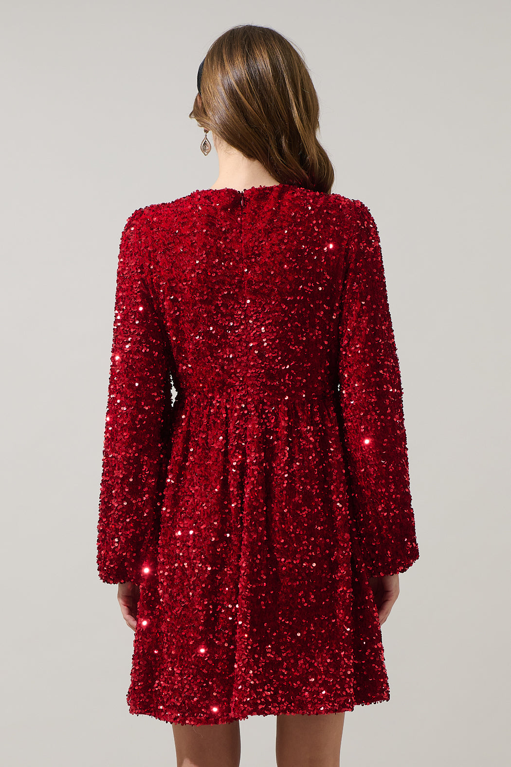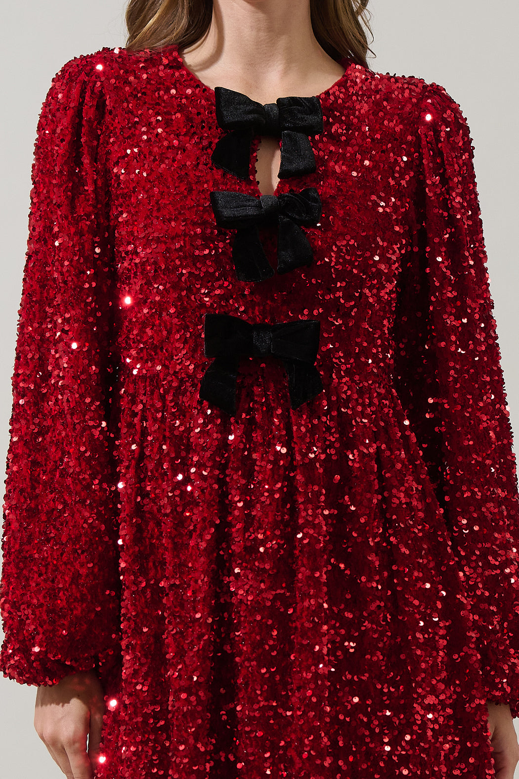 Bring the sparkle with a look that’s equal parts sweet and striking. Composed of stretchy velvet fabric that shapes long sleeves, a round neckline, and a princess-seamed bodice adorned with cute bow-inspired details and flirty keyhole cutouts at the center, all finished with a sequin touch that adds festive shine. Style it with statement earrings and heeled boots for a chic holiday-ready look.