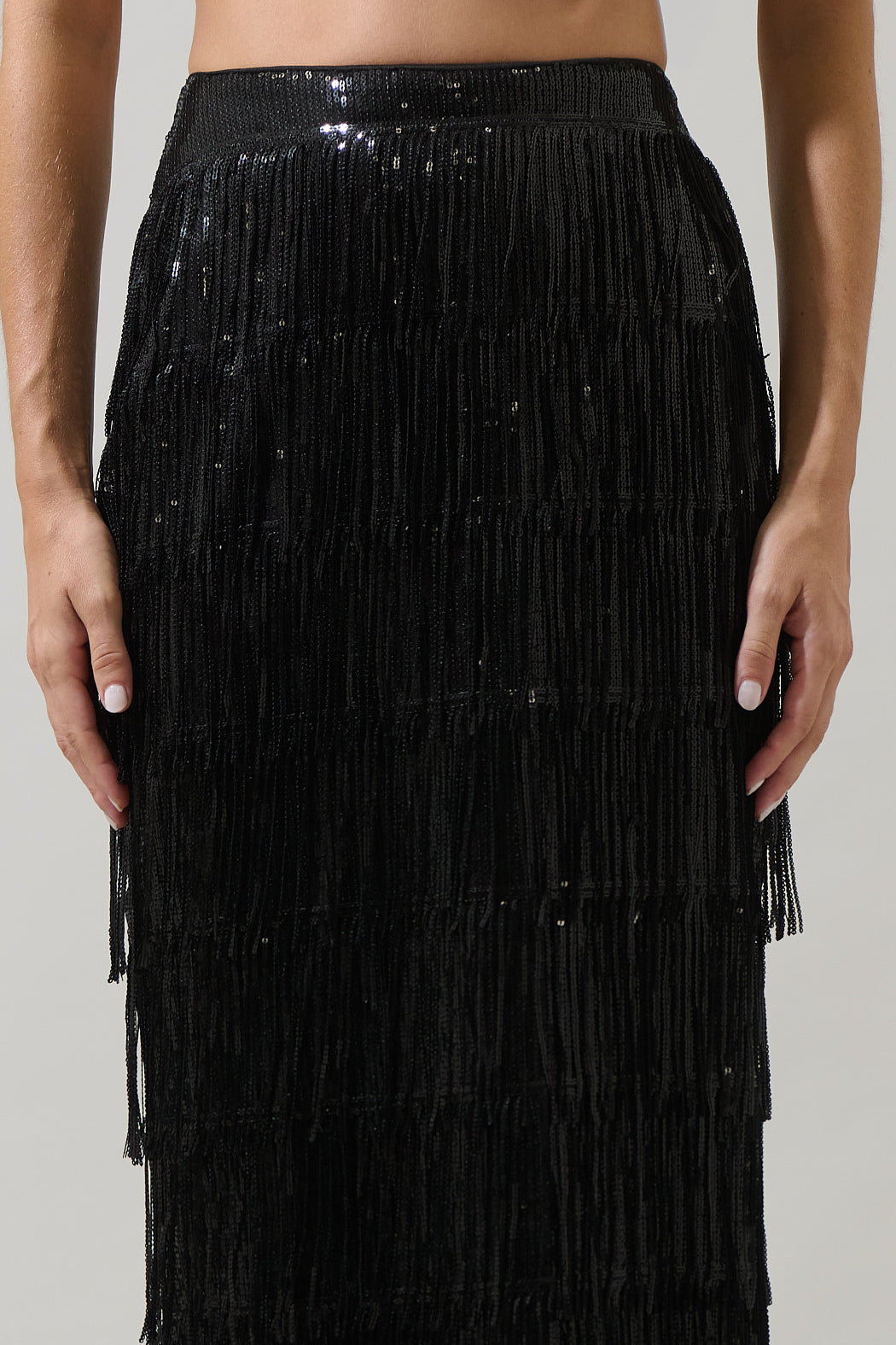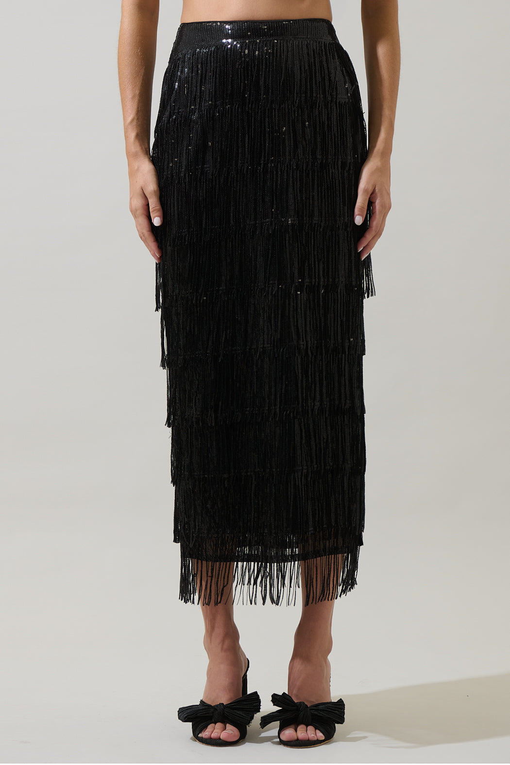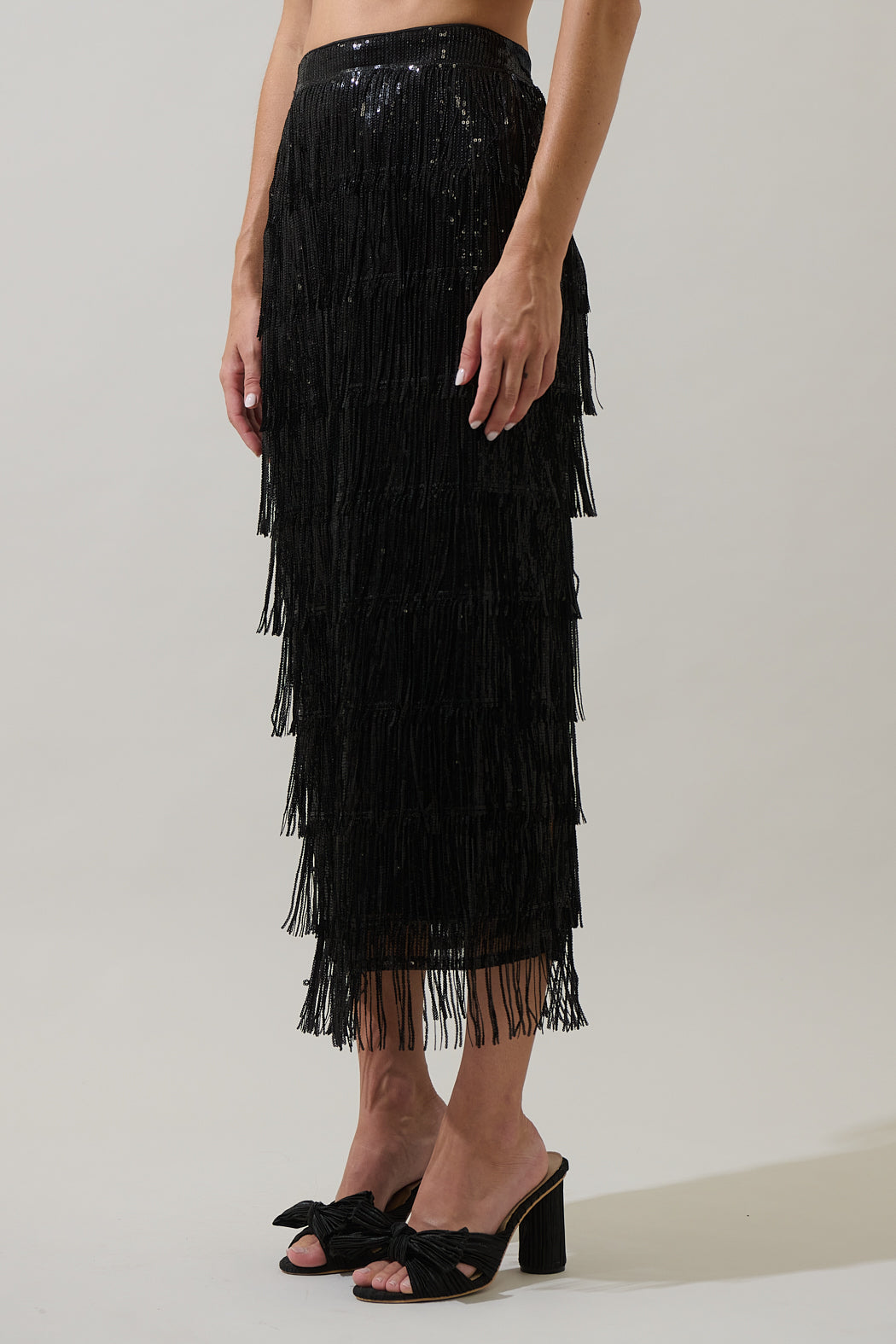 Sparkle and shine all night! This is the piece everyone will notice first. This maxi skirt features sequined tassels, a tiered design, an invisible side zipper, and a chic side slit for effortless movement. Pair with a cozy sweater and strappy bow heels for a chic, party ready look.