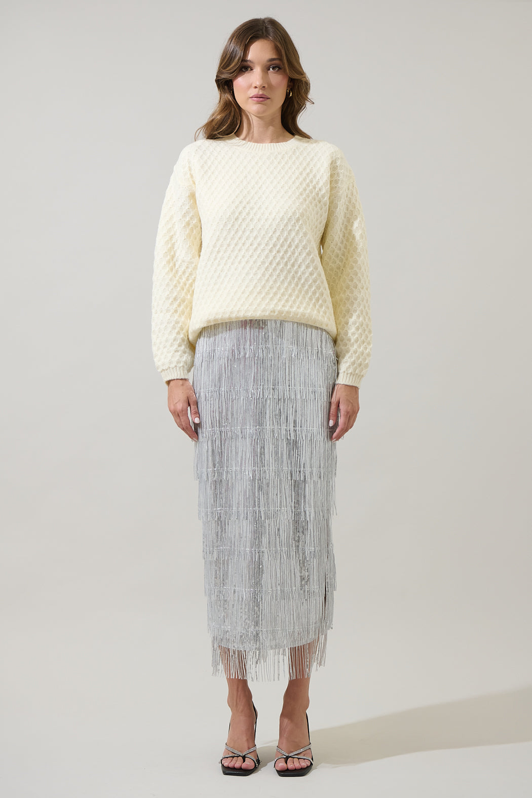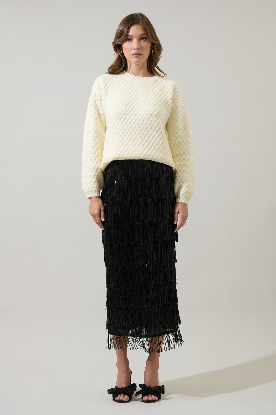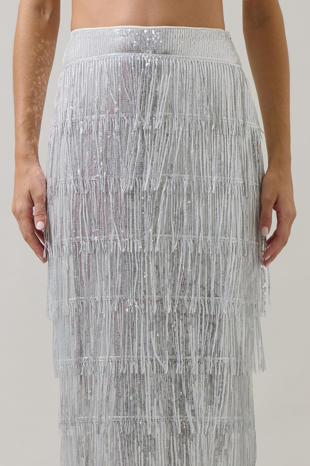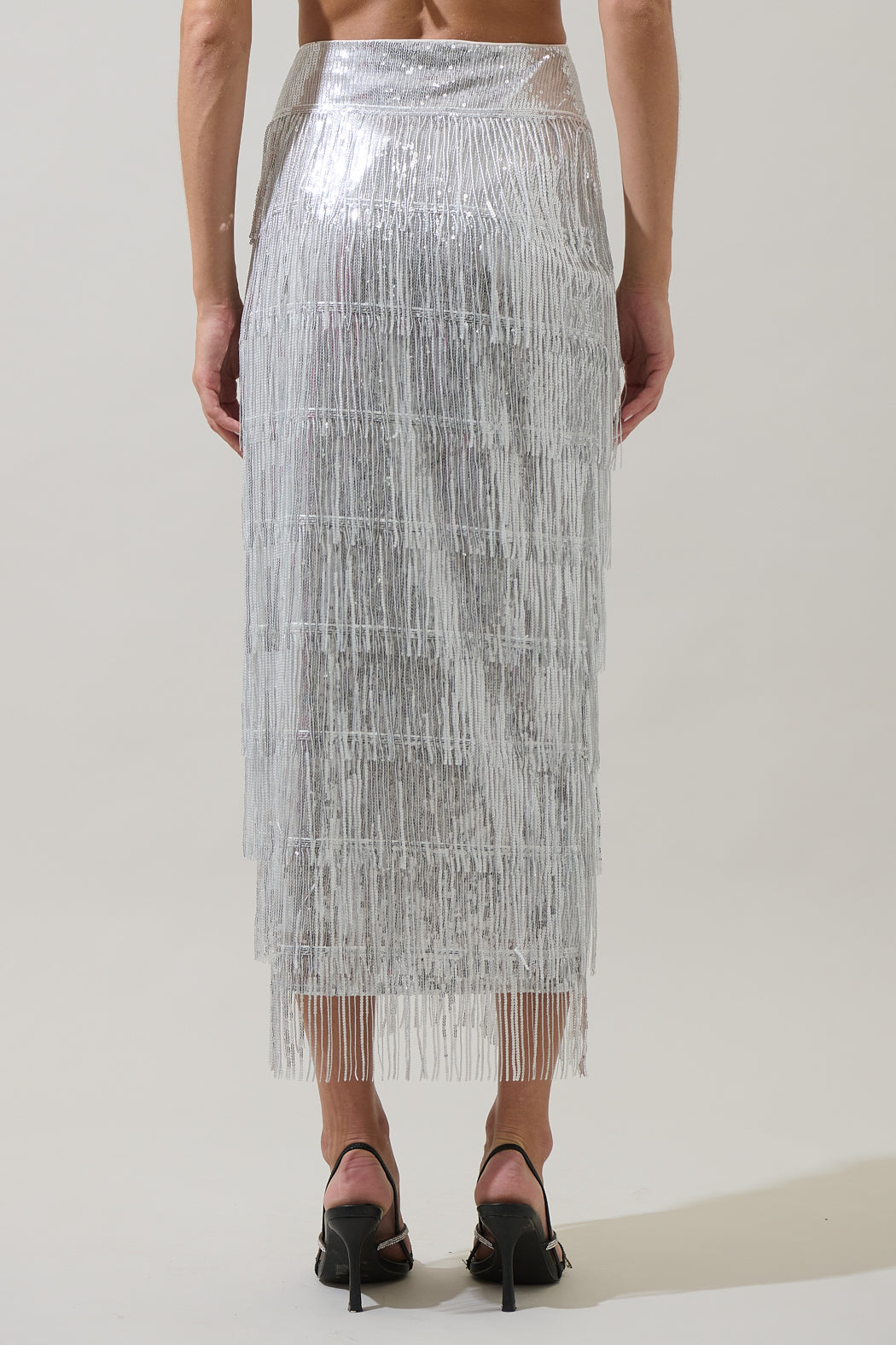 Sparkle and shine all night! This is the piece everyone will notice first. This maxi skirt features sequined tassels, a tiered design, an invisible side zipper, and a chic side slit for effortless movement. Pair with a cozy sweater and strappy bow heels for a chic, party ready look.