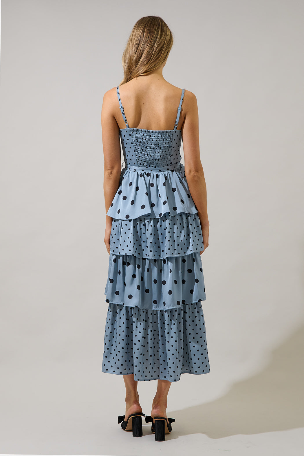 We've got your covered for your next daytime event. This charming light blue midi dress features an elegant tiered silhouette and a classic polka dot pattern. Designed with a structured belted waist, adjustable spaghetti straps, and a daring thigh high slit. Just add on heels and accessories.