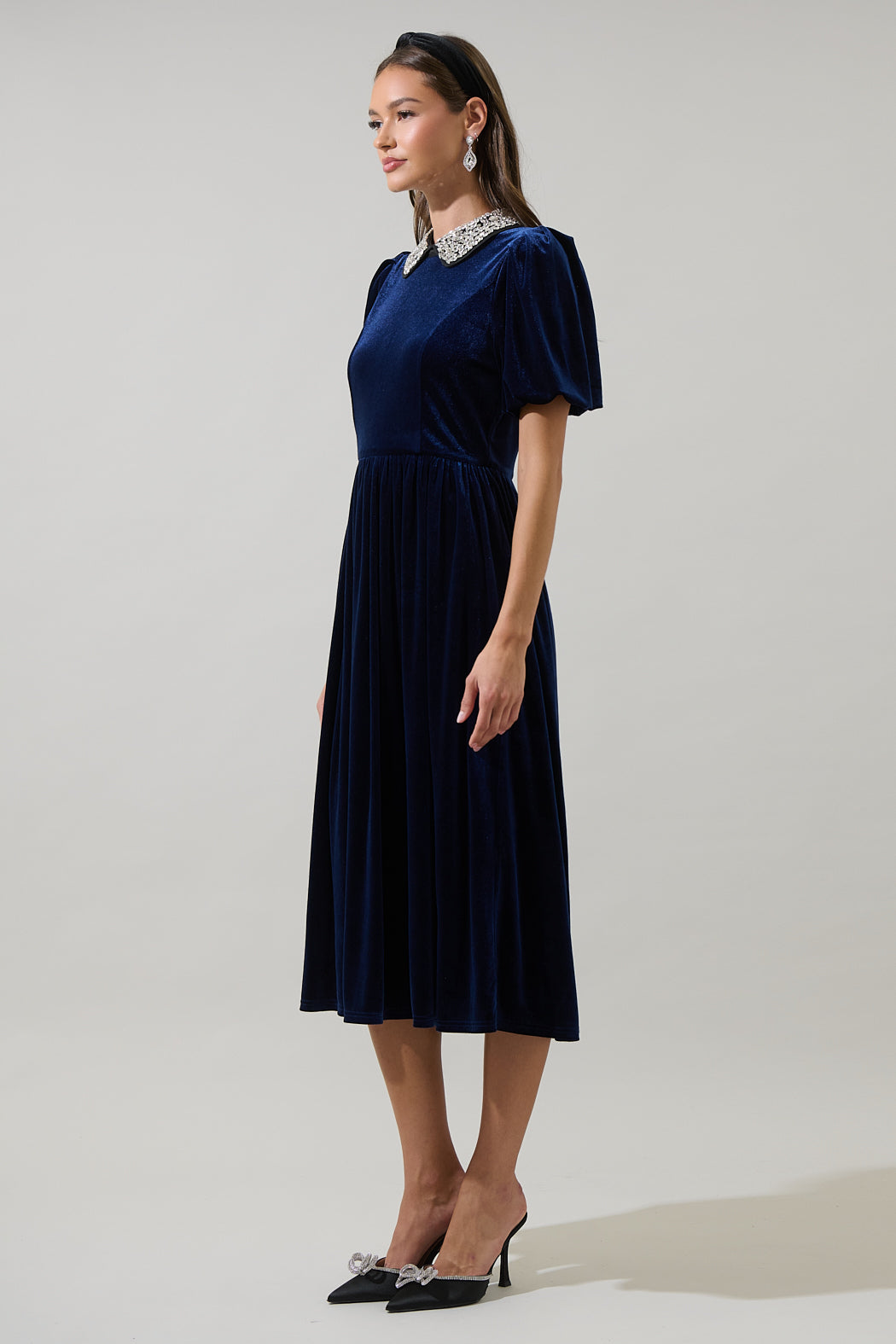 Elevate your evening with a dress that captures all eyes and hearts. This velvet midi dress features a sparkling rhinestone collar, short balloon sleeves, and an invisible back zipper for a seamless fit. Style it with pointed heels and a metallic clutch for timeless elegance. Add delicate jewelry to complete your sophisticated look.