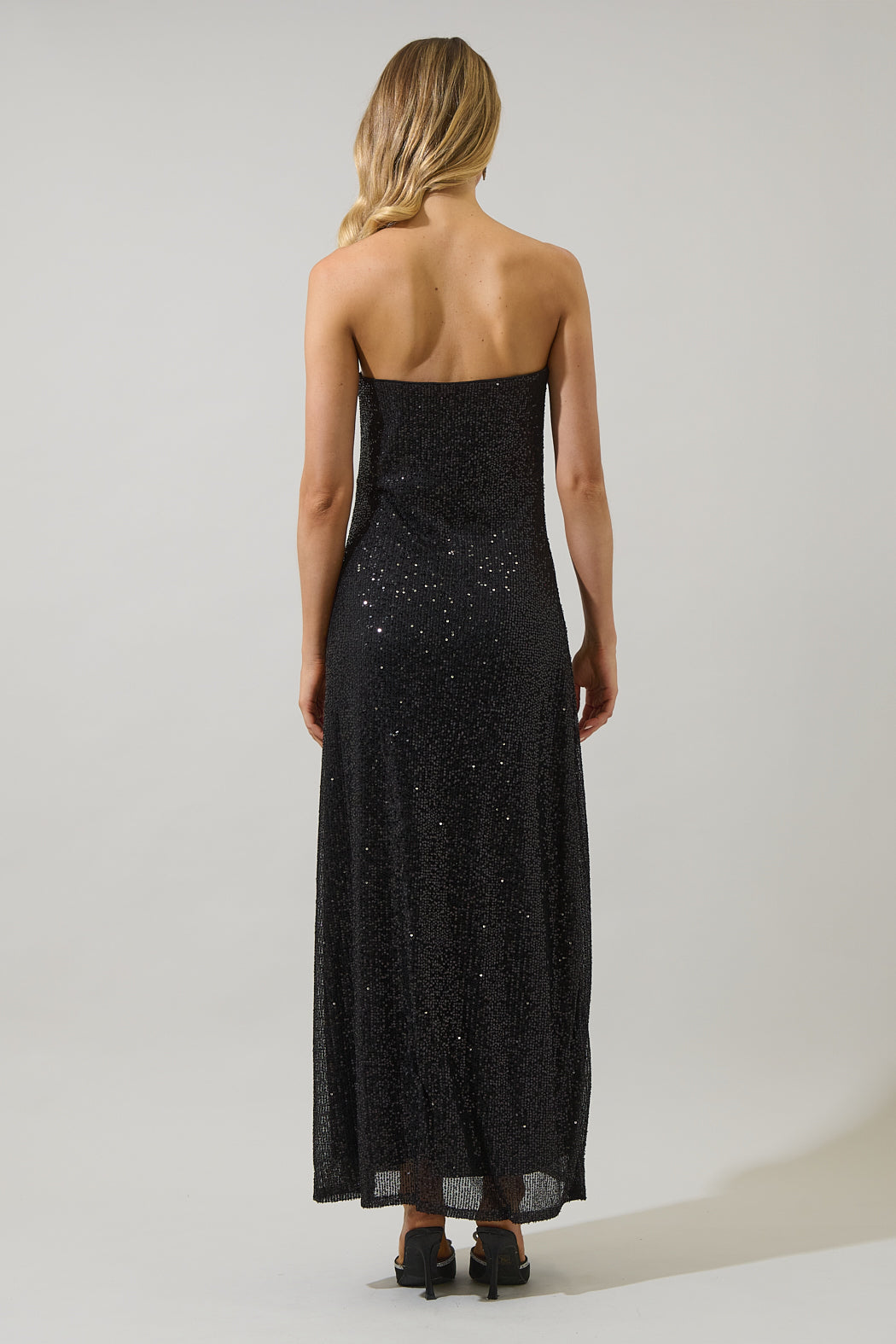 Shine with confidence in a dress designed to make every entrance unforgettable. This strapless sequin maxi dress is fully lined with a side invisible zipper for a flawless fit, making it the ultimate party ready piece. Pair it with metallic heels and a sleek clutch to complete your dazzling look.