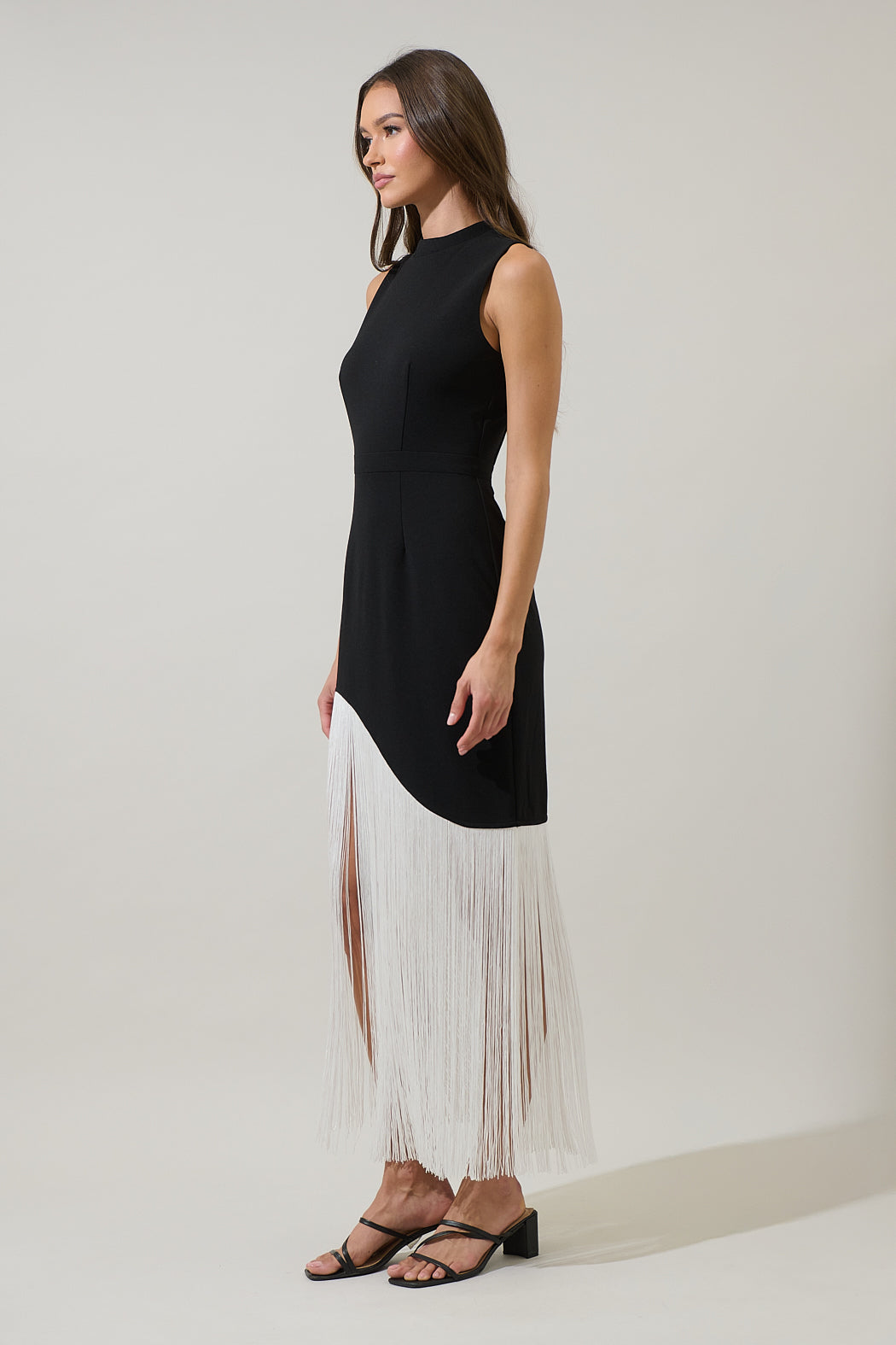 Drape yourself in timeless elegance with a modern twist of fringe and sleek design. This sleeveless maxi dress features a striking color contrast fringe hem, a flattering self waistband, and a discreet back invisible zipper. Perfect for upscale events or nights out. Pair it with sleek black stilettos, a minimalist clutch, and statement earrings to complete the look.