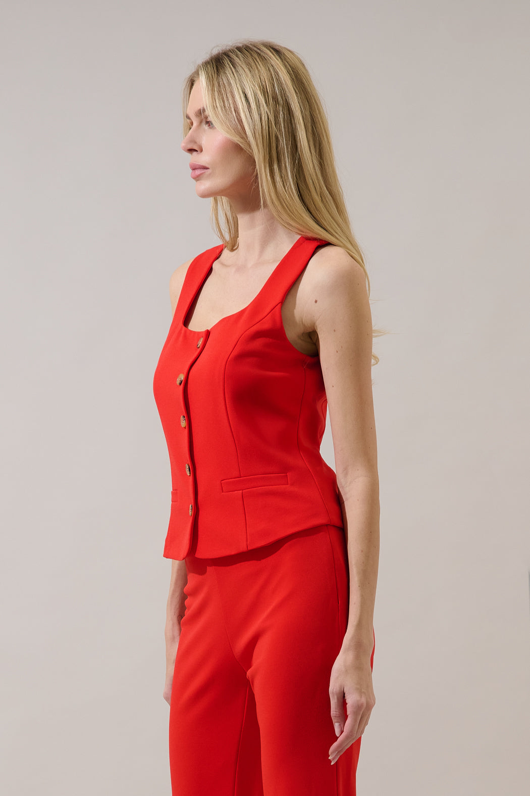 Turn heads instantly in this bold top. Featuring a square neckline and a classic button-front detail. Subtle seam detailing and a slightly peplum style hem create a waist defining silhouette. Perfect for dressing up with matching trousers.