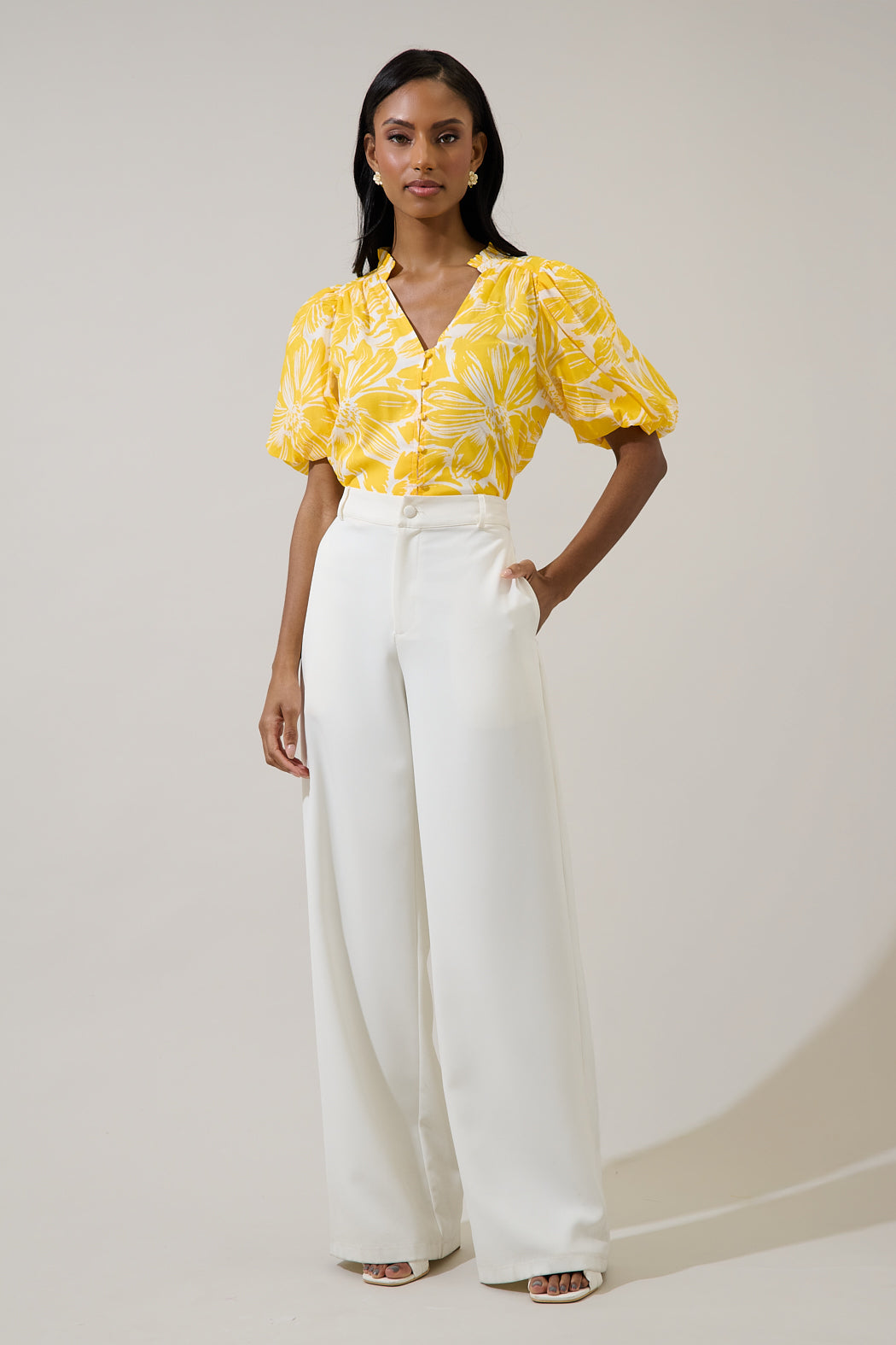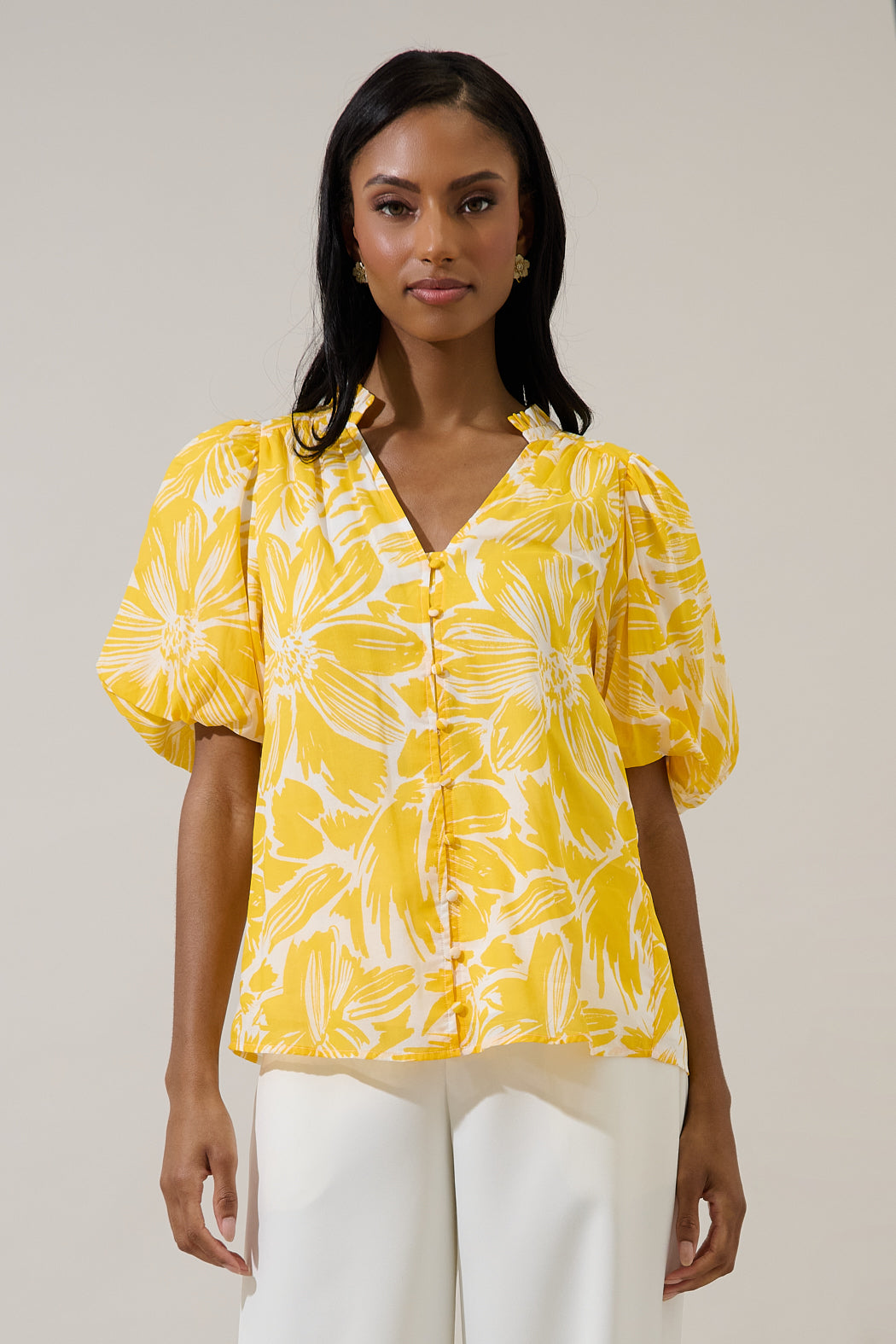 Sweet, sunny, and blooming with charm; just like you! Designed with florals, it features short bubble sleeves, a split ruffle neckline, and a button down front for a soft feminine touch. Style it with denim and a crossbody bag for a chic everyday look.