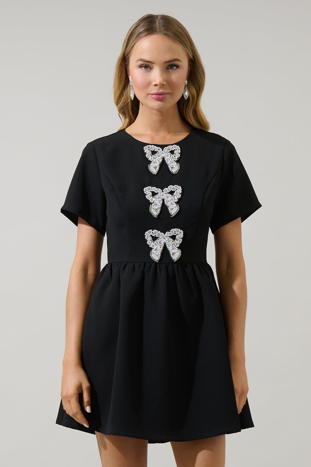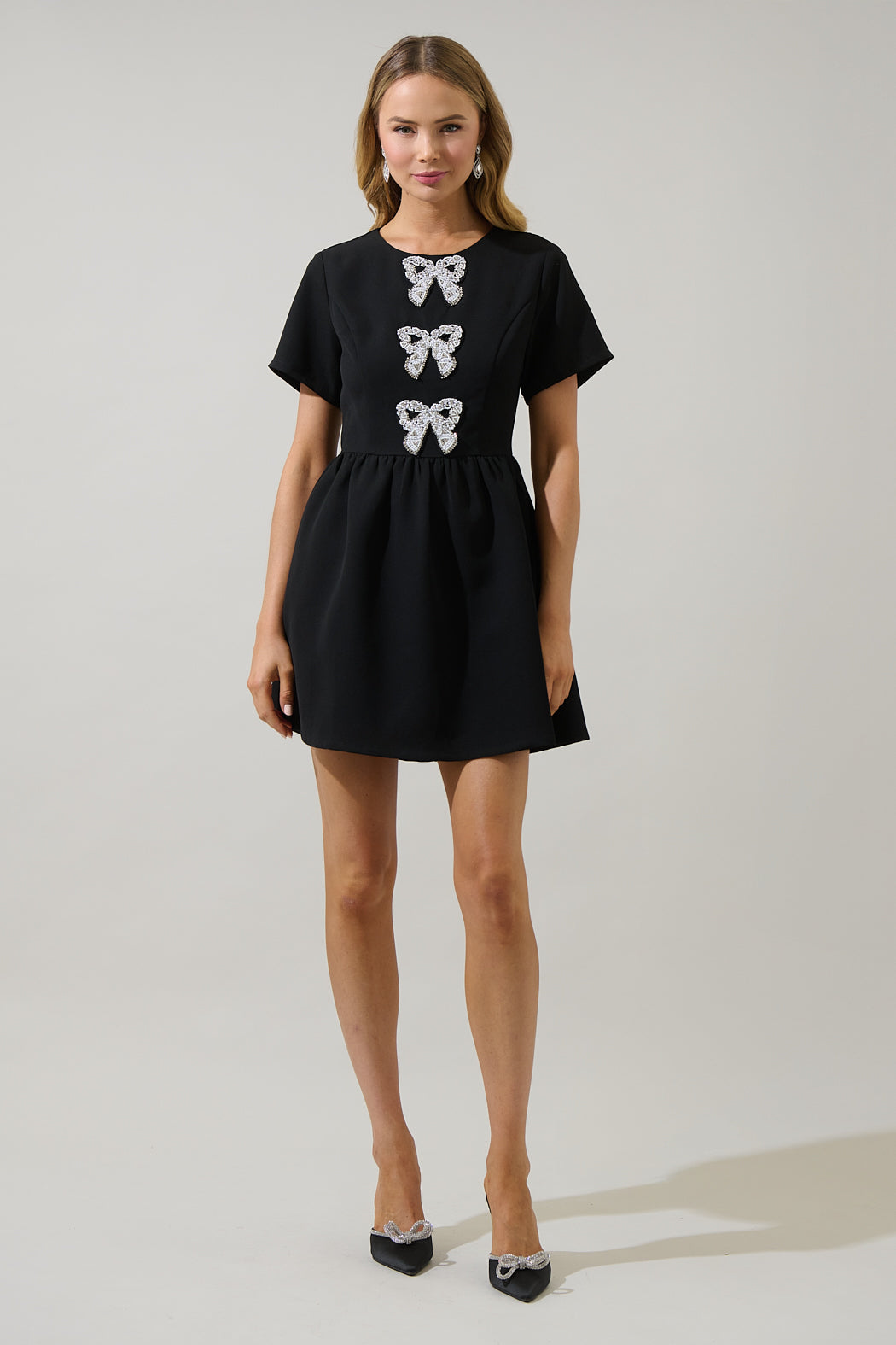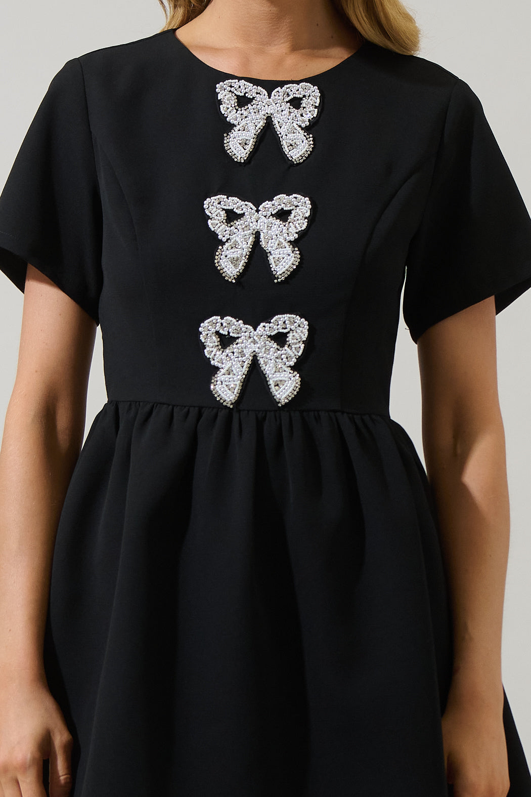 Turn everyday moments into photo ready style with a dress that pops. Featuring short sleeves, three eye catching beaded bows at the front, and an invisible back zipper, this mini dress is pure fun and glam. Style with block heels and a statement clutch for a head turning outfit.