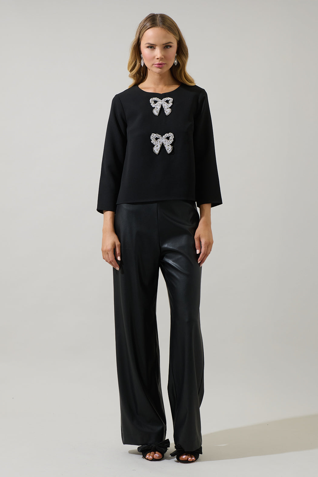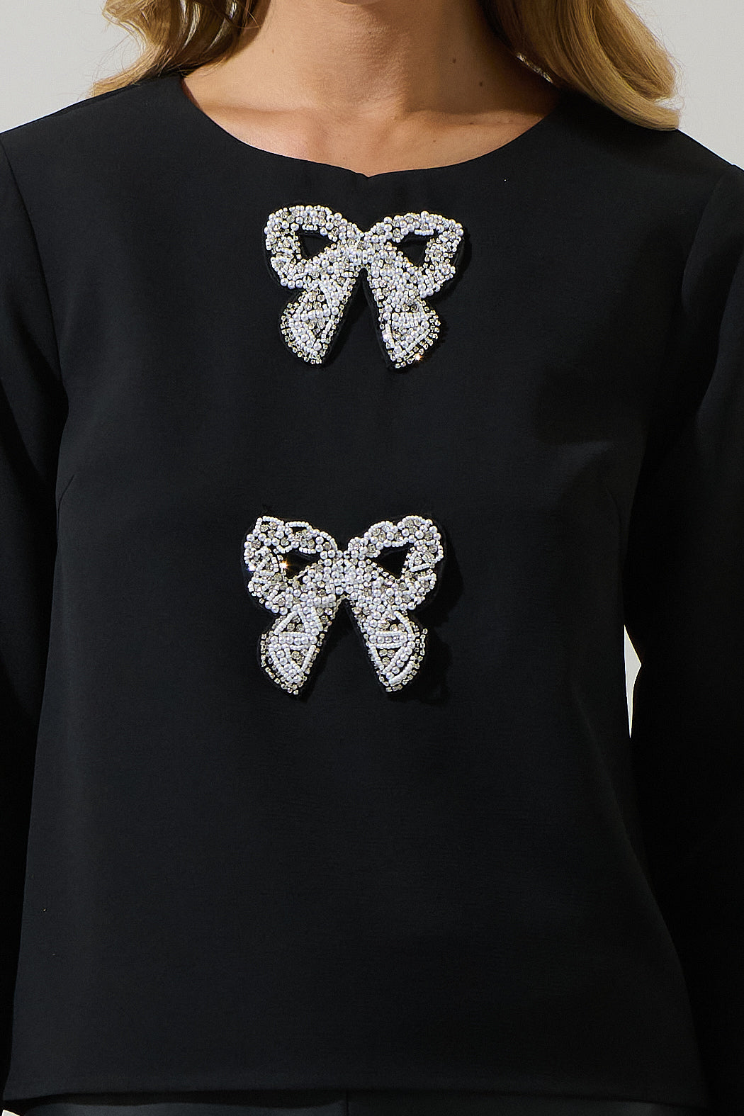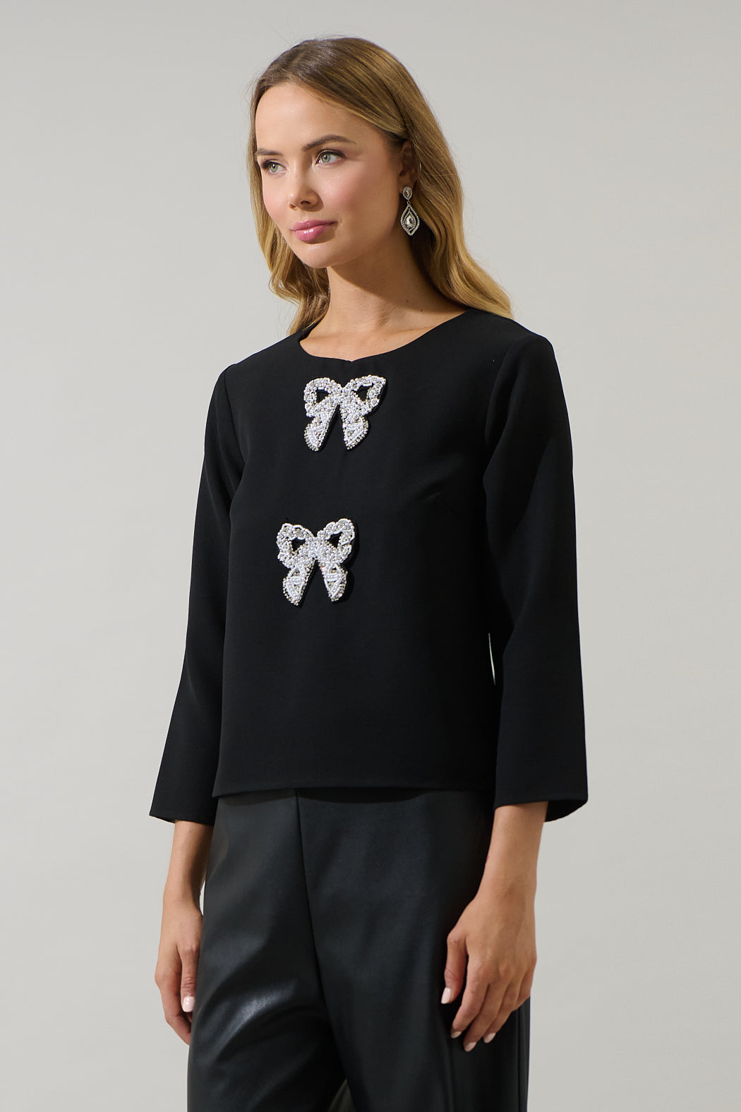 Own every outfit with a top that blends charm and edge. Designed with 3/4 sleeves, two beaded bows at the front, and a back invisible zipper, it’s perfect for standout style. Style with leather pants and block heels or a tailored skirt and crossbody for instant polish.