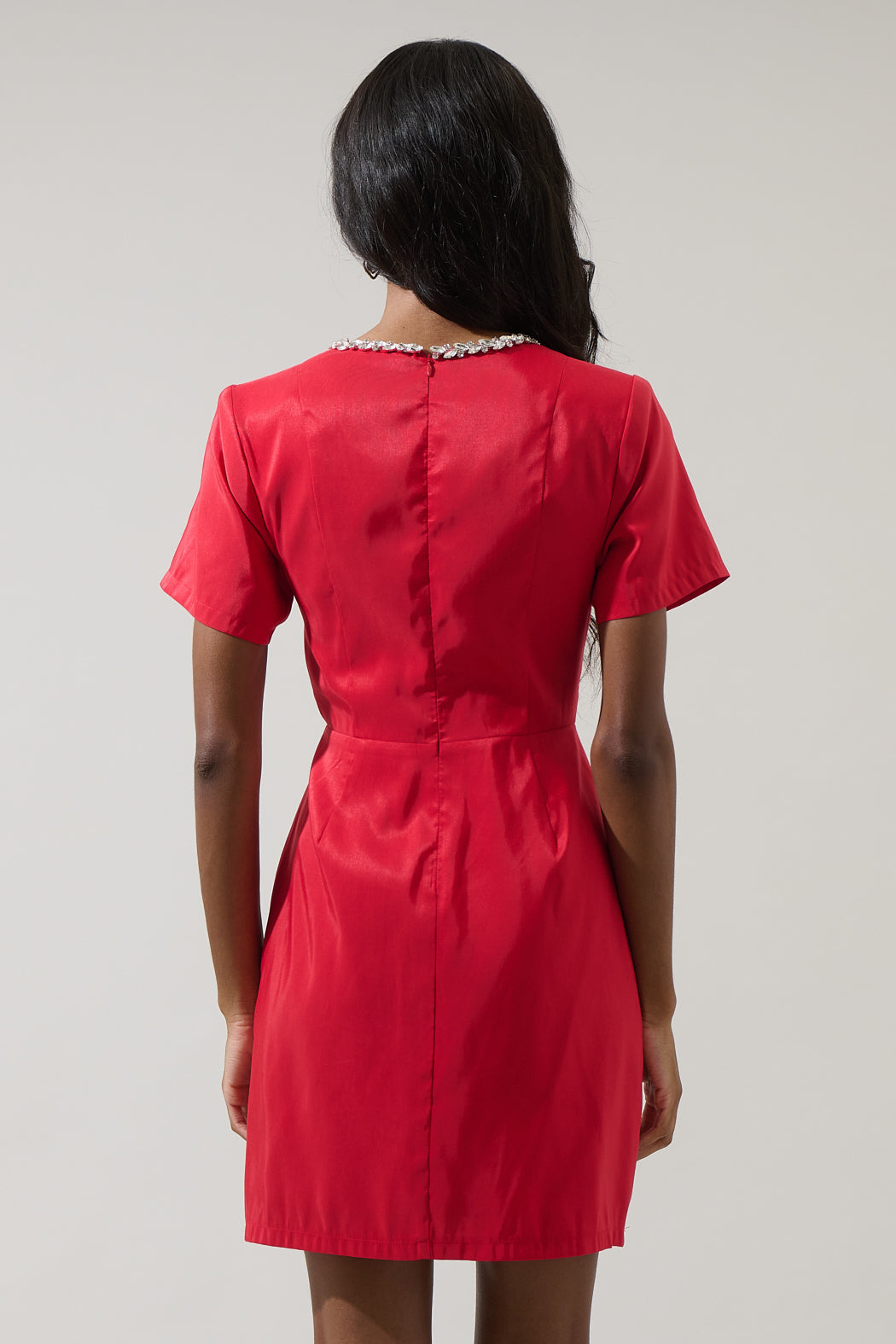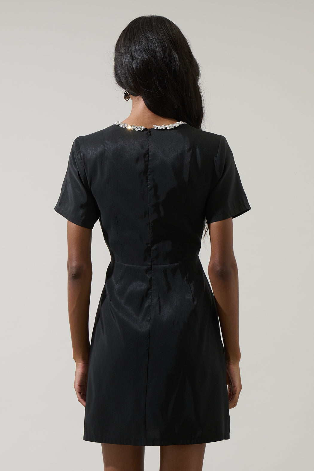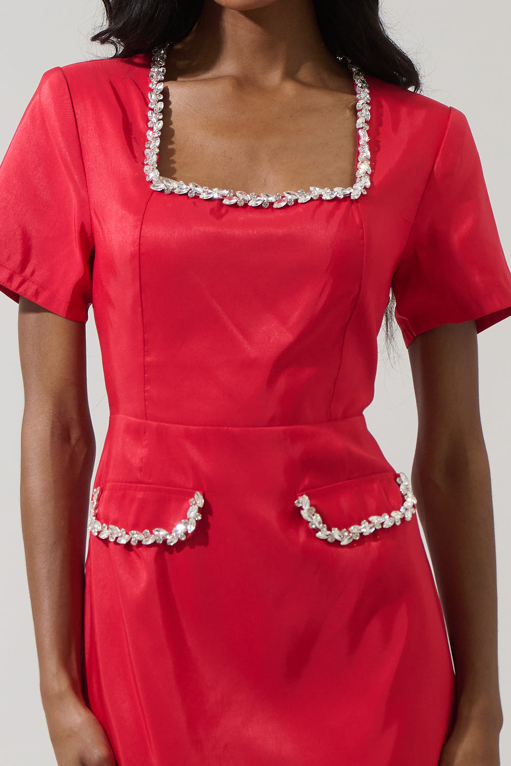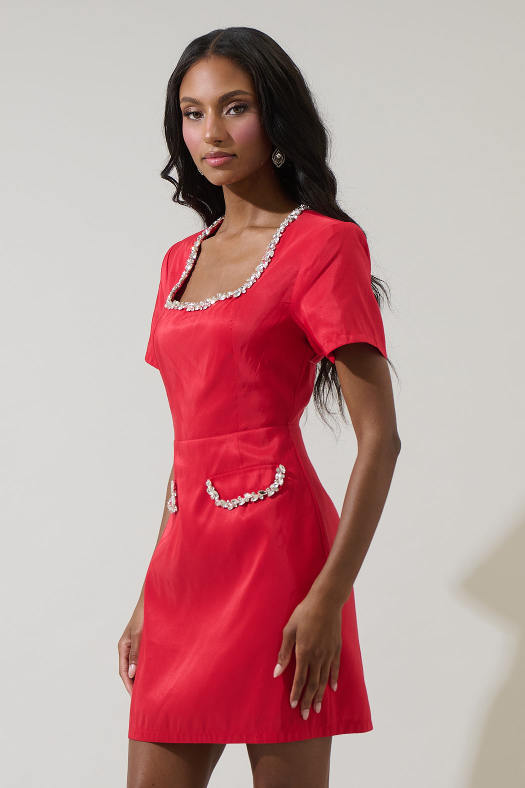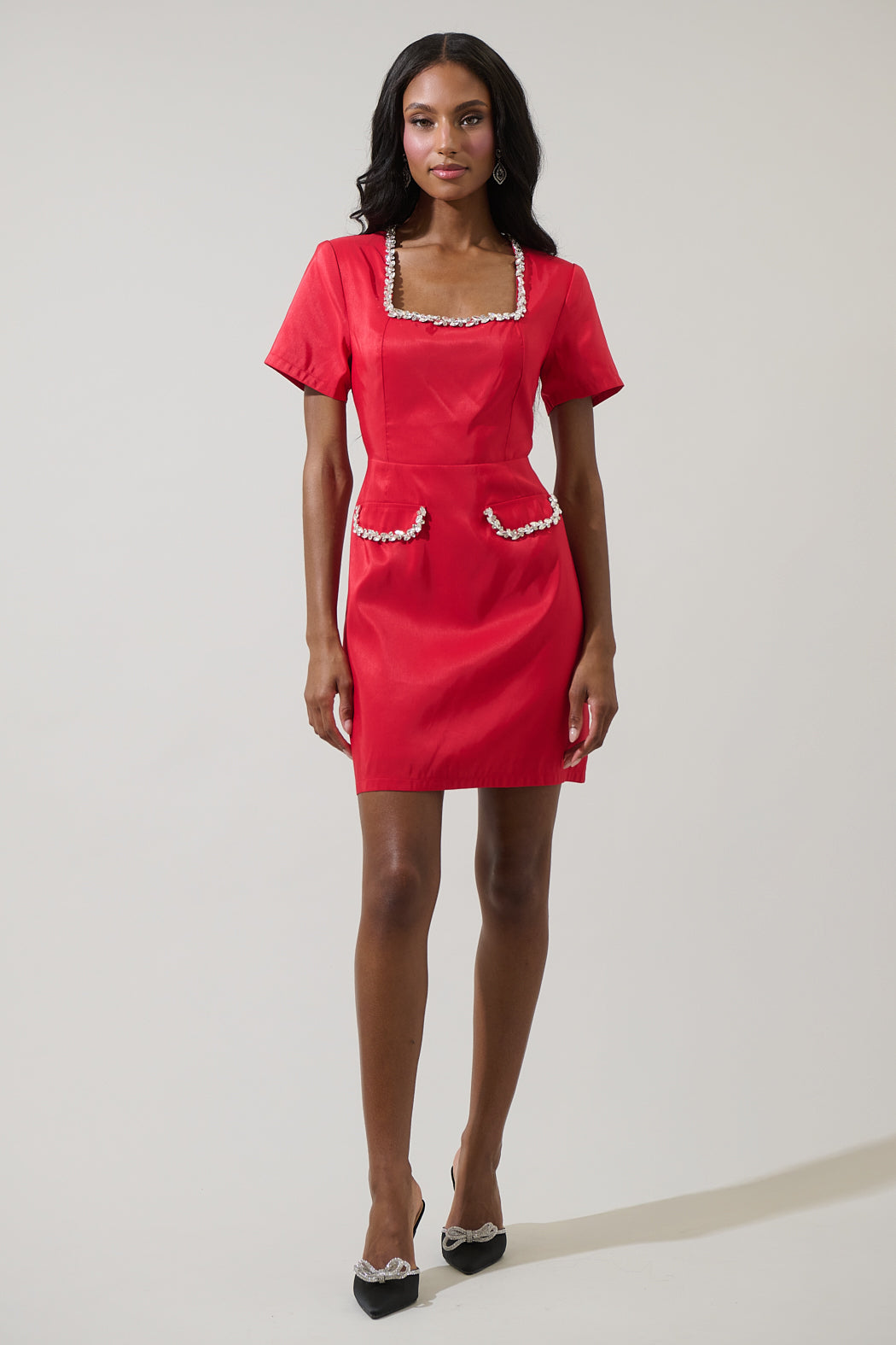Steal the spotlight in this dazzling dress with a touch of vintage charm. This mini features a square neckline with rhinestone trim, short sleeves, flap pocket accents, and an invisible back zipper. Pair it with crystal earrings, metallic heels, and a chic clutch.