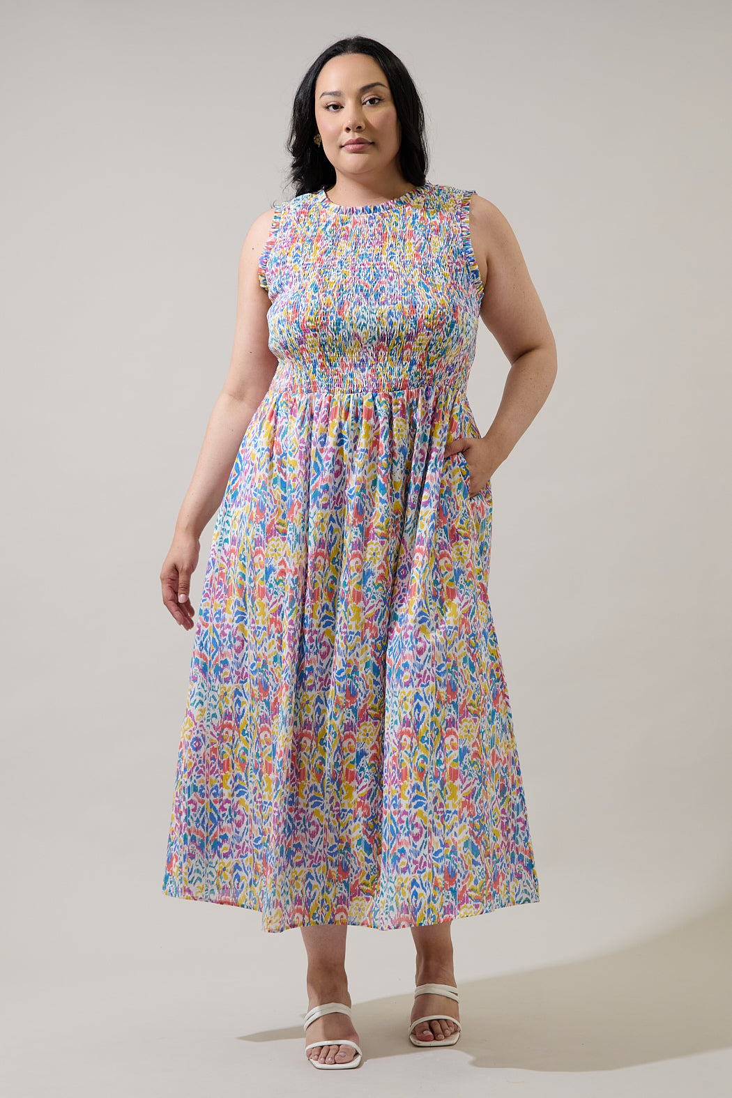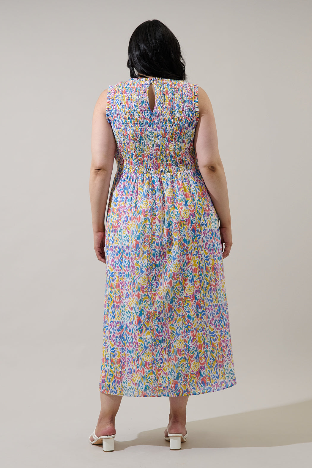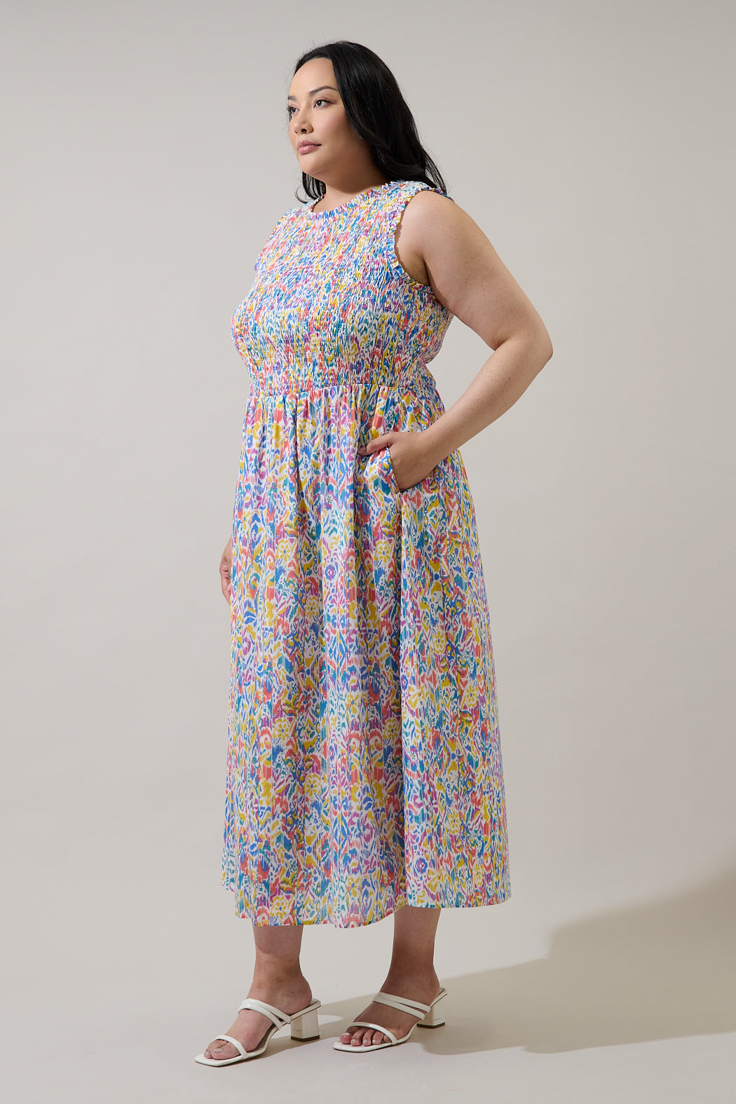 Malva Abstract Cecil Smocked Sleeveless Midi Dress Curve