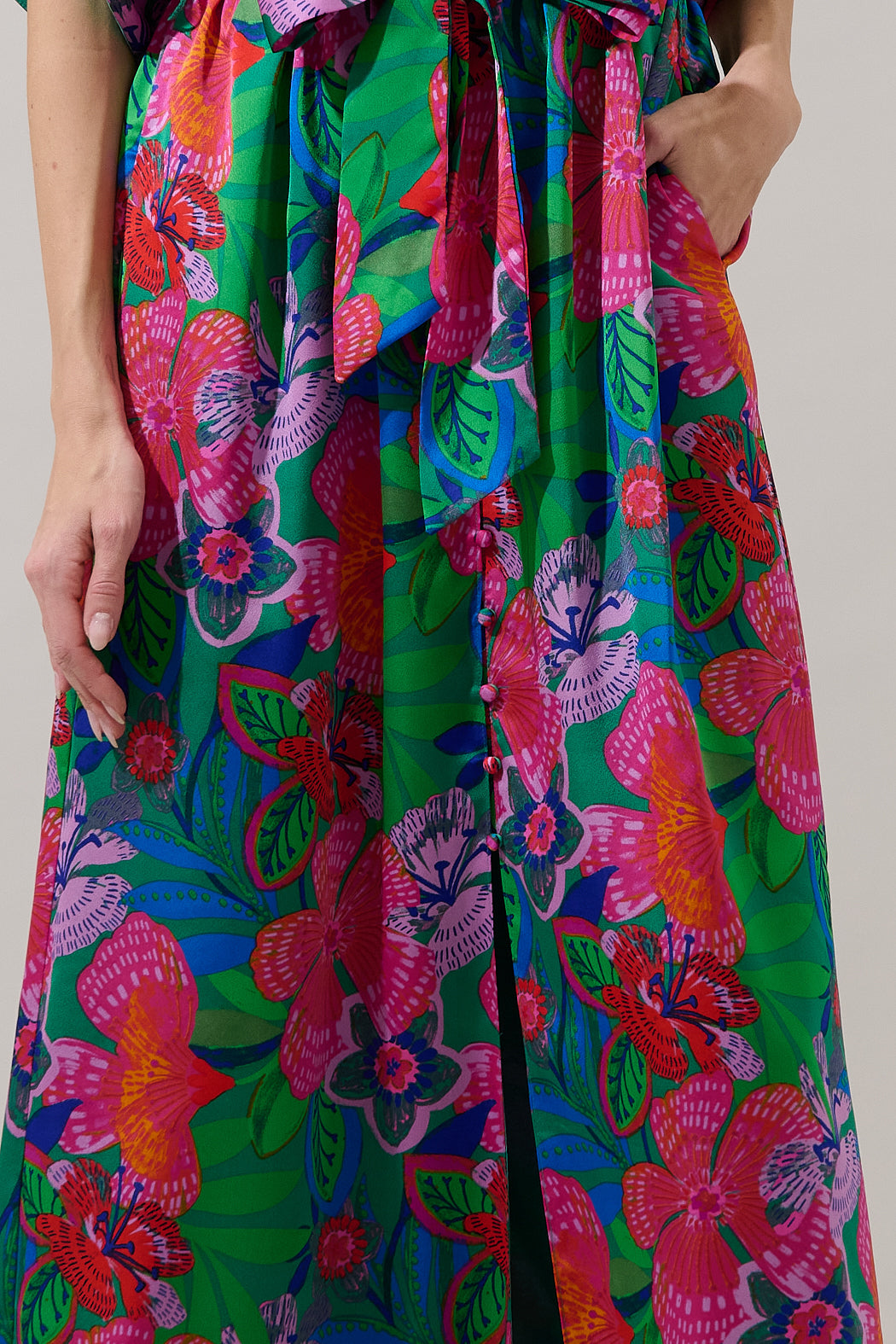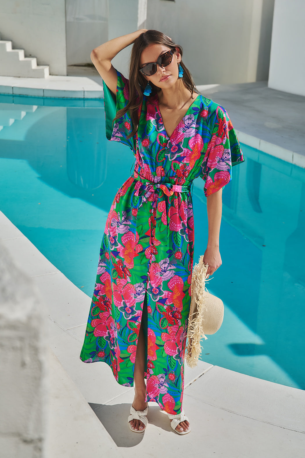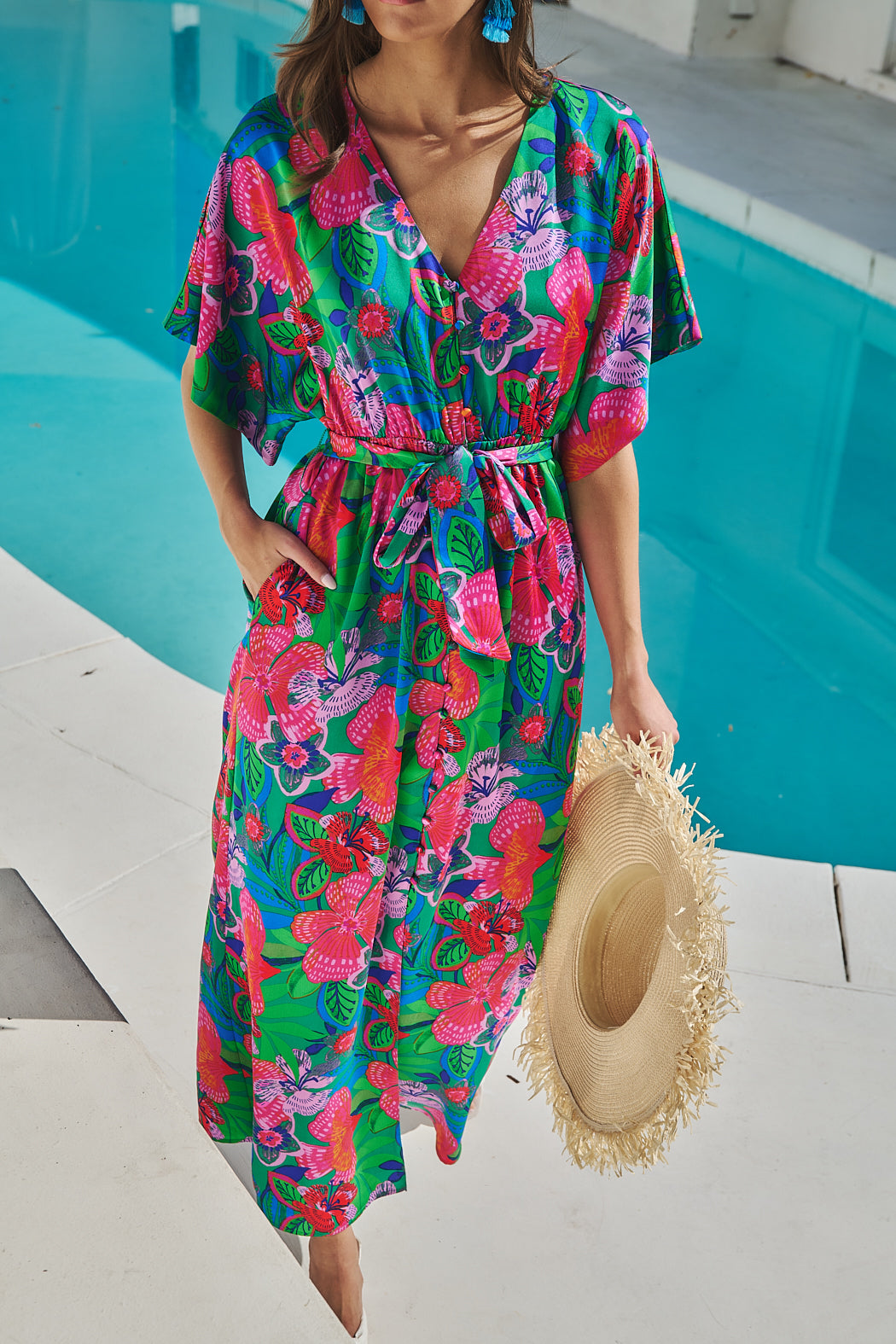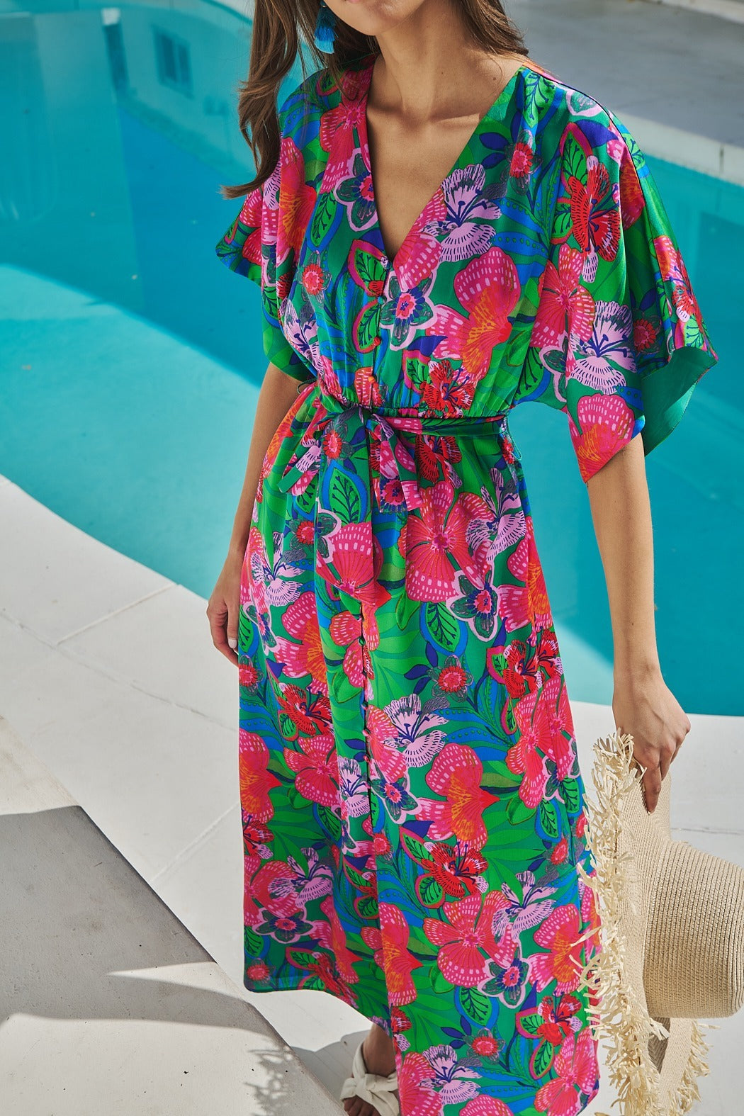 Bold, bright, and made to stand out, this vibrant mini dress brings instant summer energy. An effortless kimono frame with dolman sleeves that highlight a button front. A sash style belt wraps around the waist to add shape. Pair it with strappy heels.