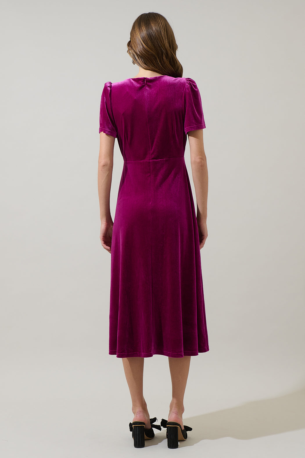 Bring the sparkle to every celebration in this stunning dress. This velvet style features short sleeves, a flattering midi length, and an invisible back zipper for a smooth fit. Available in black and magenta, just add statement earrings and block heels for a polished holiday or party look.