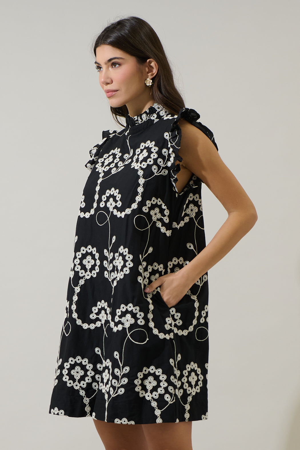 Embrace effortless charm with this mini dress. It features a white eyelet embroidery that pops beautifully against the dark fabric, with ruffle detailing at the shoulders and neckline. Designed with a relaxed shift fit, it even includes functional side pockets for a stylish yet practical finish to your look. Pair it with heels.