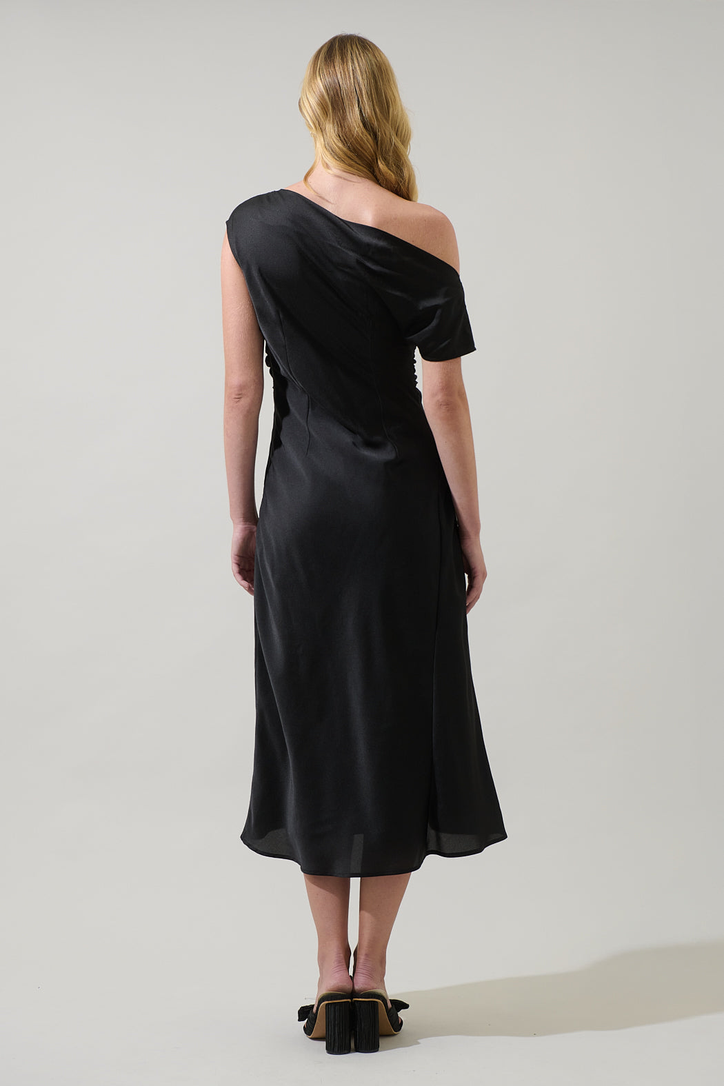 Unveil your inner elegance in this beautifully designed dress. Featuring an off the shoulder midi style, it offers a flattering silhouette, an invisible side zipper for a seamless fit, and a figure enhancing design. Pair it with strappy heels and a chic clutch for an effortlessly polished look.