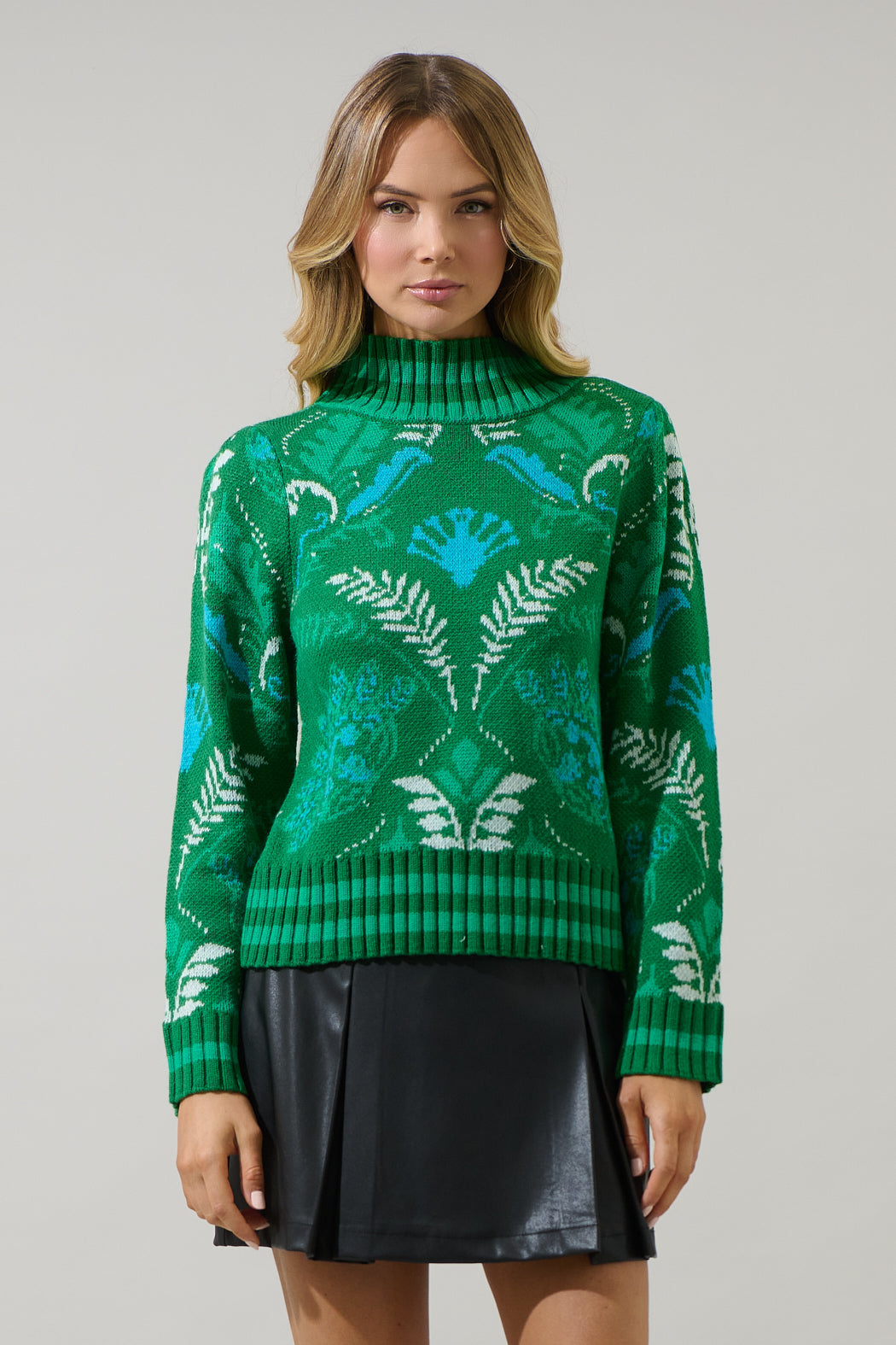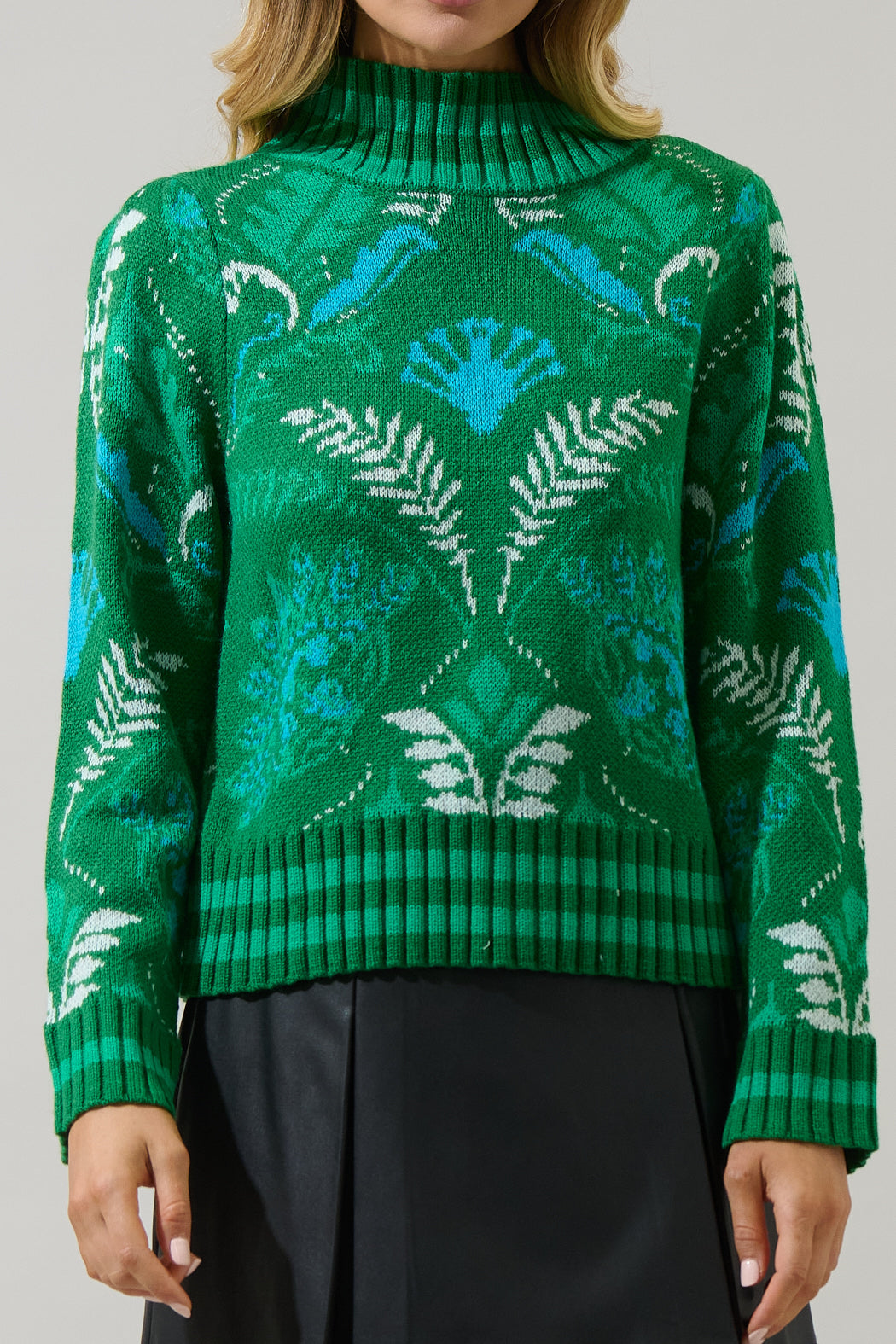 Infuse your fall and winter outfits with color and confidence. This vibrant sweater features an intricate floral inspired pattern in contrasting green and blue, a mock neck, oversized long sleeves, and a fitted silhouette. Pair it with a leather mini skirt and ankle boots to create a standout outfit that’s equal parts cozy and chic.