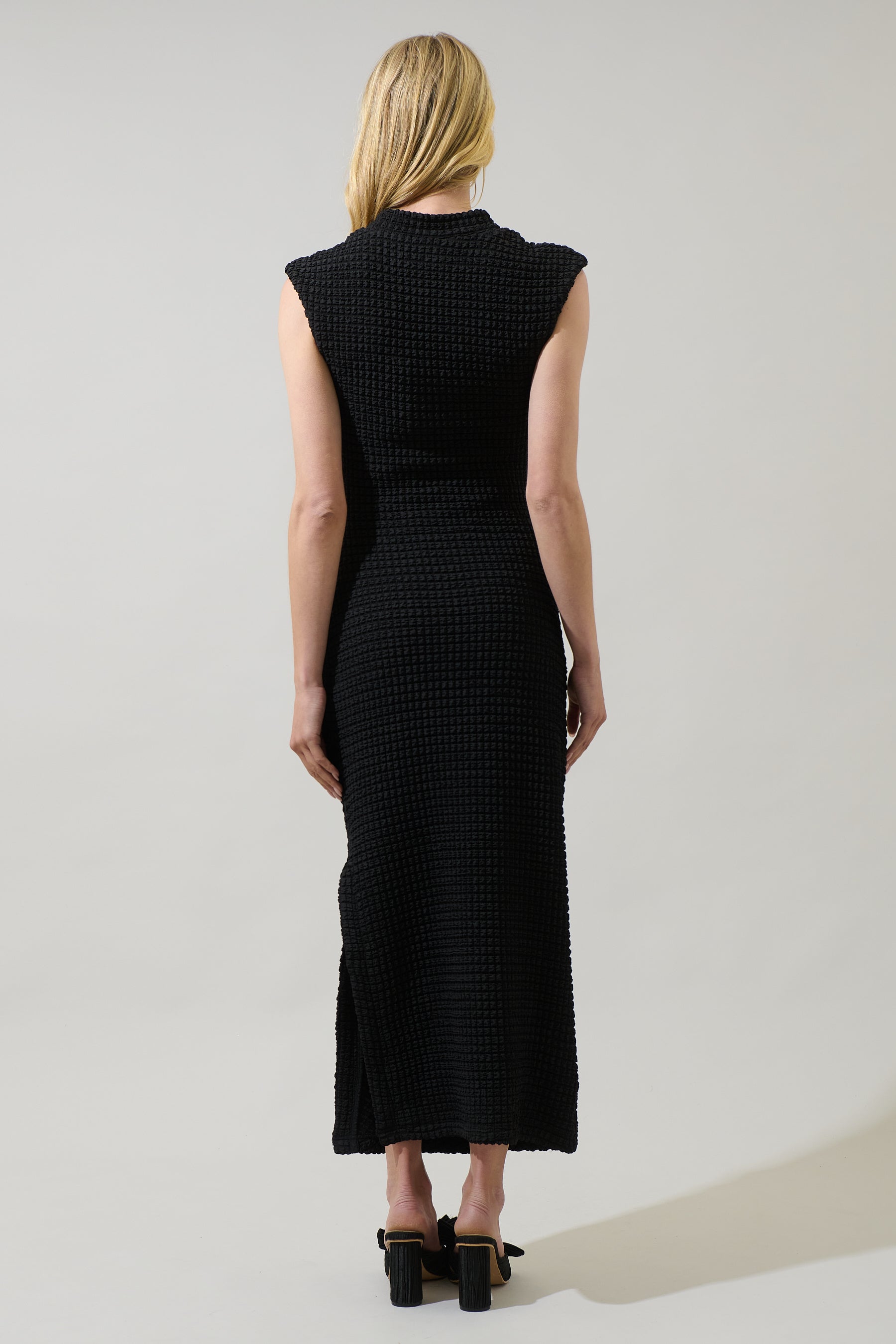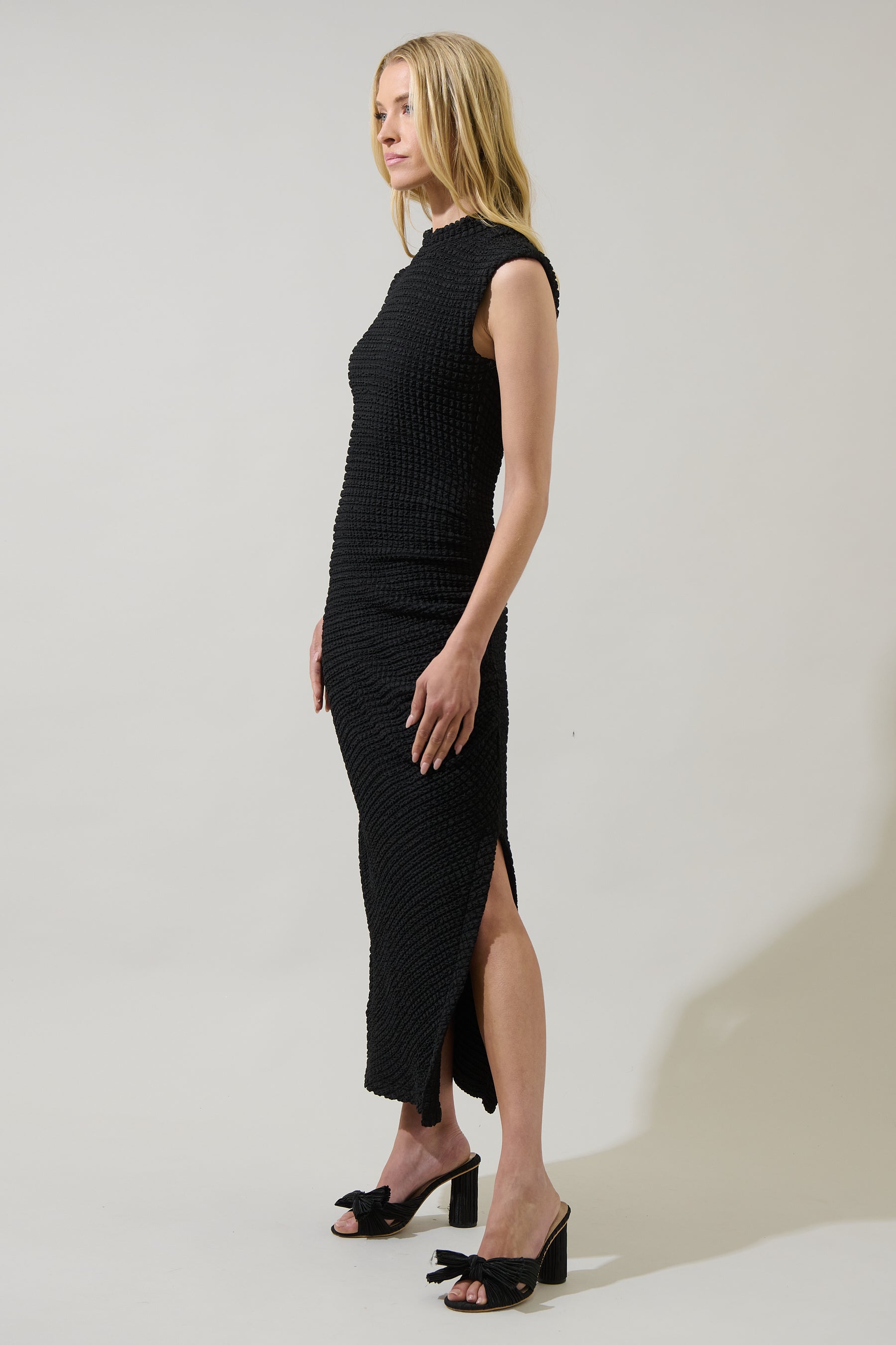 Sleek and modern this dress is your go-to for a polished silhouette with a twist. Featuring a mock neckline and subtle cap sleeves. The slim fit hugs in all the right places, while a side slit adds just the right amount of movement and allure. Perfect for elevated evenings, cocktail events, or making a powerful impression day or night.