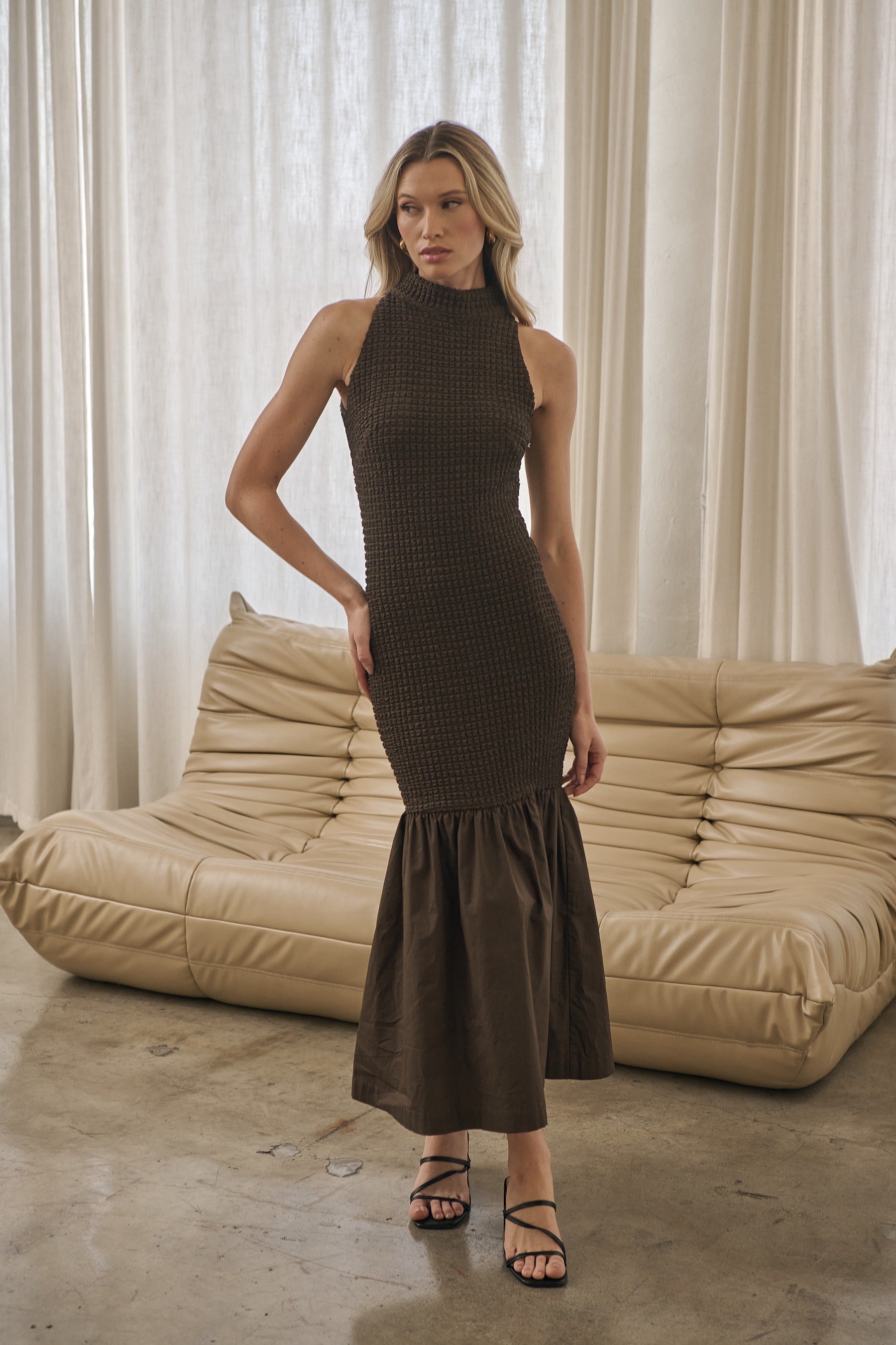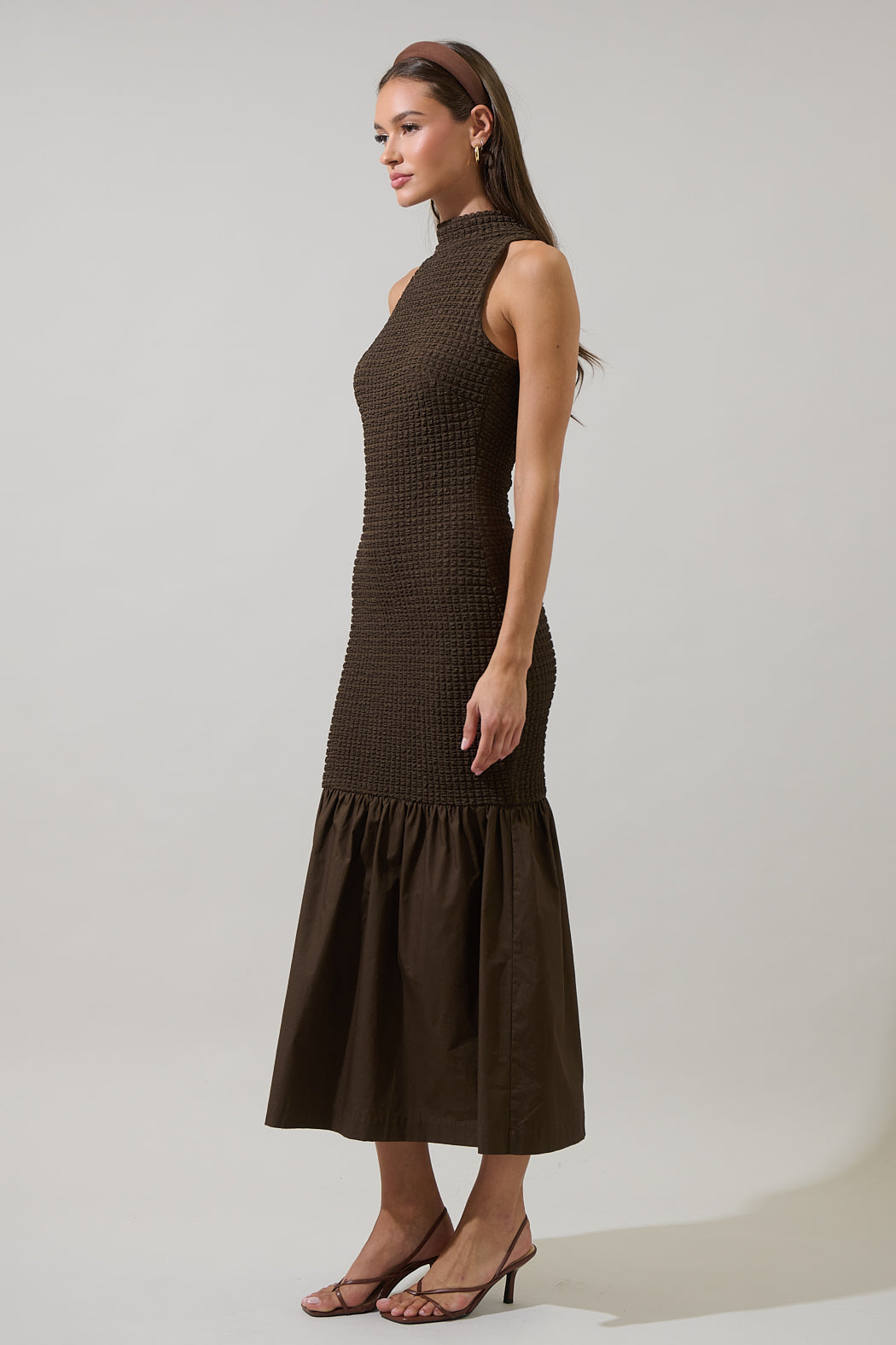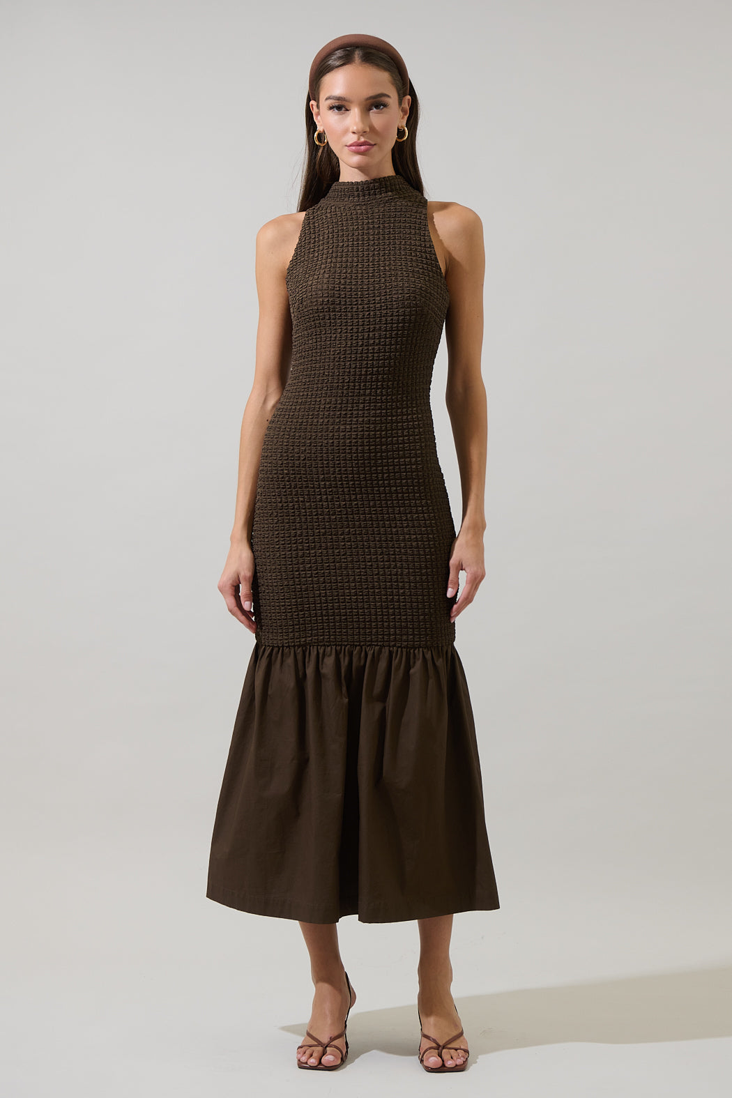 Effortless elegance meets texture. This sleeveless midi dress features a cute, waffle-knit bodice that hugs your curves and flows into a crisp gathered hem for a flattering, feminine silhouette. Perfect for day-to-night styling with just a change of heels.