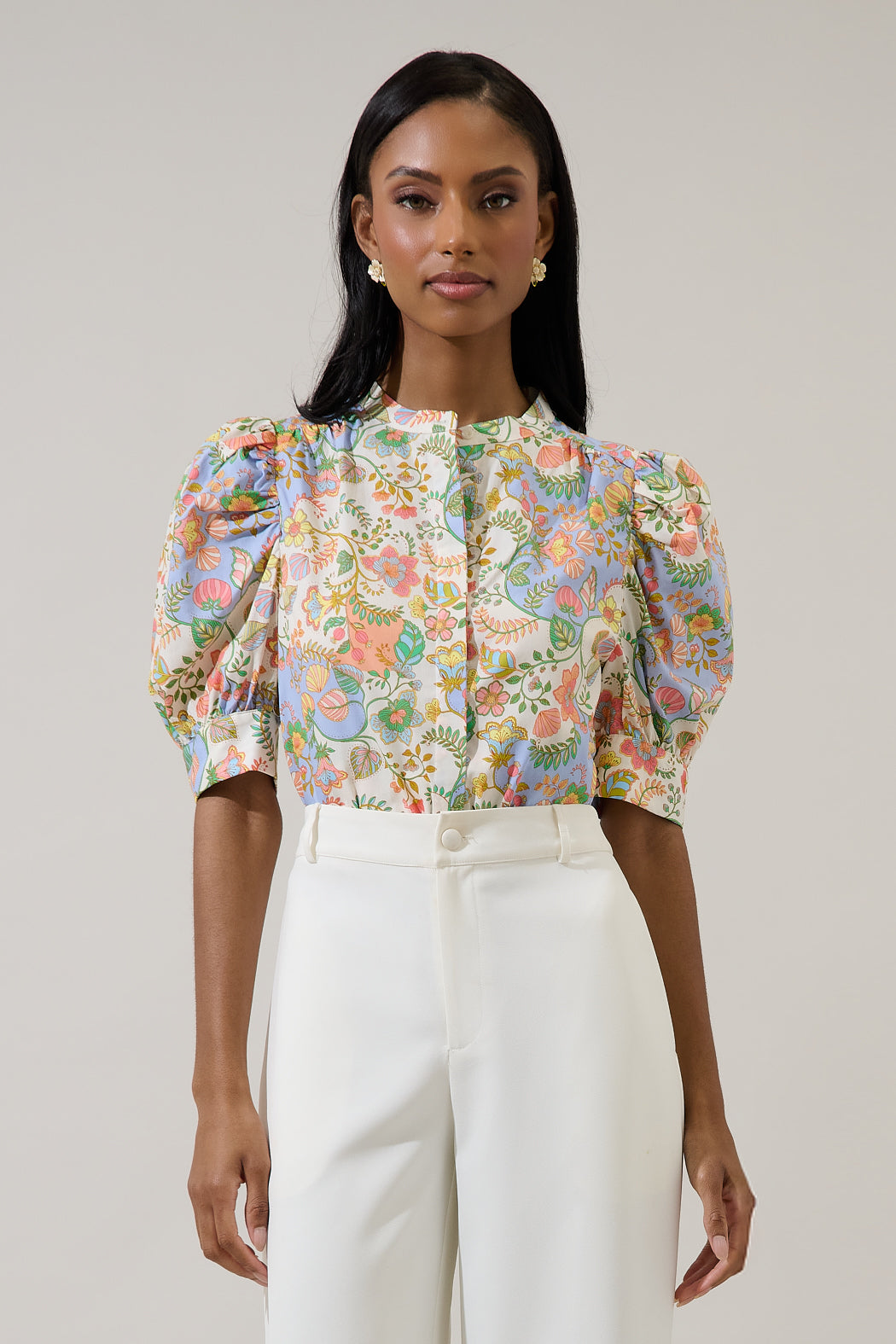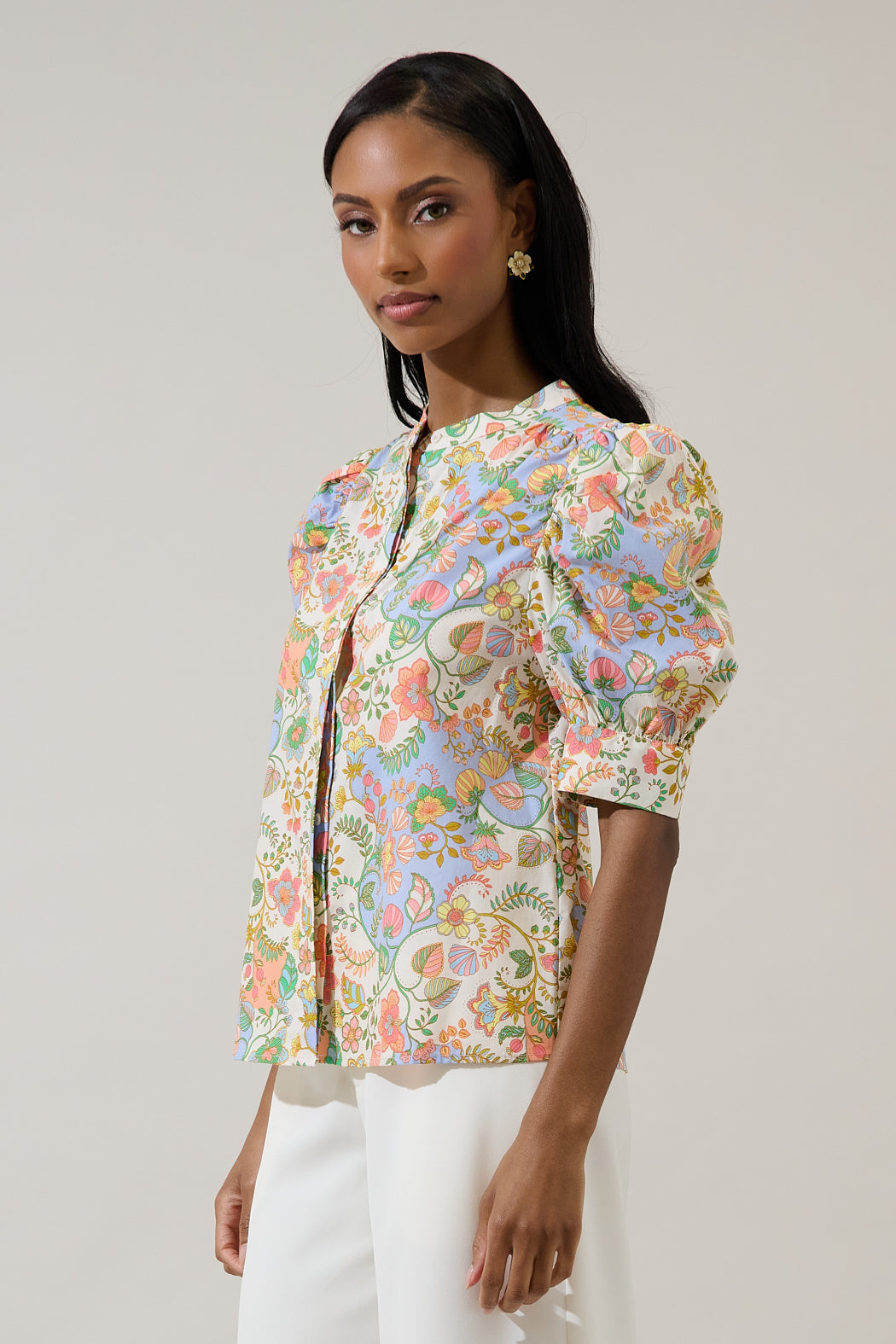 A cute top like this one will be admired by everyone. Short drape sleeves feature a button up front on this top. Its relaxed fit will go perfect with white pants and any shoes of your choice.