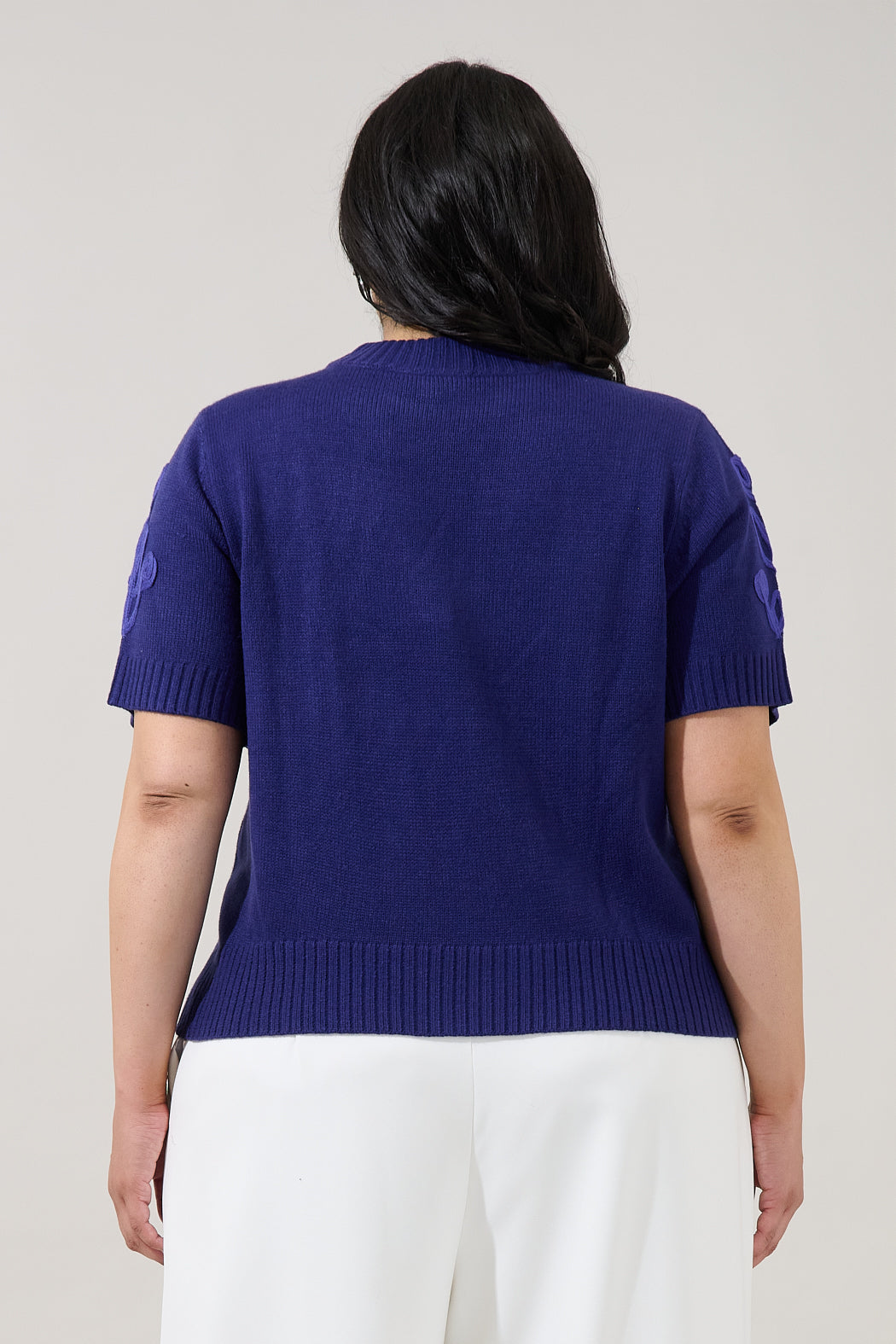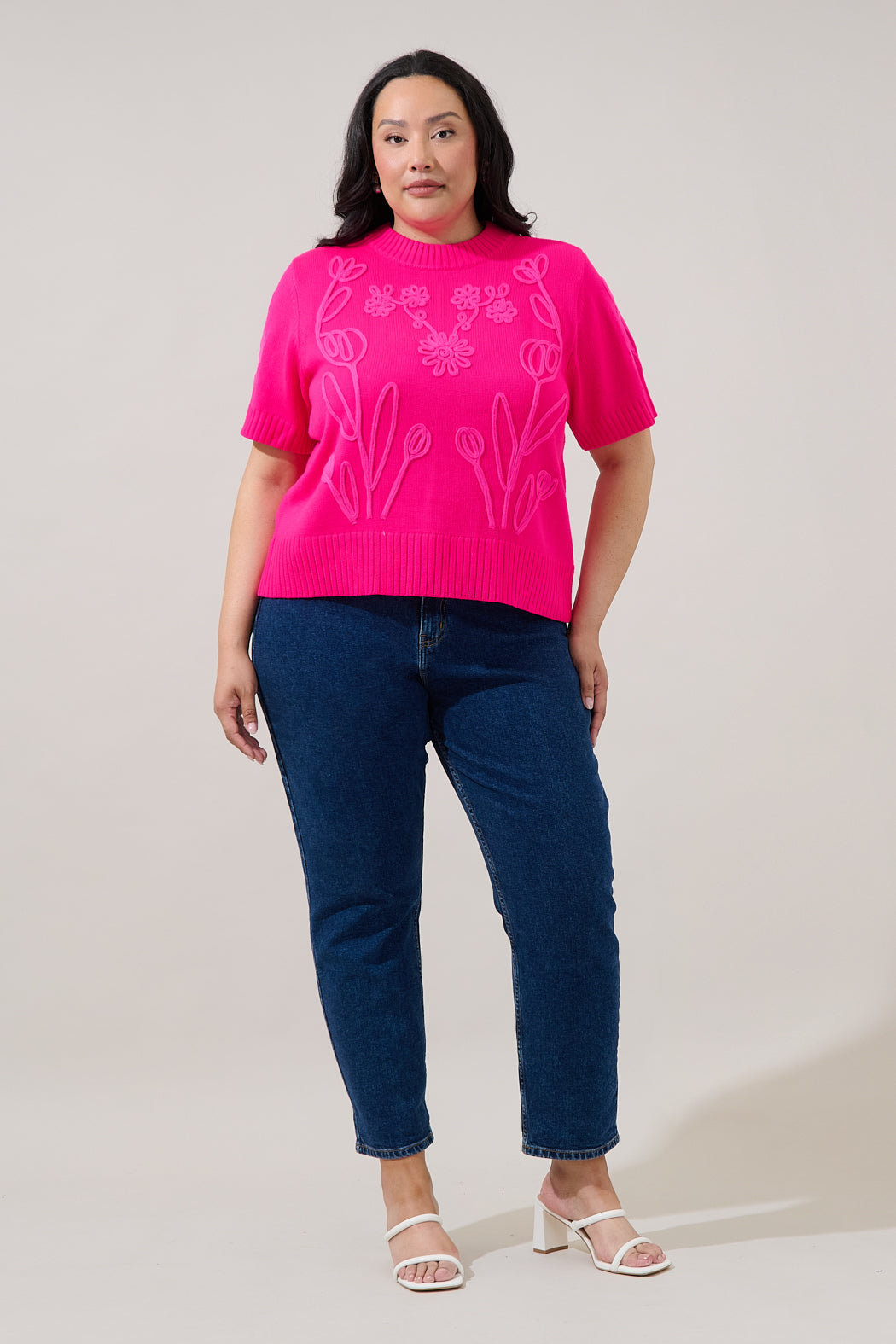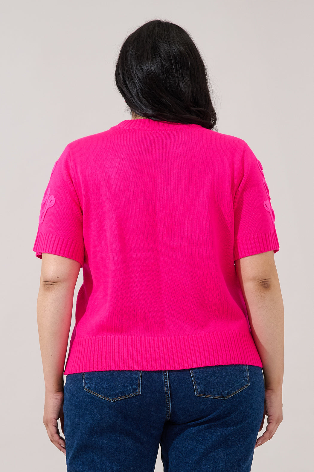 Say hello to your new statement knit! This vibrant green sweater top blooms with textured floral detailing that adds a touch of whimsy to your look. Designed with short sleeves and a cozy knit feel, it’s the perfect mix of fun and style. Wear it with denim jeans and cute boots or heels.