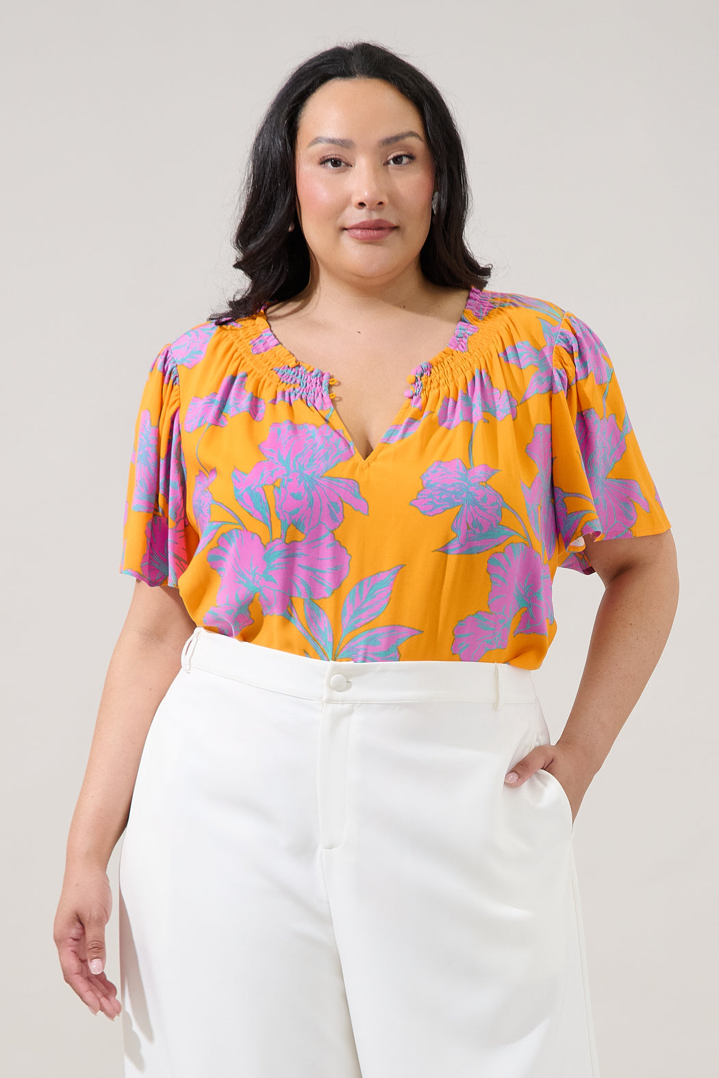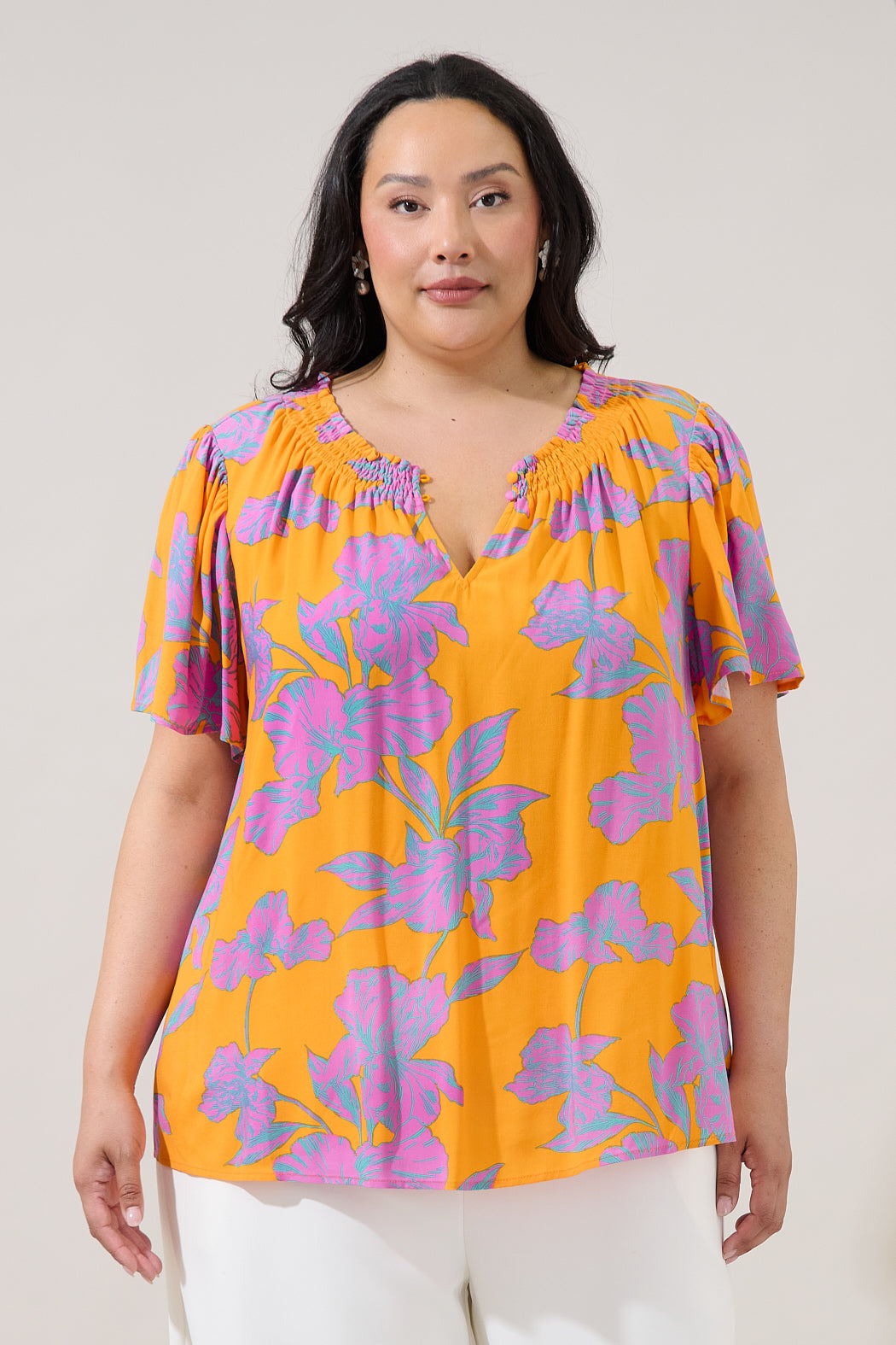 Bold flowers, instant confidence. This vibrant floral top features a relaxed silhouette, gathered neckline detail, and long sleeves with subtle volume, it’s the perfect statement piece to dress up your favorite denim or tailored pants.