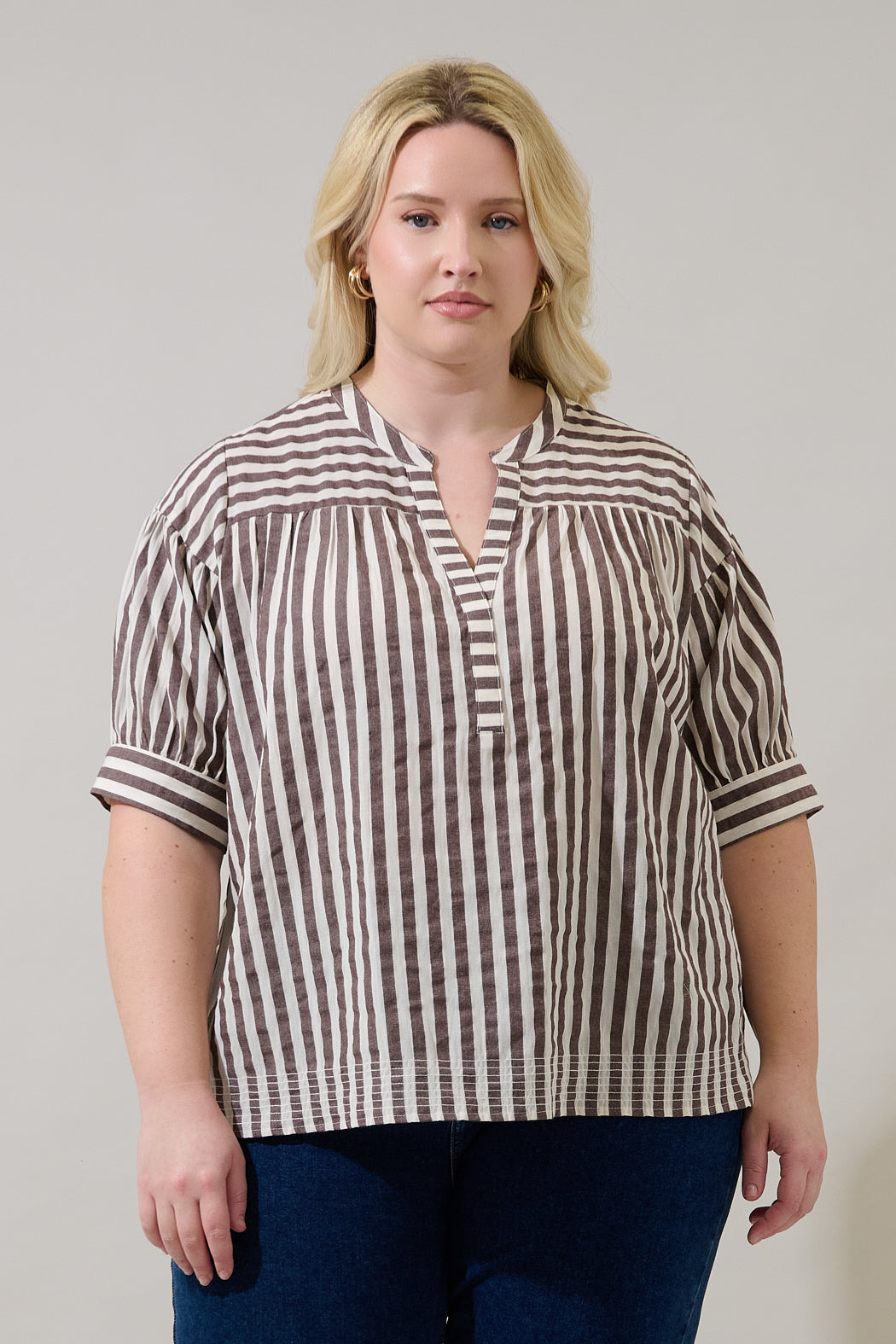 This top will make your outfits look extra cute! Lightweight blue and white stripes give a perfectly nautical look over short puff sleeves and a split neckline. Combine it with jeans or shorts to complete a chic look!