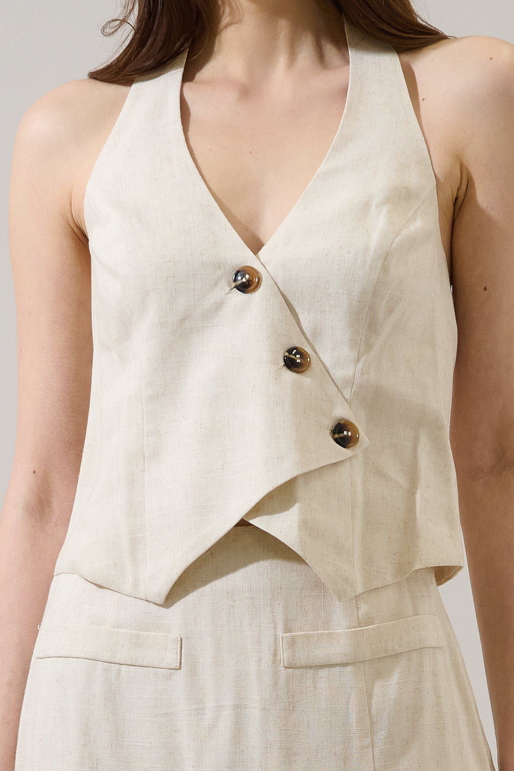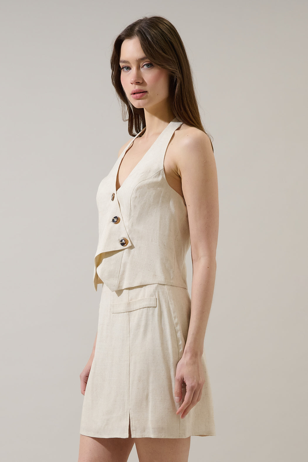 A fresh take on the a vest! This linen halter vest features a unique asymmetric button-front design and a V-neckline. The cropped silhouette and make it a versatile styling piece, perfect for pairing with its matching mini skirt.
