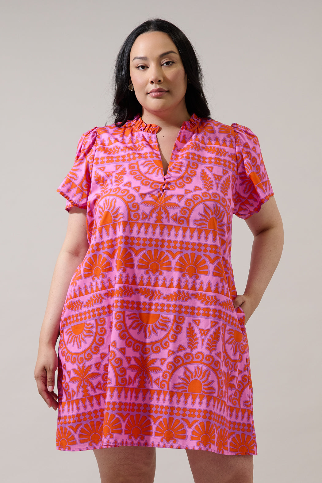 Bring sunshine wherever you go in this vibrant tropical dress made to stand out. Designed with a flattering split neckline, short sleeves, a self tie belted waist, and functional pockets. Style it with espadrille wedges, a straw bag, and statement earrings.