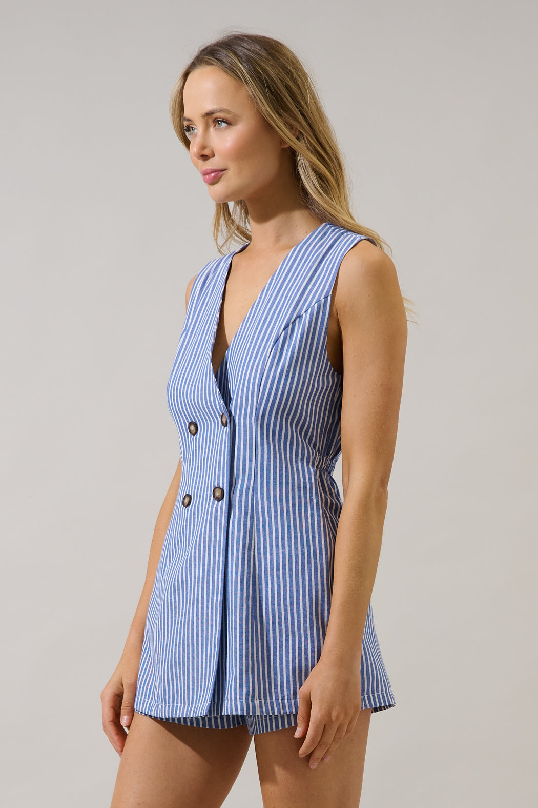 Just feels right to have this romper. A stripe pattern shapes a split neckline and a functional, double button placket at front with a wrap design. Attached shorts have side seam pockets. Add on your earring and heels to be set for the day or night.