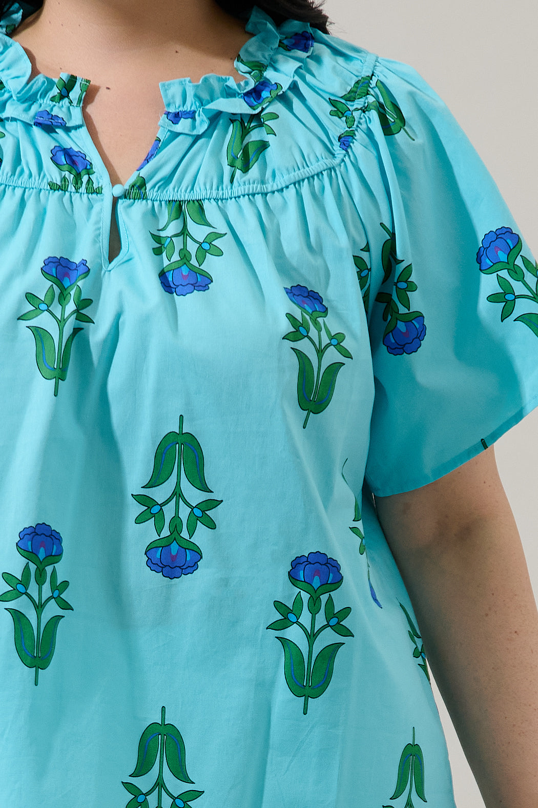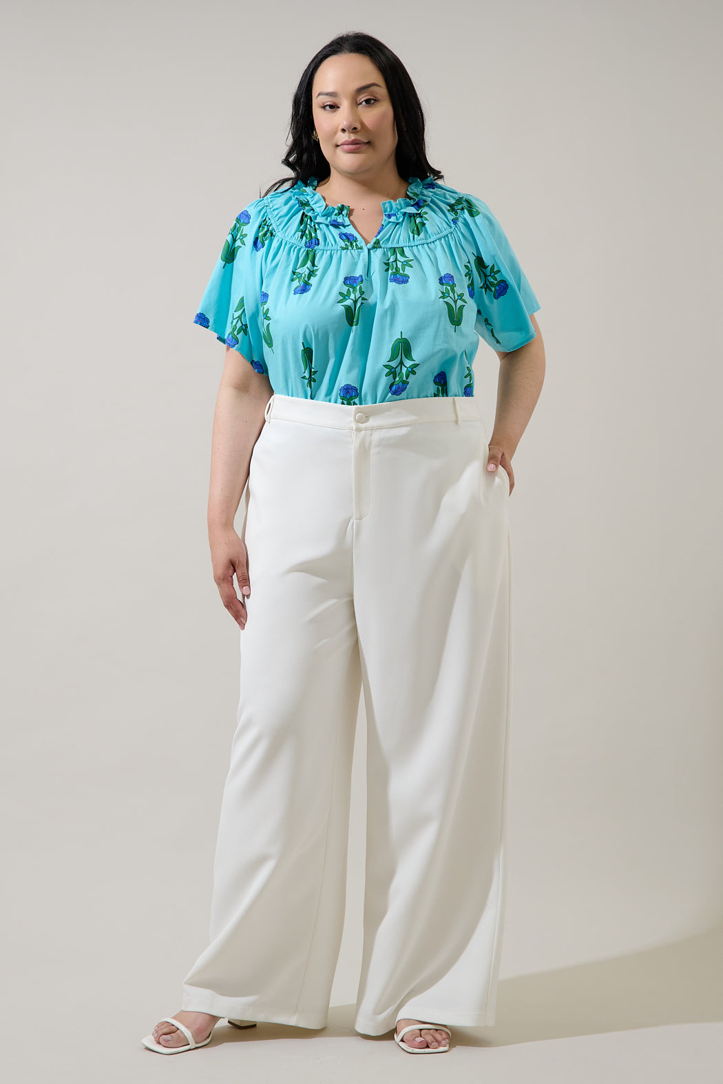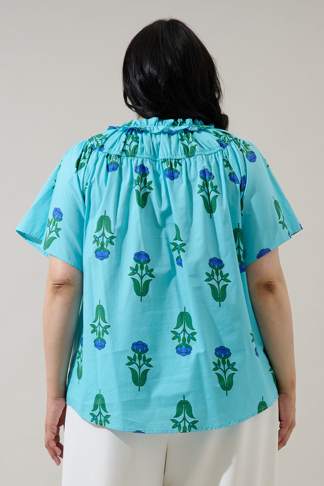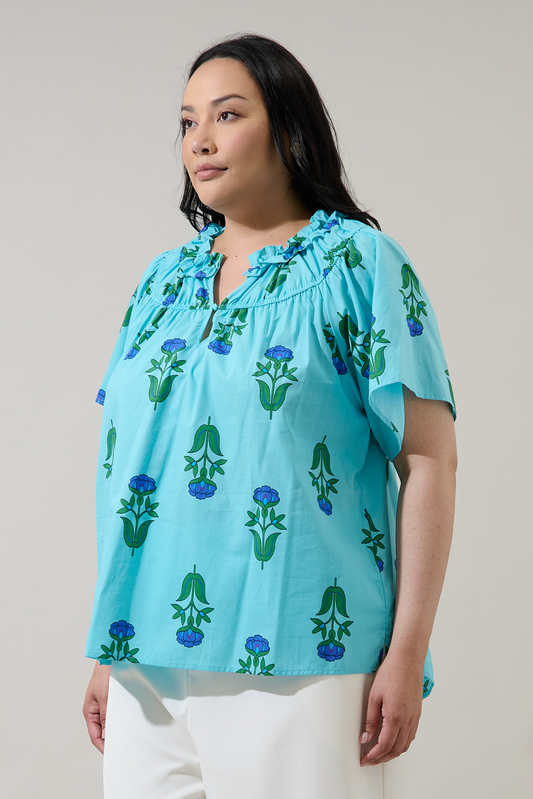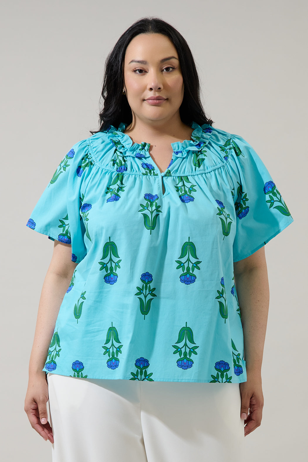 Show up and show off in this darling top. This short sleeve top has a split neck, relaxed fit, with a ruffle detail to give you a chic look. Throw on some trousers and heels for dressed up look or keep it casual with sneakers and jeans.
