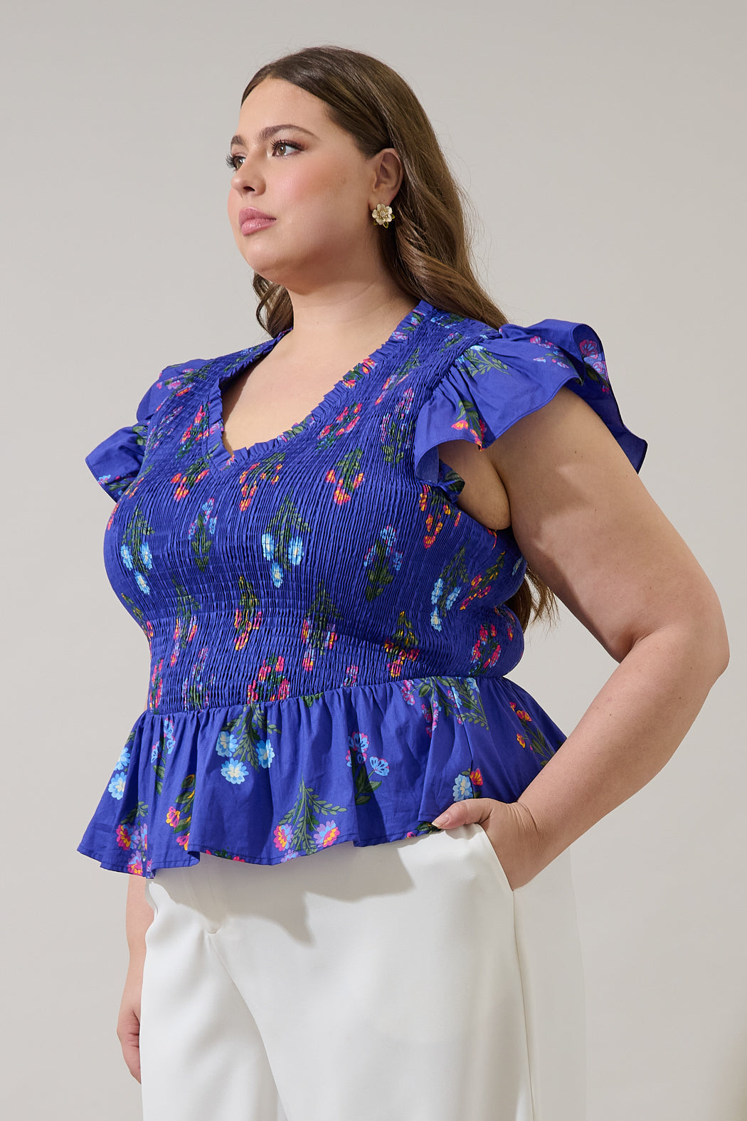 Clemen Floral Brish Smocked Ruffle Top Curve
