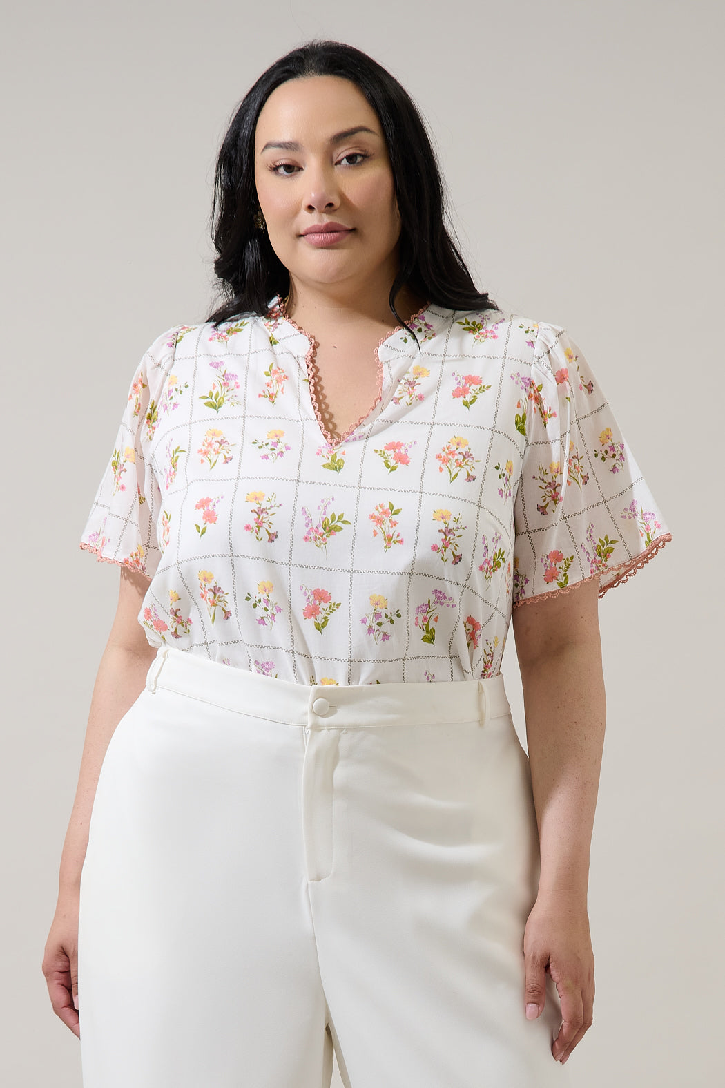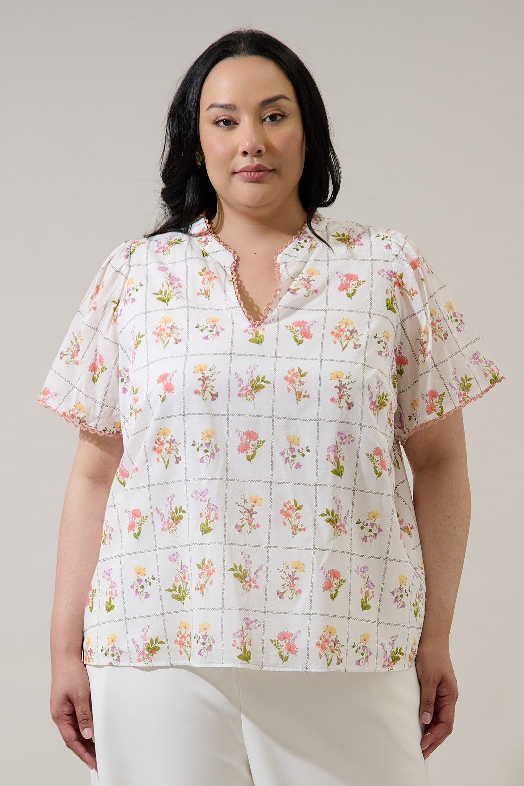 This sweet, light top is the perfect piece to elevate any look. It has a relaxed, flowing fit and short, feminine flutter sleeves. The flattering split V-neckline is charmingly accented with a scalloped edge and soft pom-pom trim in a subtle peach hue. Pair it effortlessly with white trousers or denim for a polished, romantic daytime outfit.