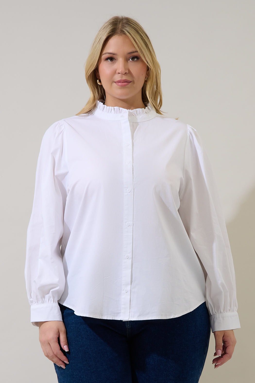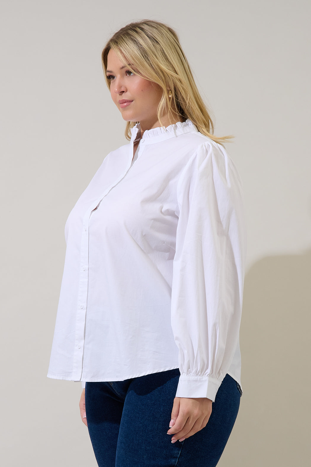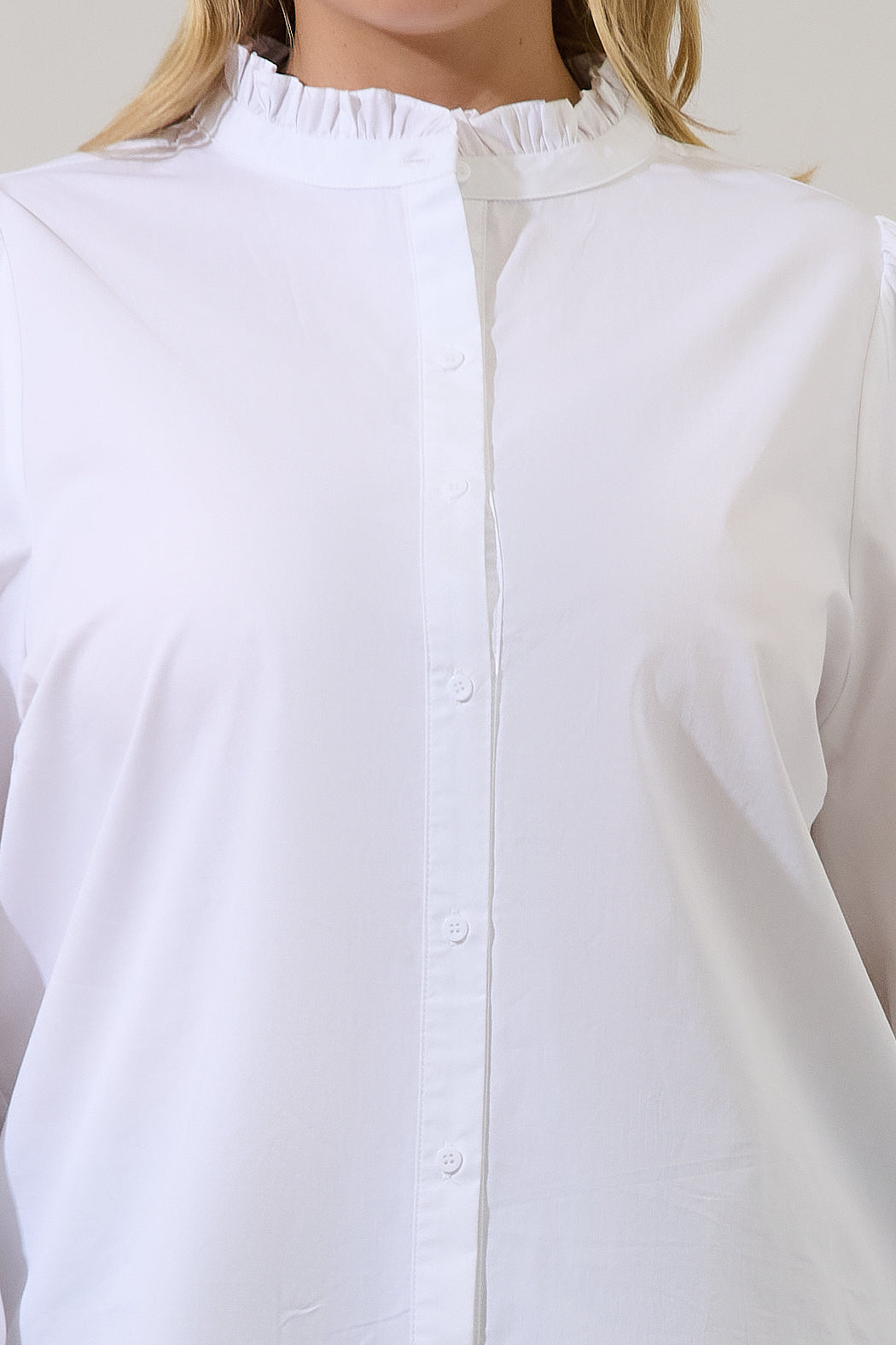 You need a classic white top. Long sleeves frame a ruffled collar lead to a button placket. It maintains a classic fit. Easy to wear with a cami underneath and denim jeans.