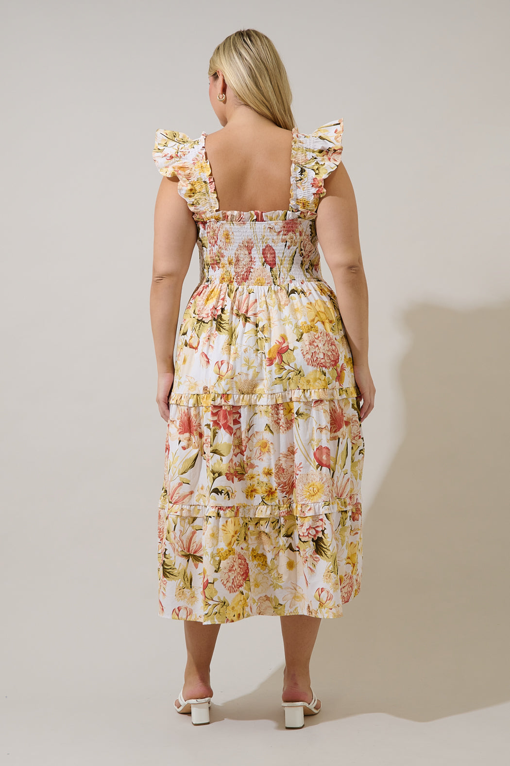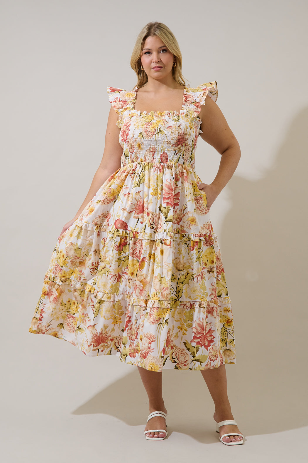 A breath of fresh florals, made for warm days and effortless elegance. It features wide ruffle straps tethered to a smocked bodice that sits atop a ruffle tiered layer midi skirt. It's a spring must-have that can easily be worn with heels.
