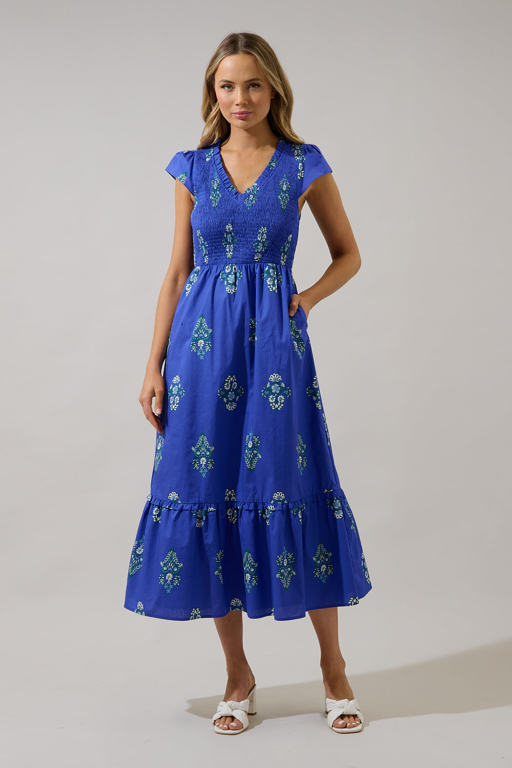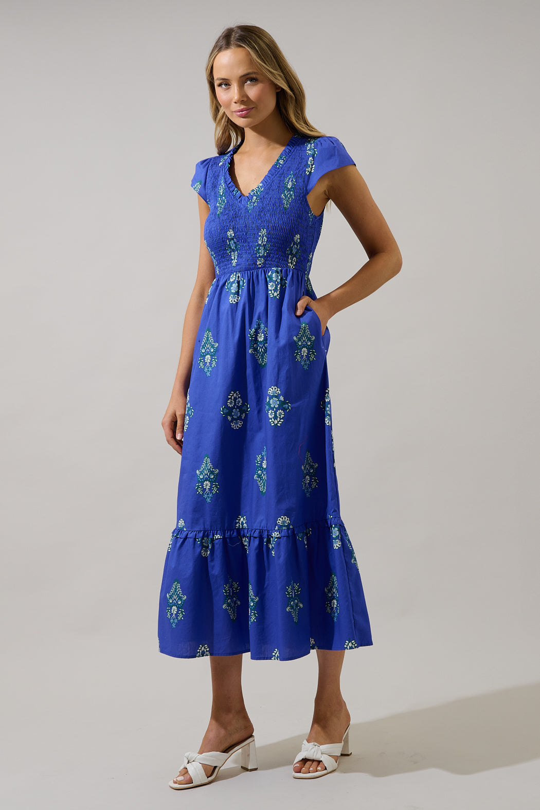 Keep things light for the summer in the Haline Floral Liora Smocked Midi Dress. A blue background with florals makes up this beautiful midi dress with short sleeves, smocked body, and v-neckline. It ends with a ruffle hem. Wear it with woven sandals with a bag to match.
