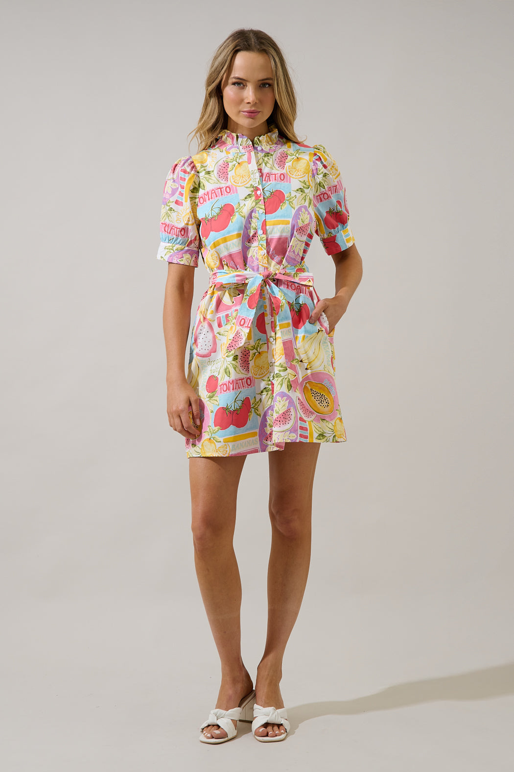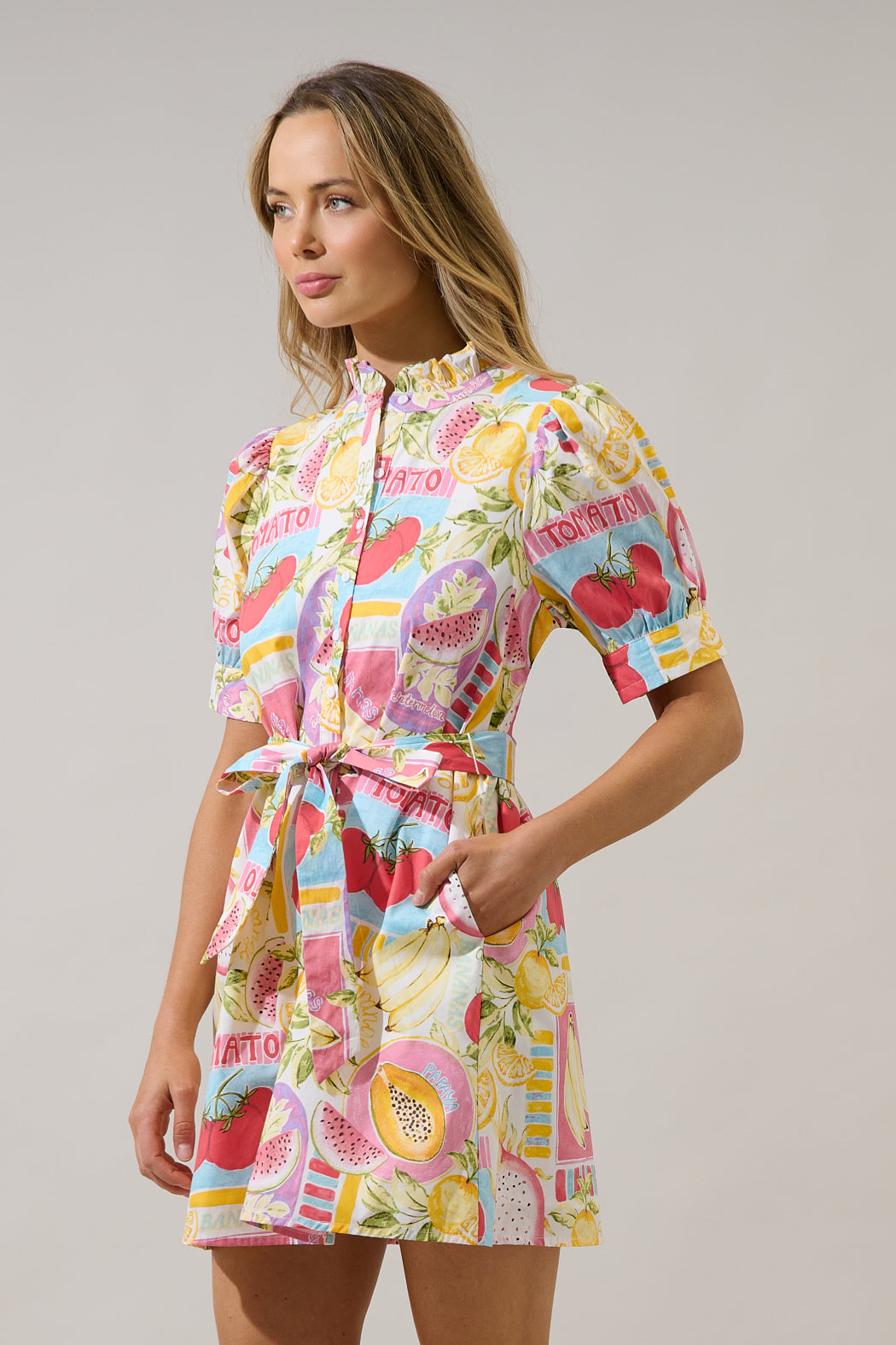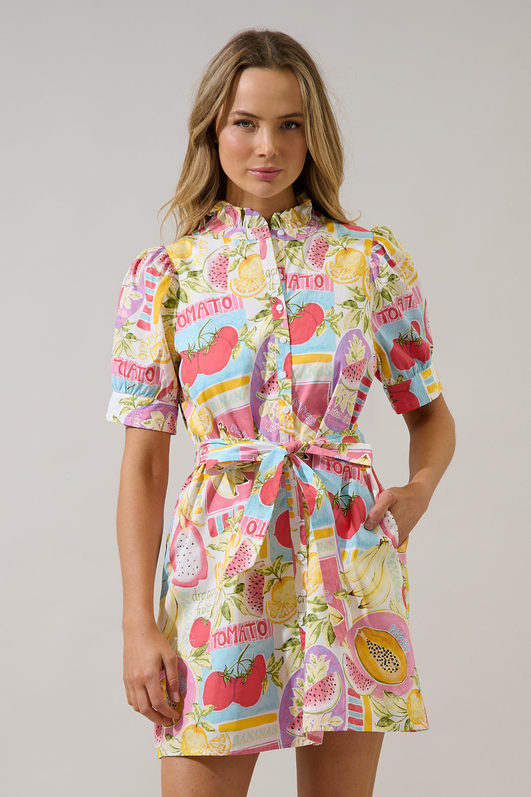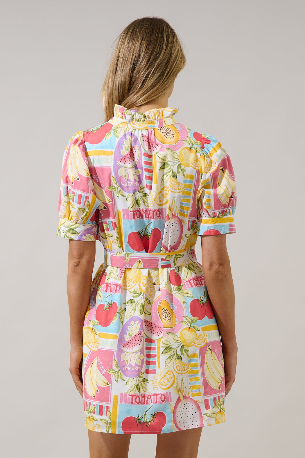 A playful pop of color with major summer vibes! Featuring a vibrant fruit inspired print, puff sleeves, and a flattering tie waist. Perfect for warm days, brunch dates, and vacation strolls.