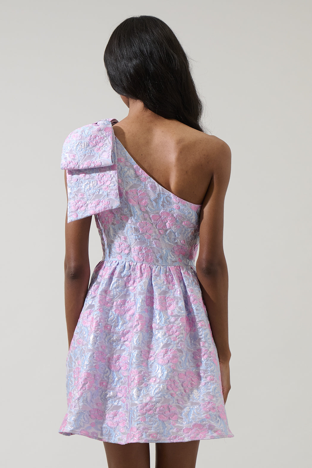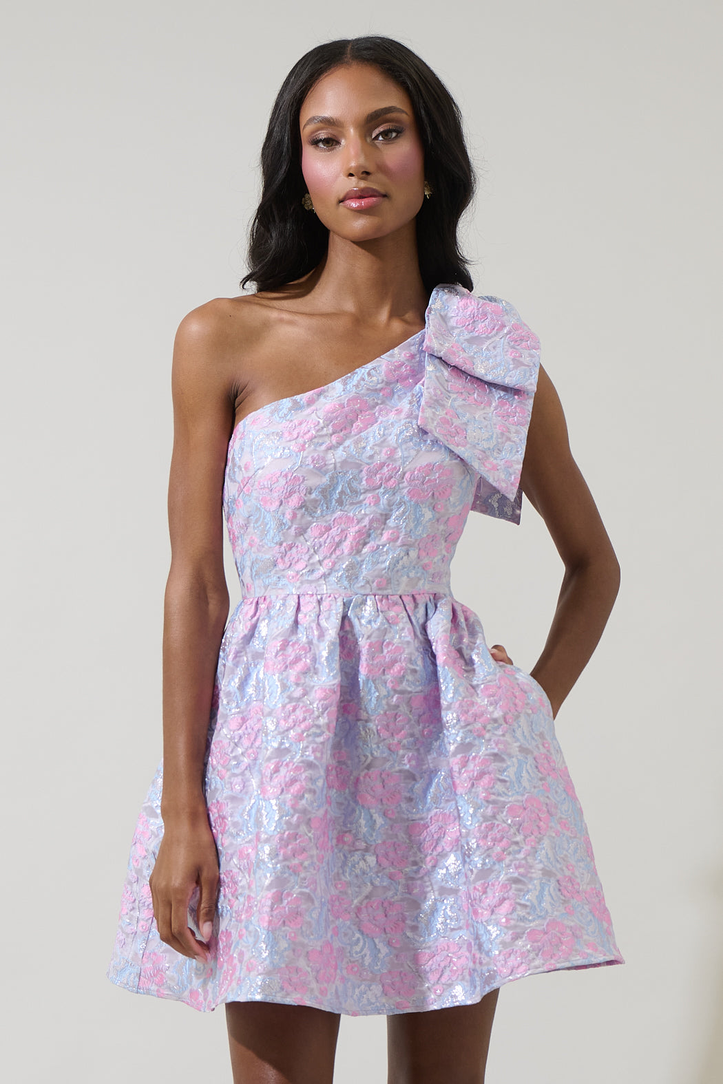 Never worry about looking stylish when you have the Mandy Jacquard Ivine Bow Mini Dress. A jacquard floral print designs this one shoulder dress with a big bow at the shoulder. The bottom is flared with an invisible zipper on the side. Pair the look with earrings and strappy heels.