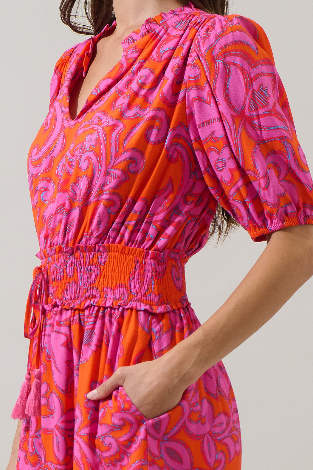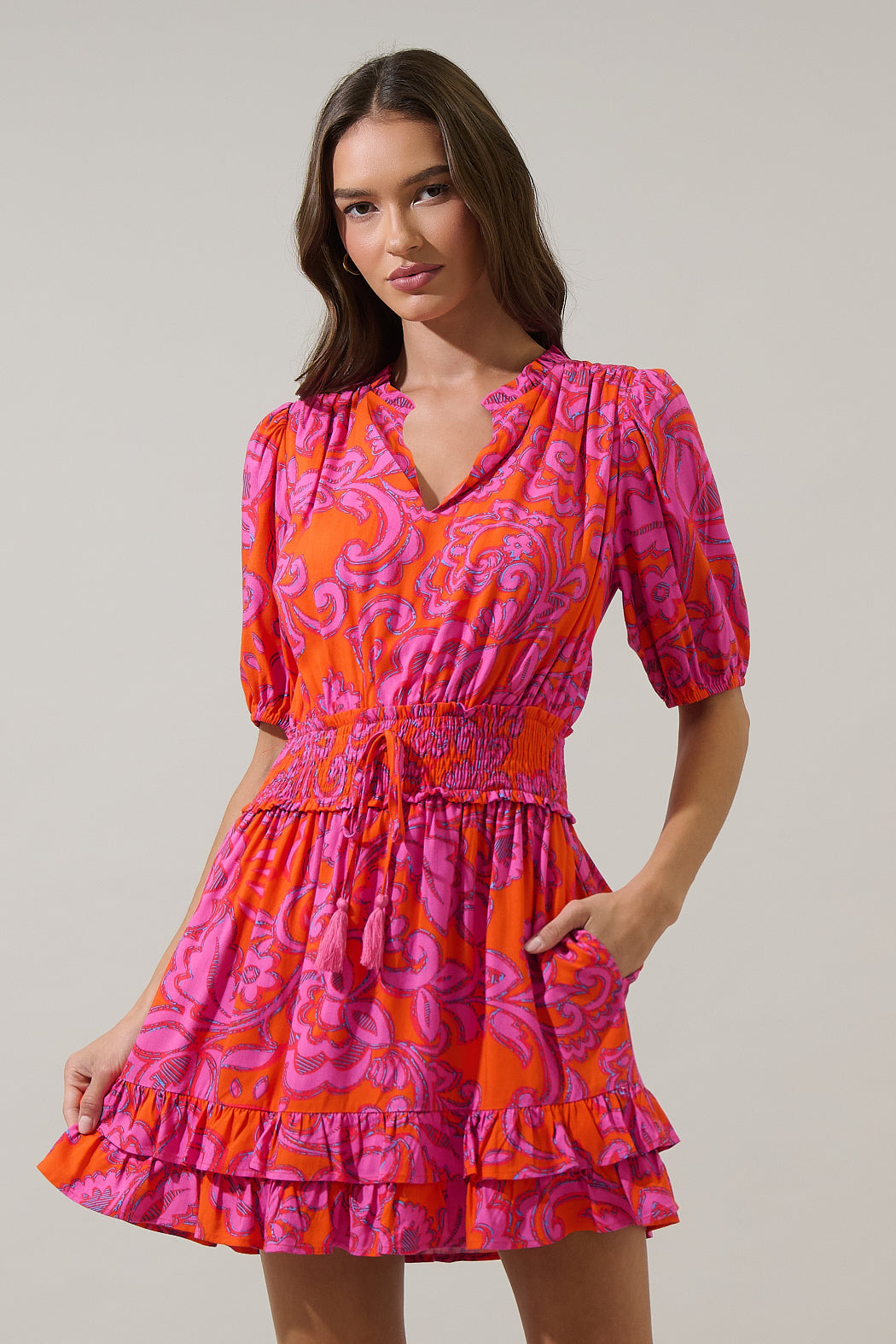 Feel an effortlessly flow with every step when you wear this mini dress. Short puff sleeves frame a spit neck with a thick smocked waistband. It ends with ruffles at a mini length. Pair with pink heels or sandals for a cute look.