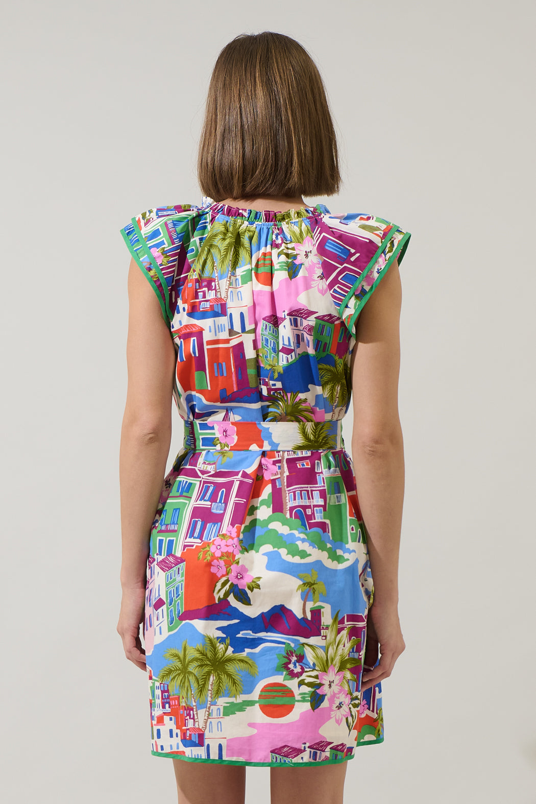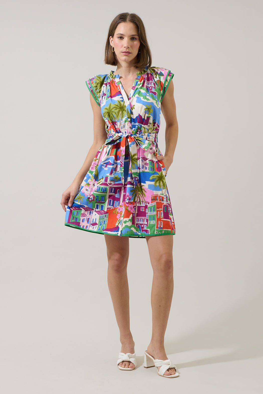 A dreamy townscape comes to life in this midi dress. It features layered ruffle cap sleeves with a button down front and a belt around the waist. It has pockets on each side. White heels and bun style hair look will complement the dress.