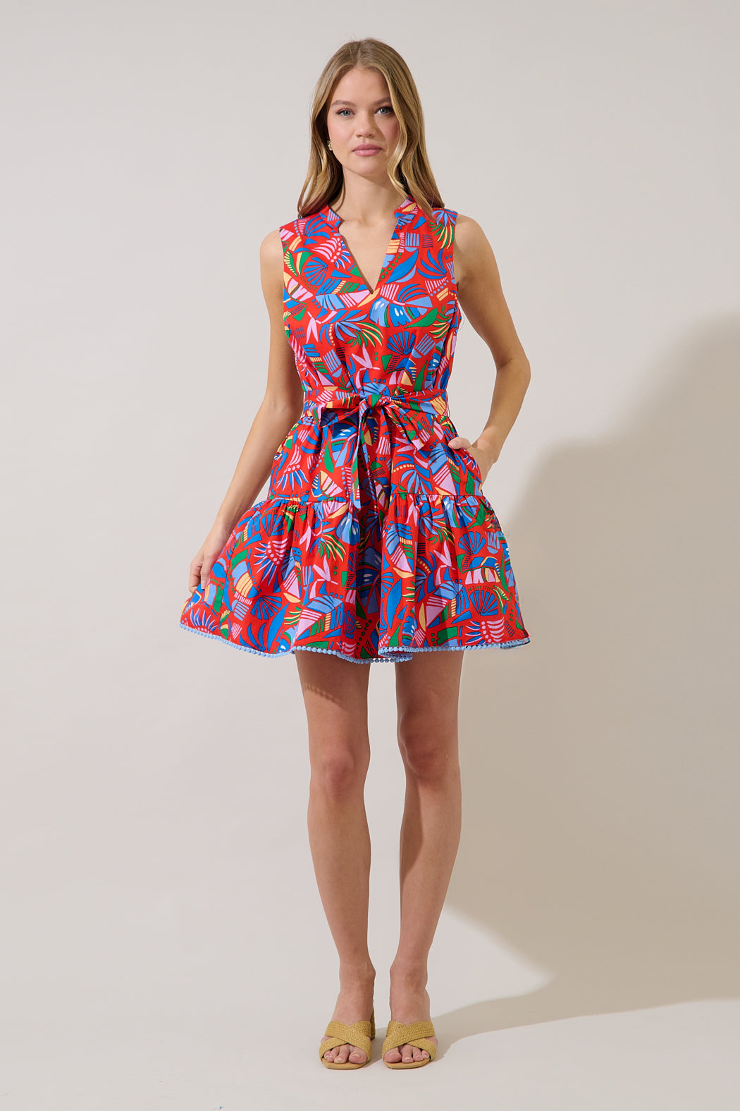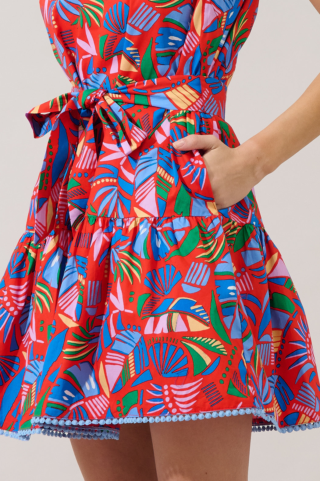 Turning heads has never been this easy. Sleeveless with a chic split neck, it features a matching belt to cinch the waist. A playful pom-pom trim along the hem, is ready to be paired with white strappy heels.