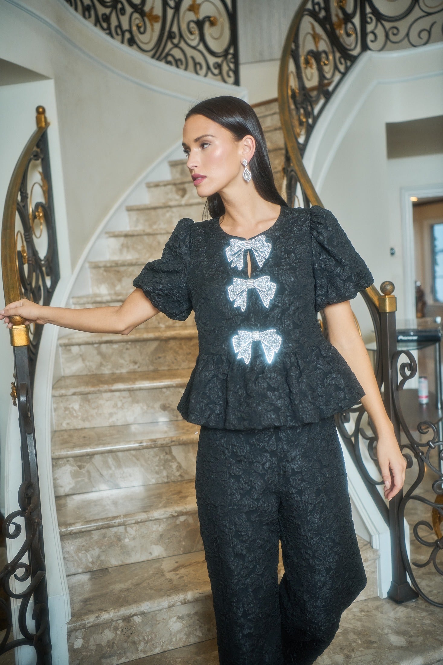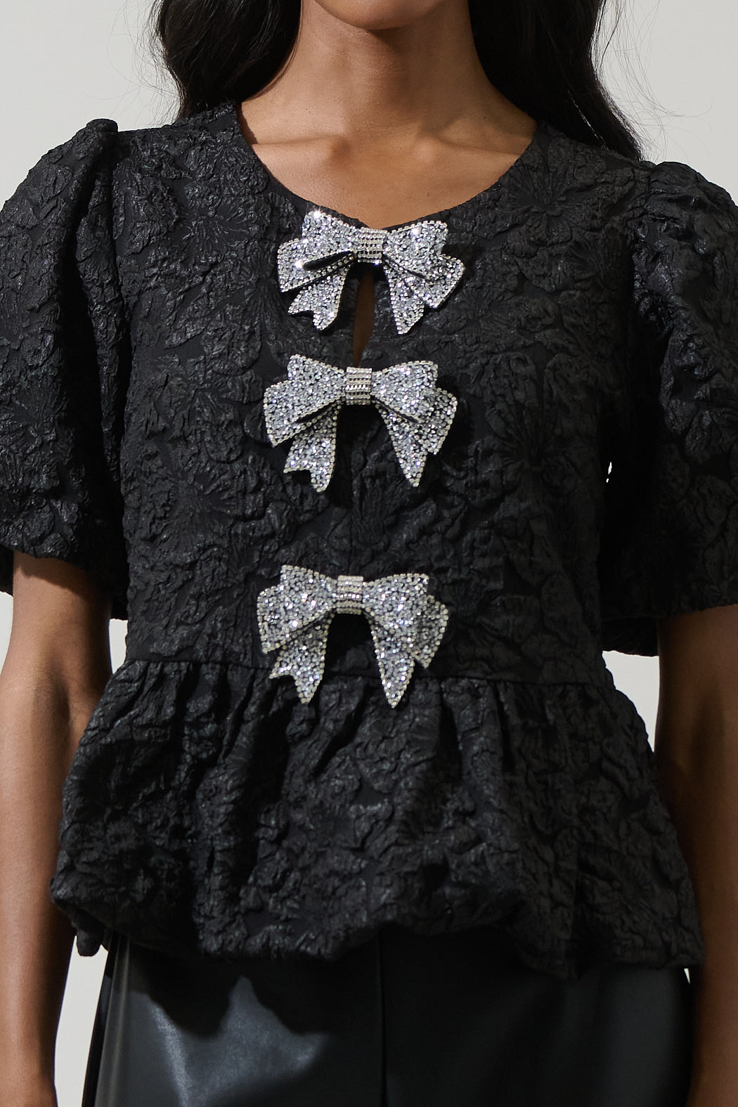 All eyes on you in this unforgettable top. Designed in textured jacquard, it features three sparkling rhinestone bows down the front, voluminous bubble sleeves, and comes in two rich hues. Classic black and burgundy. Pair it with high-waisted trousers and a mini bag for a glam night-out look.