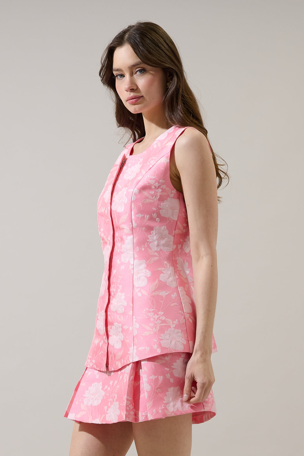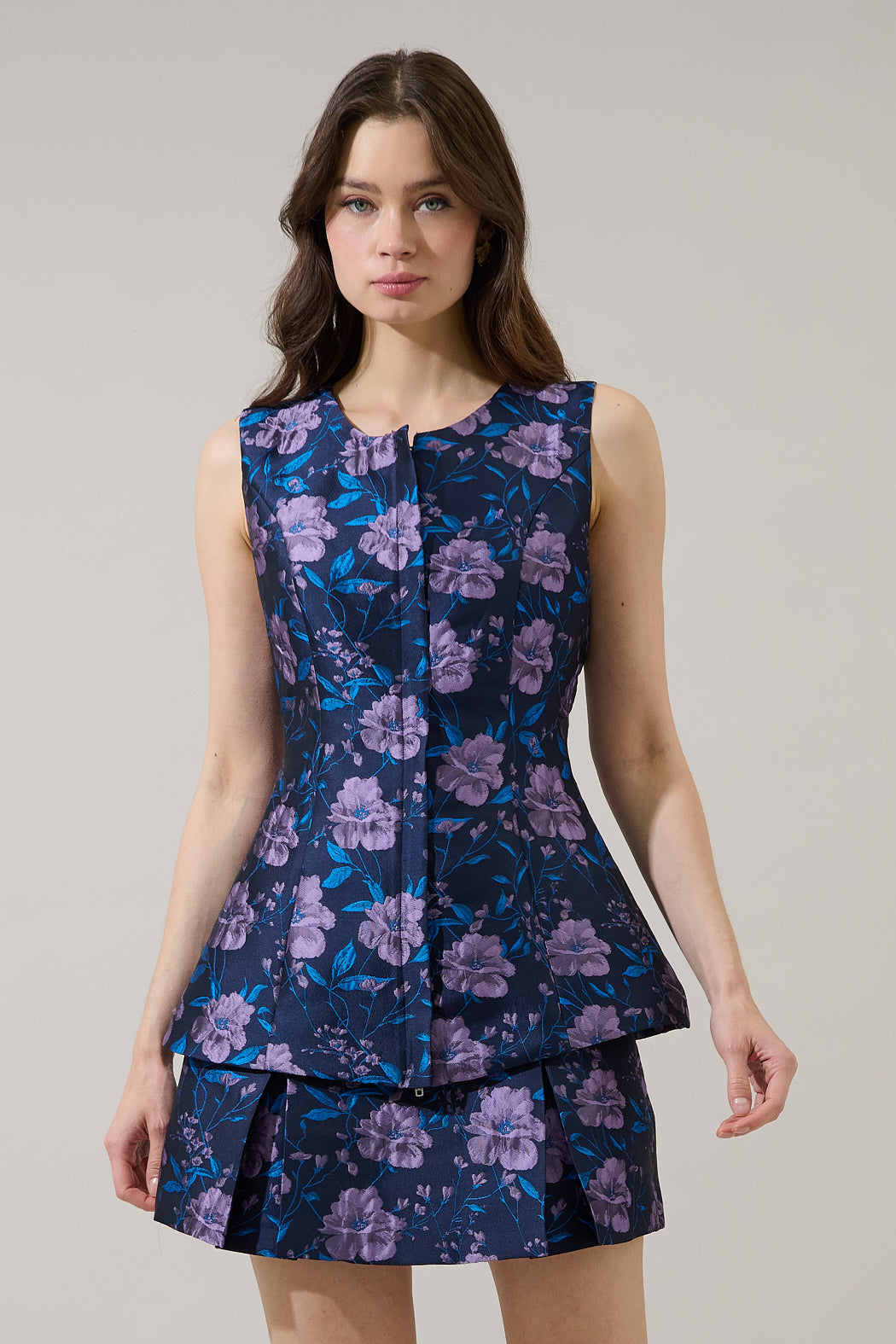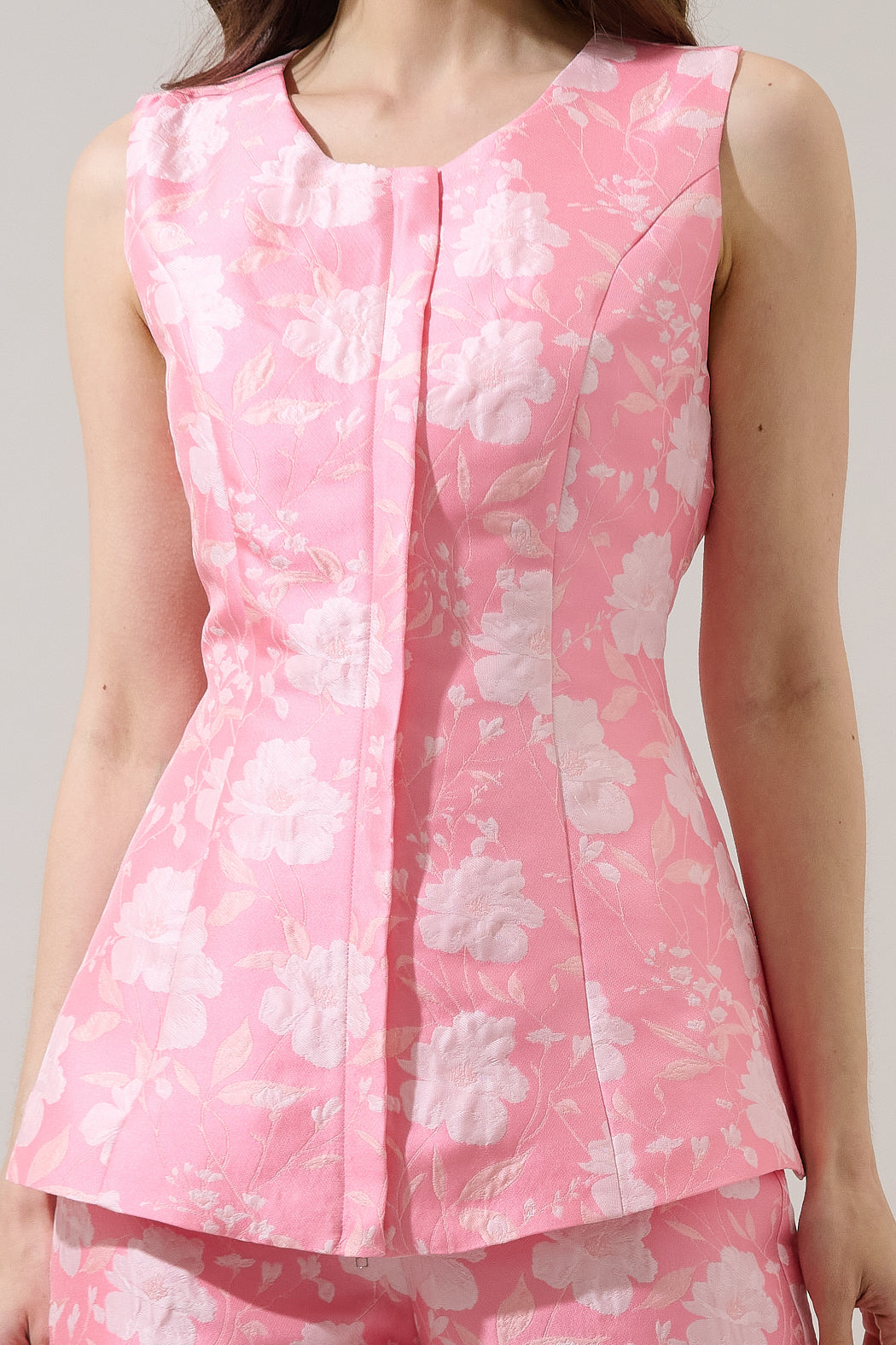 More than a print, it's a tapestry. Darling multi florals feature a sleeveless look with a round neck. It has a fitted look with an invisible zipper front. Comes in two color variations. Pair it with the matching bottoms and heels for a complete, polished look.