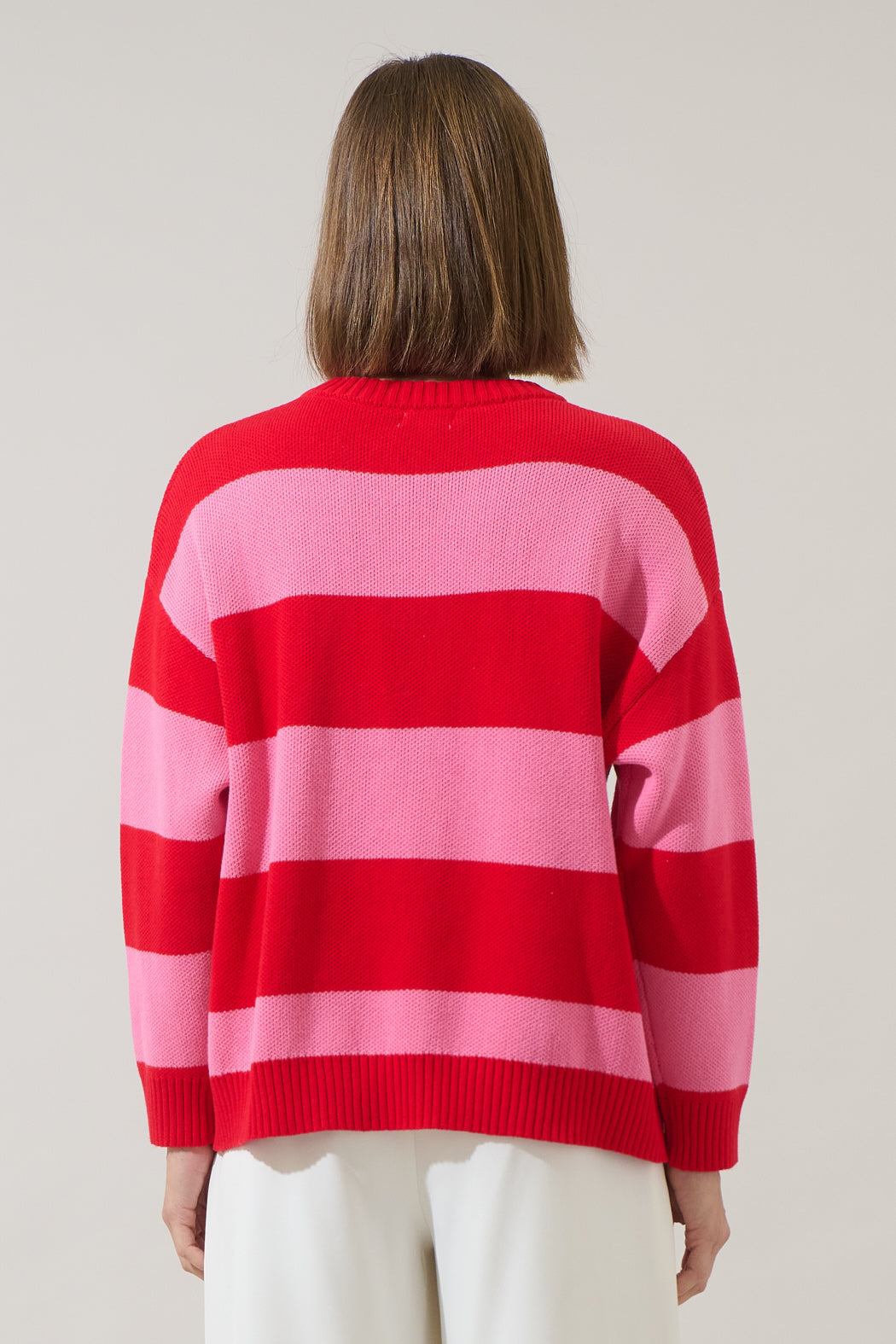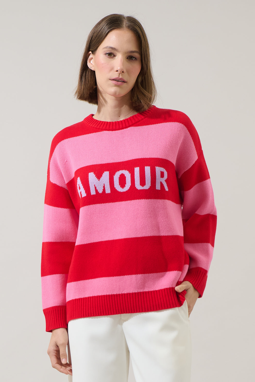 Unleash your inner fashionista with a sweater that adds a pop of personality to any outfit! With large "Amour" lettering, a bold red and pink striped color block pattern, and ribbed details, this piece is made to stand out. Pair it with denim shorts and sneakers for a casual look, or tuck it into a skirt with ankle boots for a chic, playful vibe.