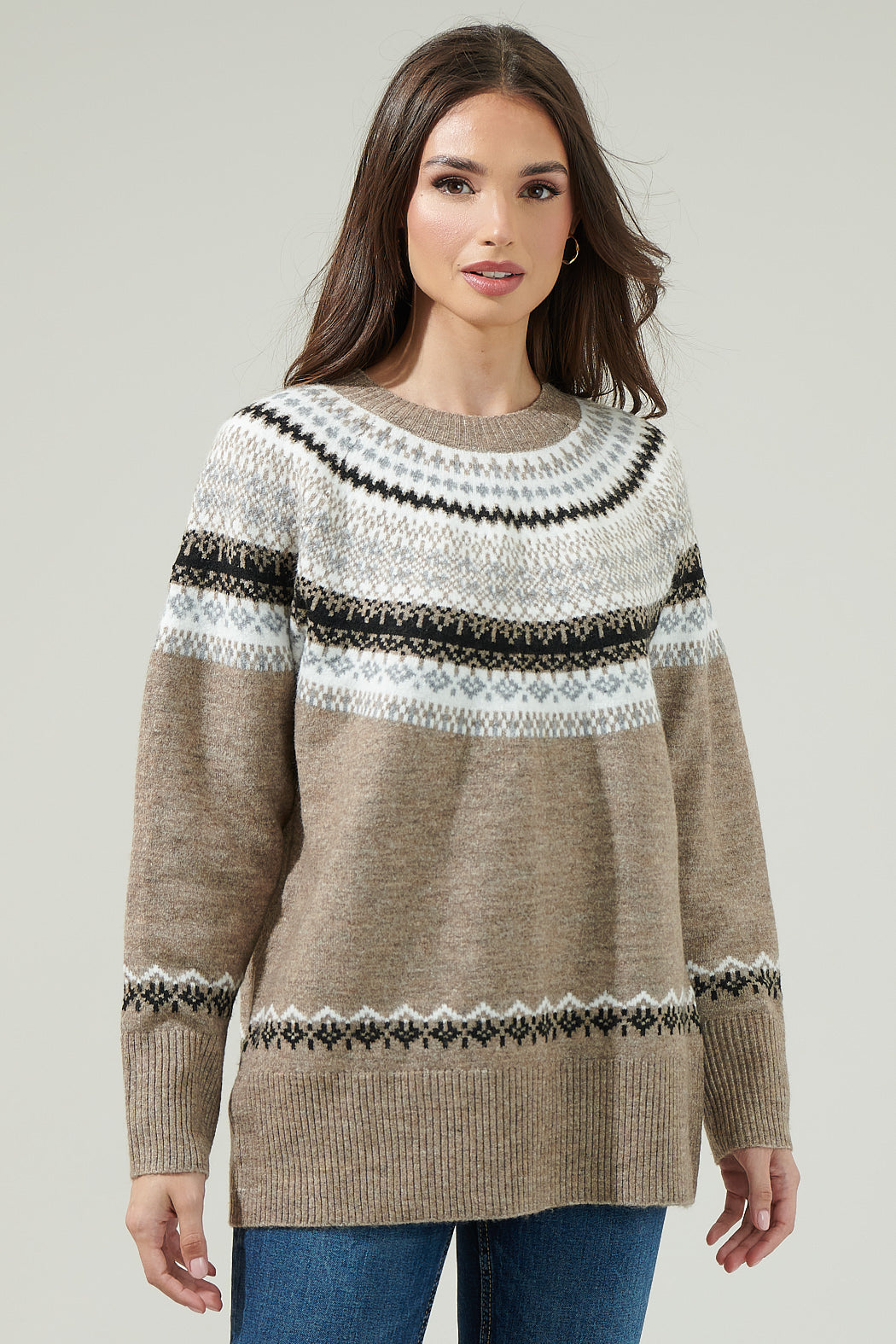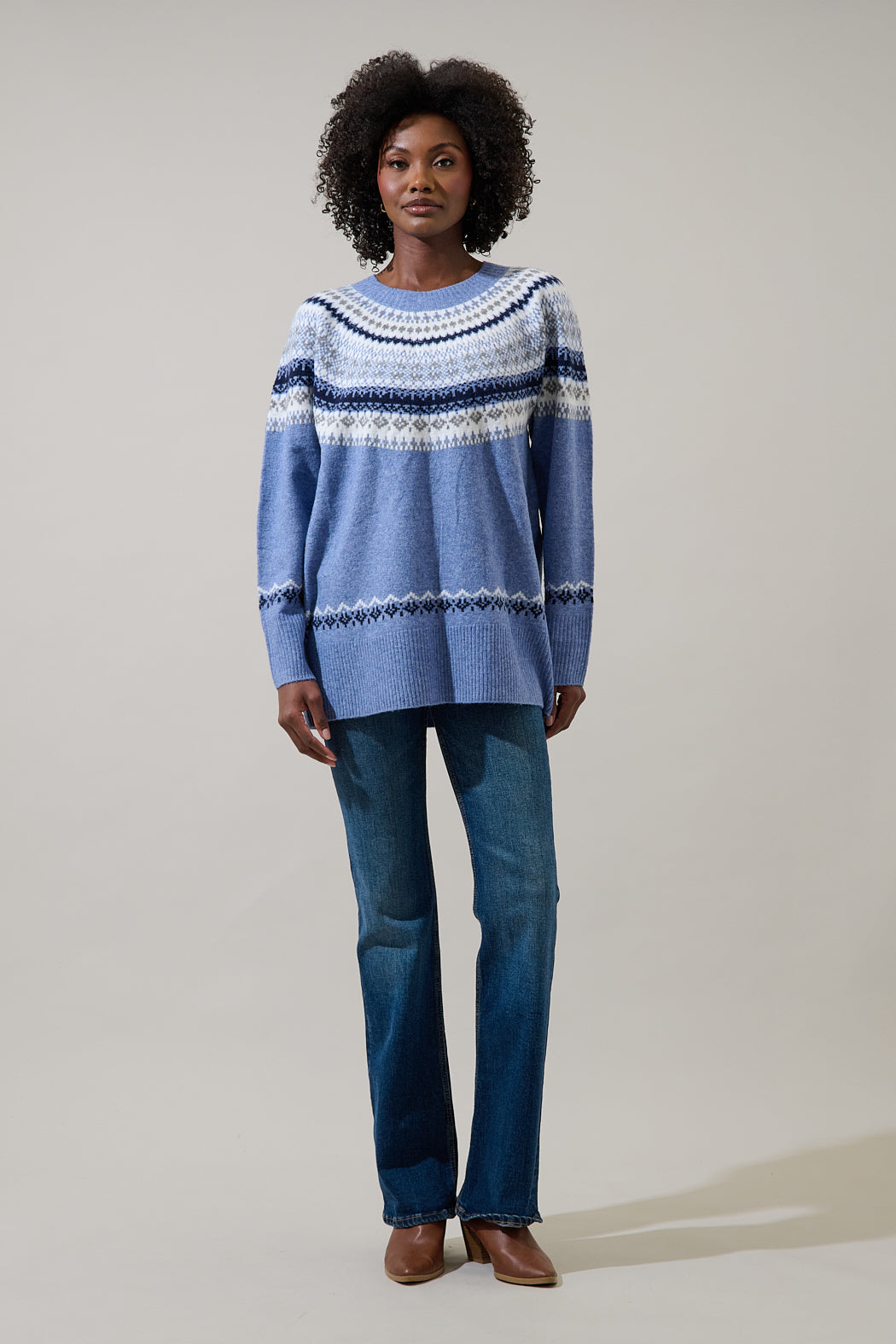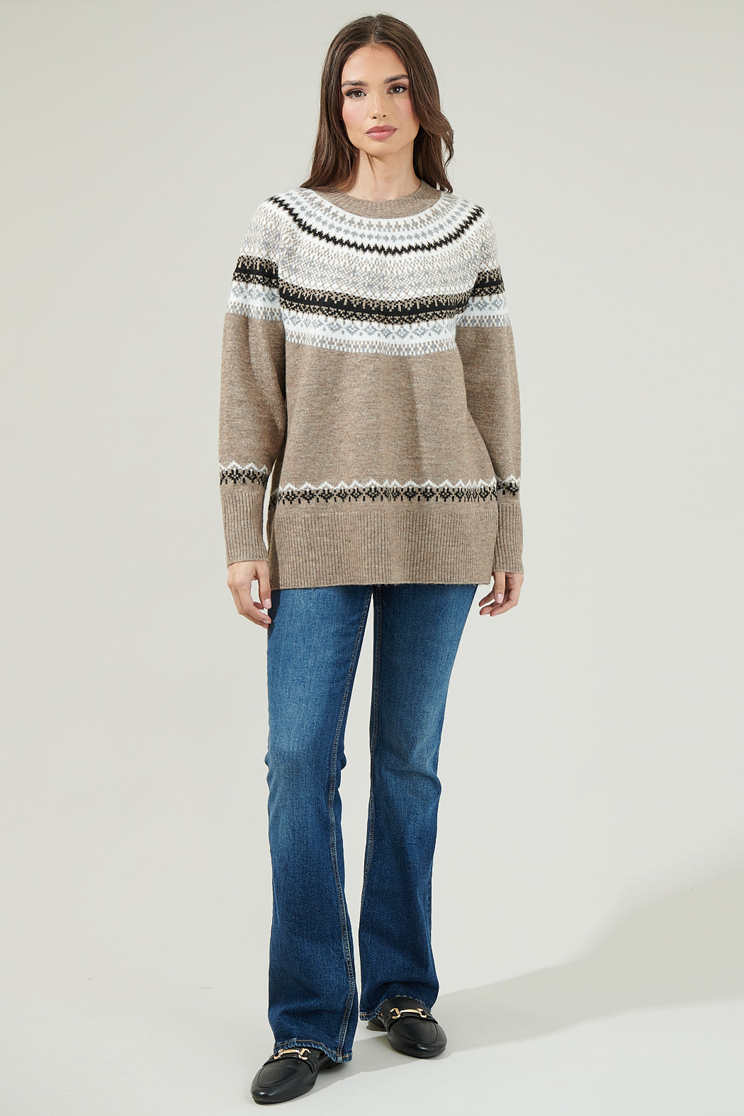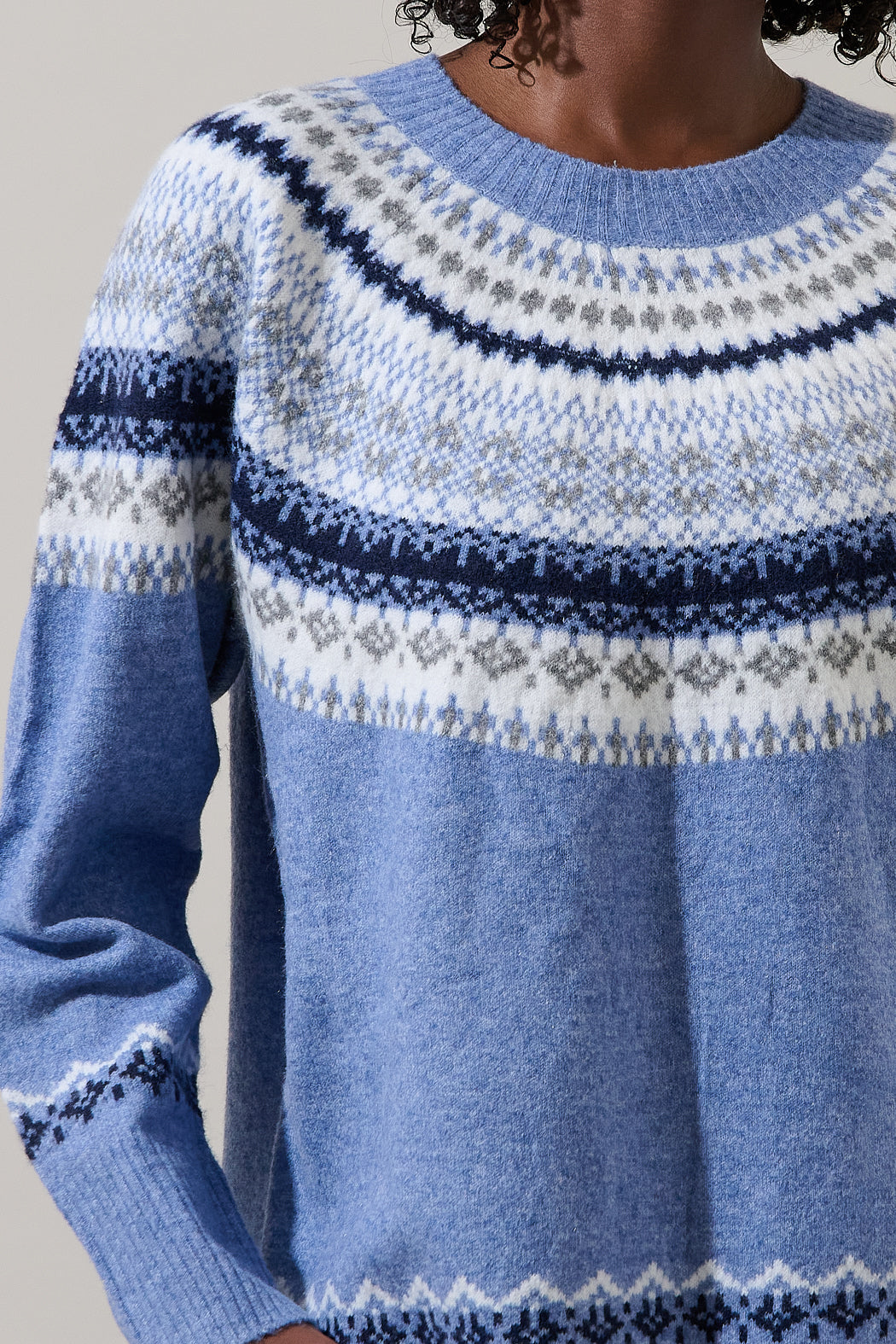 Comfy meets stylish in the McNeal Fair Isle Crewneck Sweater. A horizontal unique design lays on this ribbed knit sweater shapes crew neck neckline that tops long, balloon drop sleeves. It maintains a relaxed fit and can be styled tucked into bottoms of your choice.