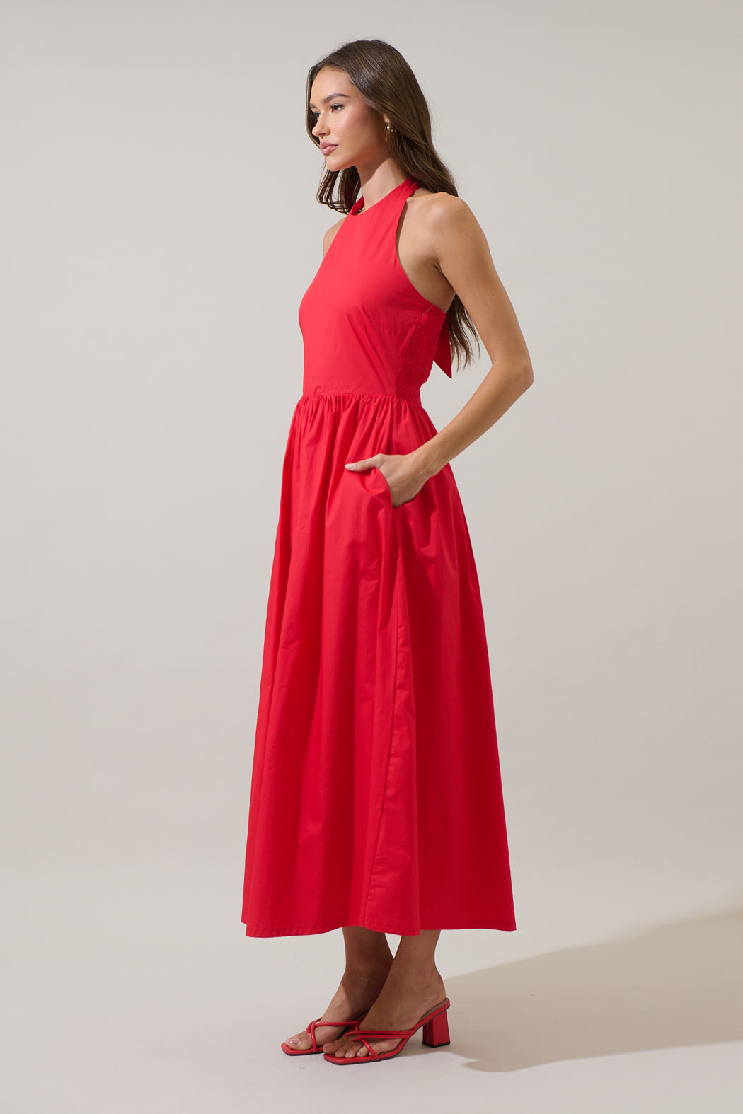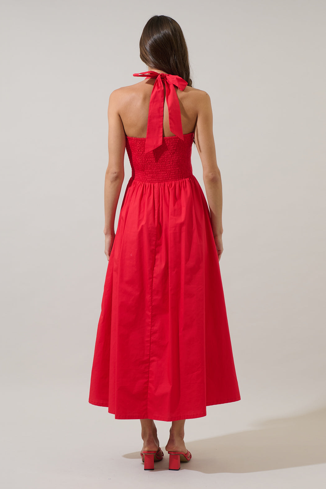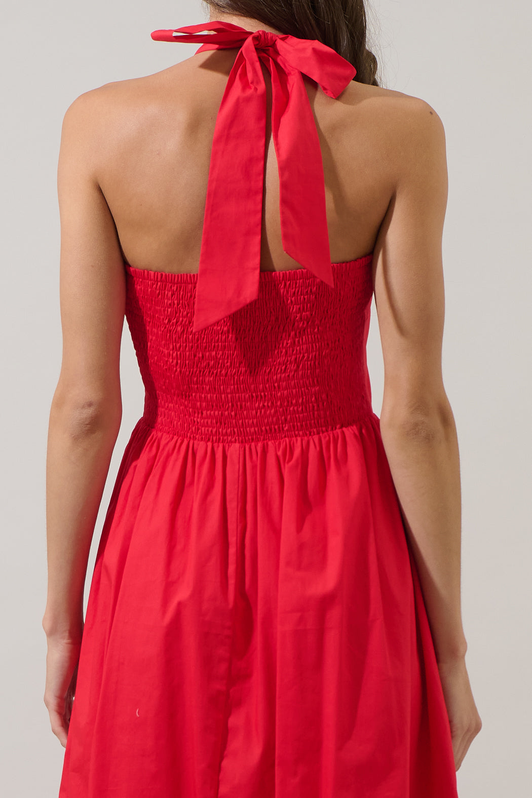 Enjoy the beauty of the Daine Halter Neck Midi Dress. It comes in the perfect red color with a halter neck, smocked back, pockets and flowy midi skirt. Finish the look with red or black heels and a matching handbag.