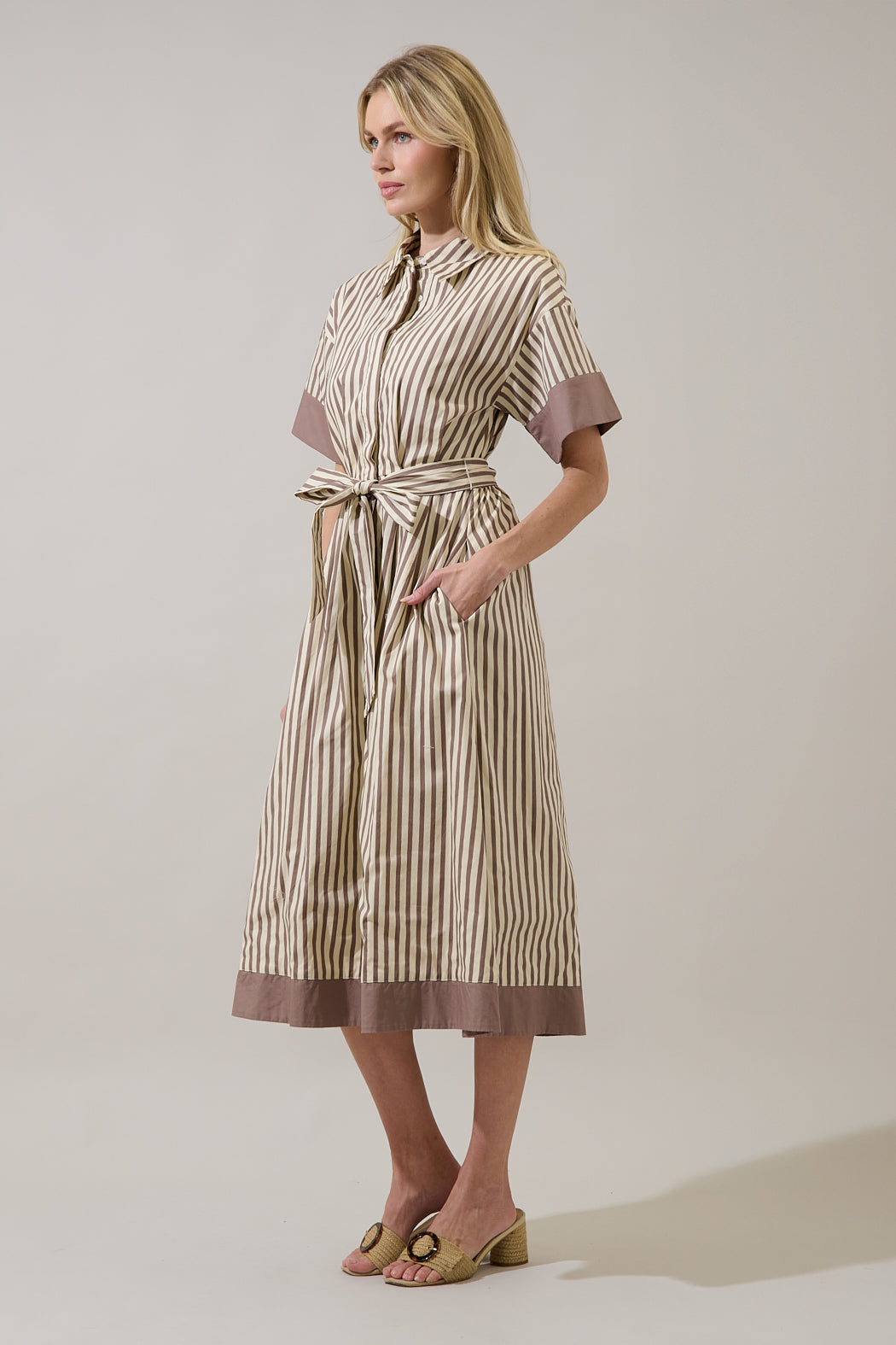 Classic stripes meet effortless charm in this must have midi dress. Featuring a button front design, soft contrast trim, and a waist-defining tie belt. Easy to pair with brown heels.