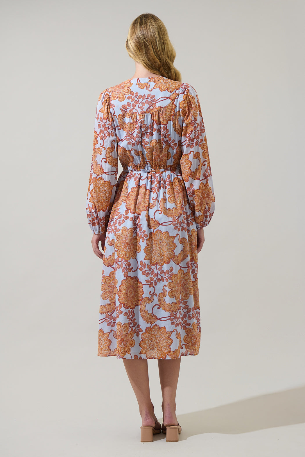 Own the season with confidence in a look that feels timeless and refined. This elegant midi dress combines a split neckline, balloon sleeves, waist tie, button down design, and a fall inspired floral motif. Pair it with ankle boots and a shoulder bag for an effortless fall look.